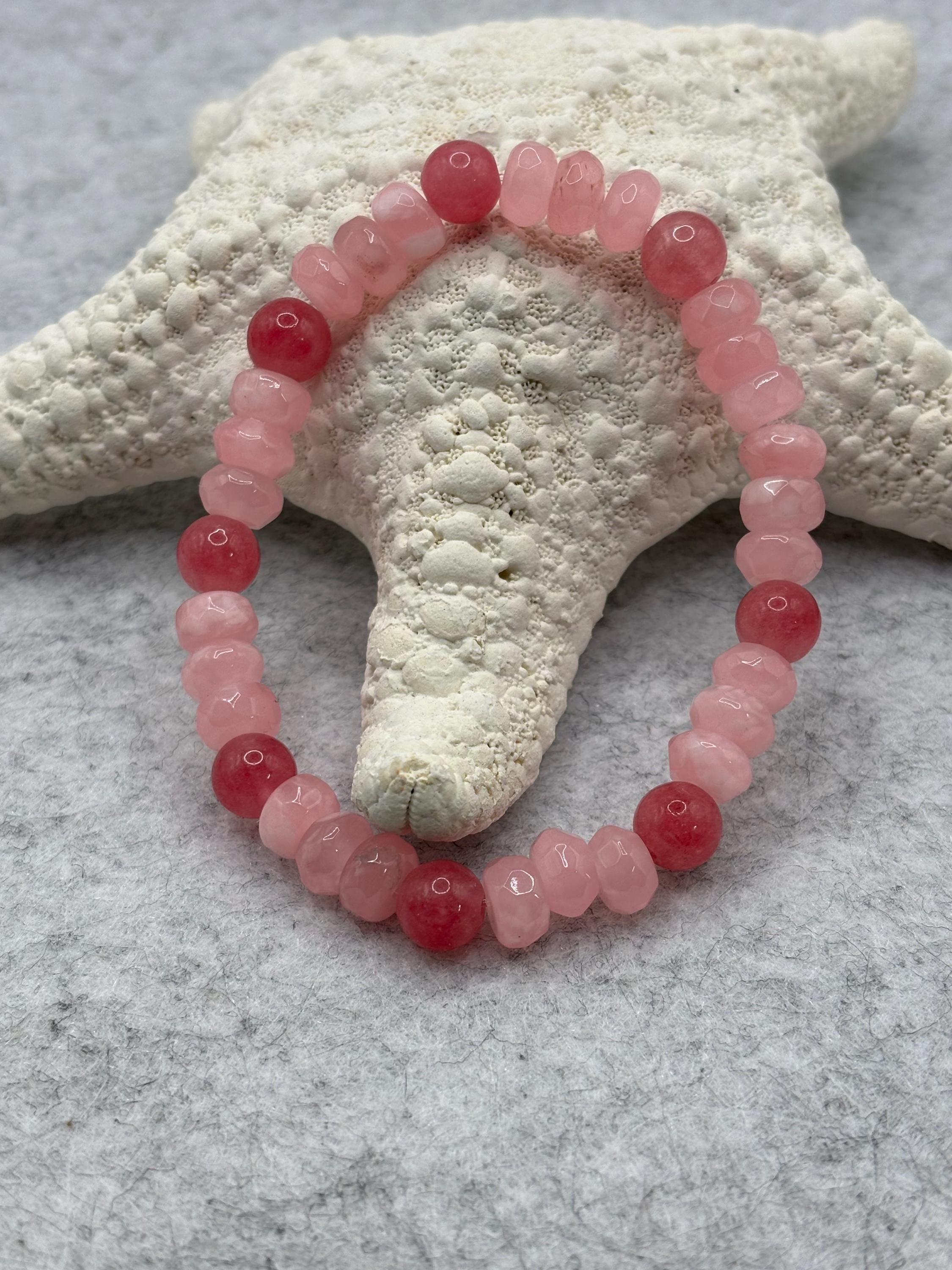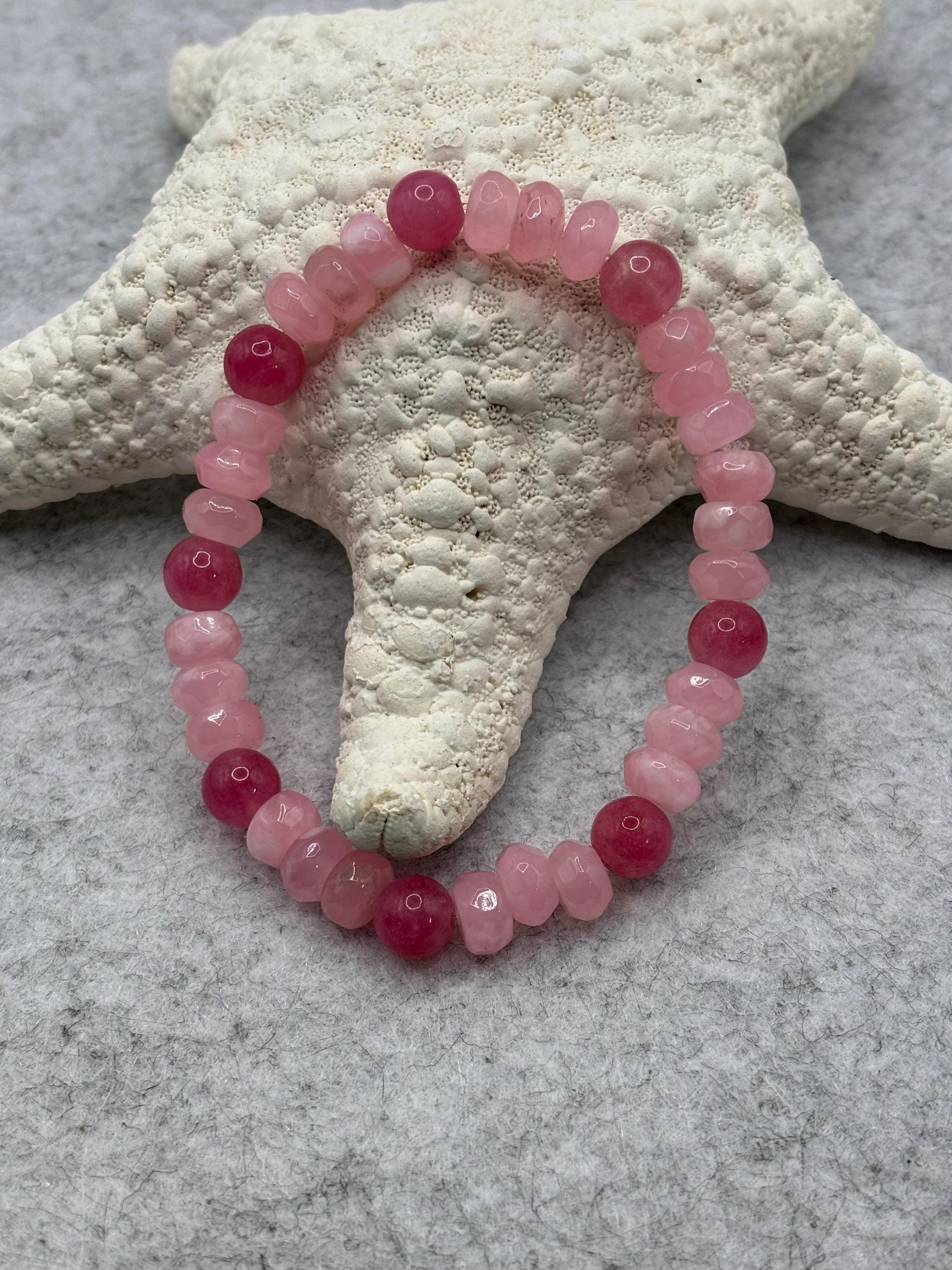 This pretty pink gemstone bracelet has pink quartz rondelles and pink jade. Pretty in Pink !