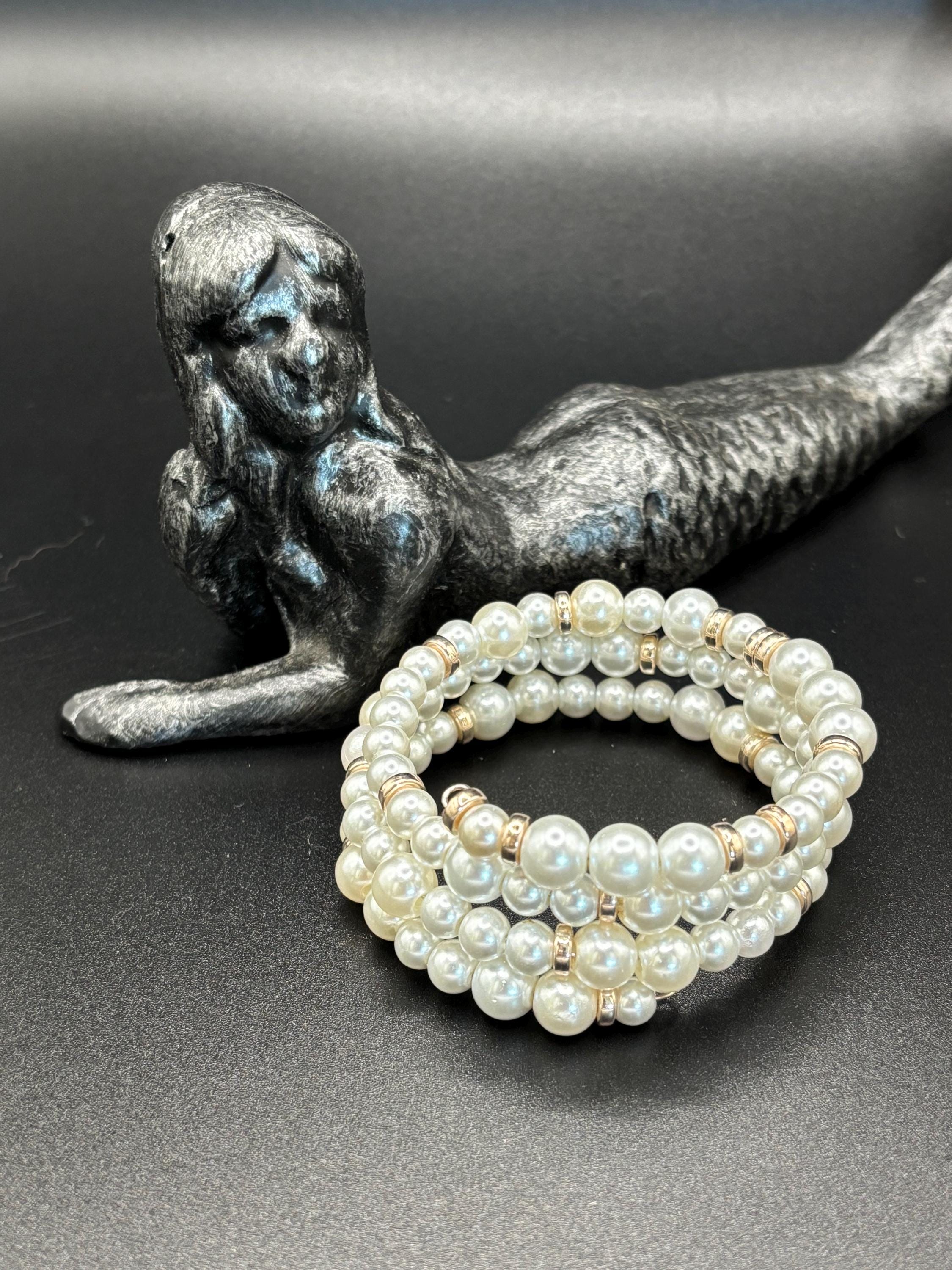 Add a touch of sophistication to your style with our elegant memory wire multistrand bracelet, made with Pearl gemstones and rose gold accent metal beads.