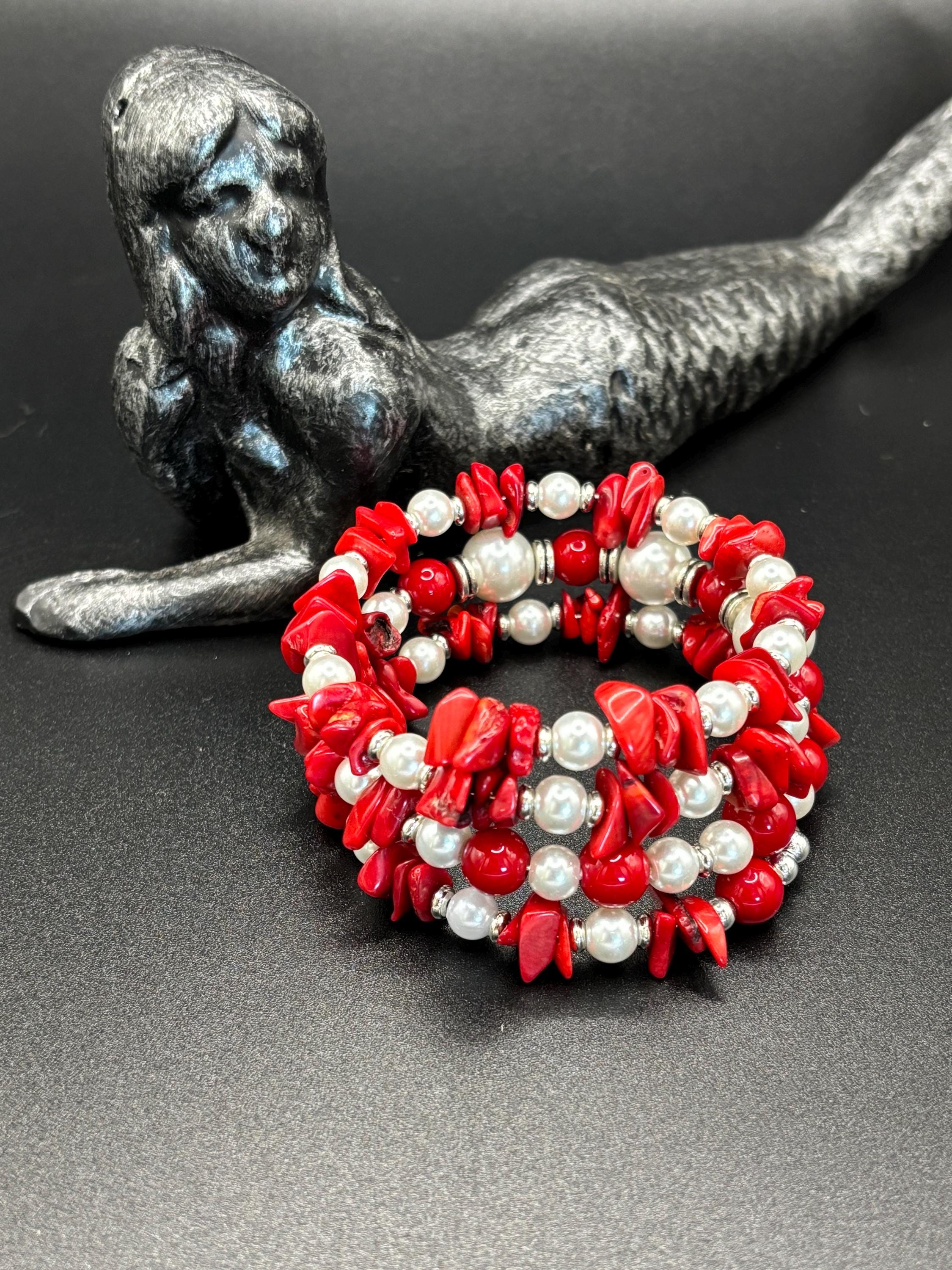 Add a touch of sophistication to your style with our elegant memory wire multistrand bracelet, made with Red Coral gemstones and silver accent metal beads.