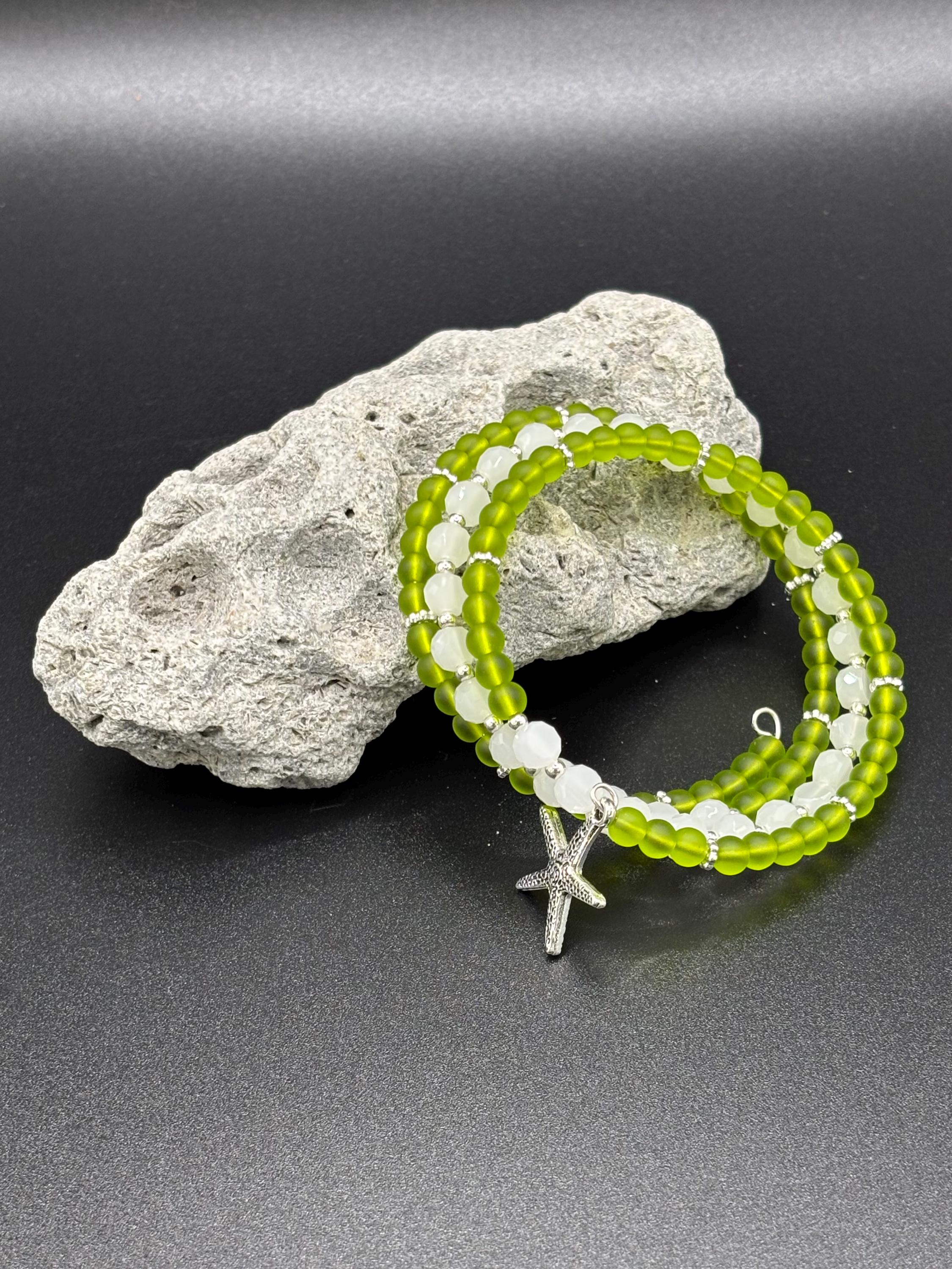 This beautiful Memory Wire Seaglass bracelet is made with Olive Green Seaglass . There are different listings with the options I have available. This one has Olive green Seaglass with coin shaped crystals and a starfish charm.