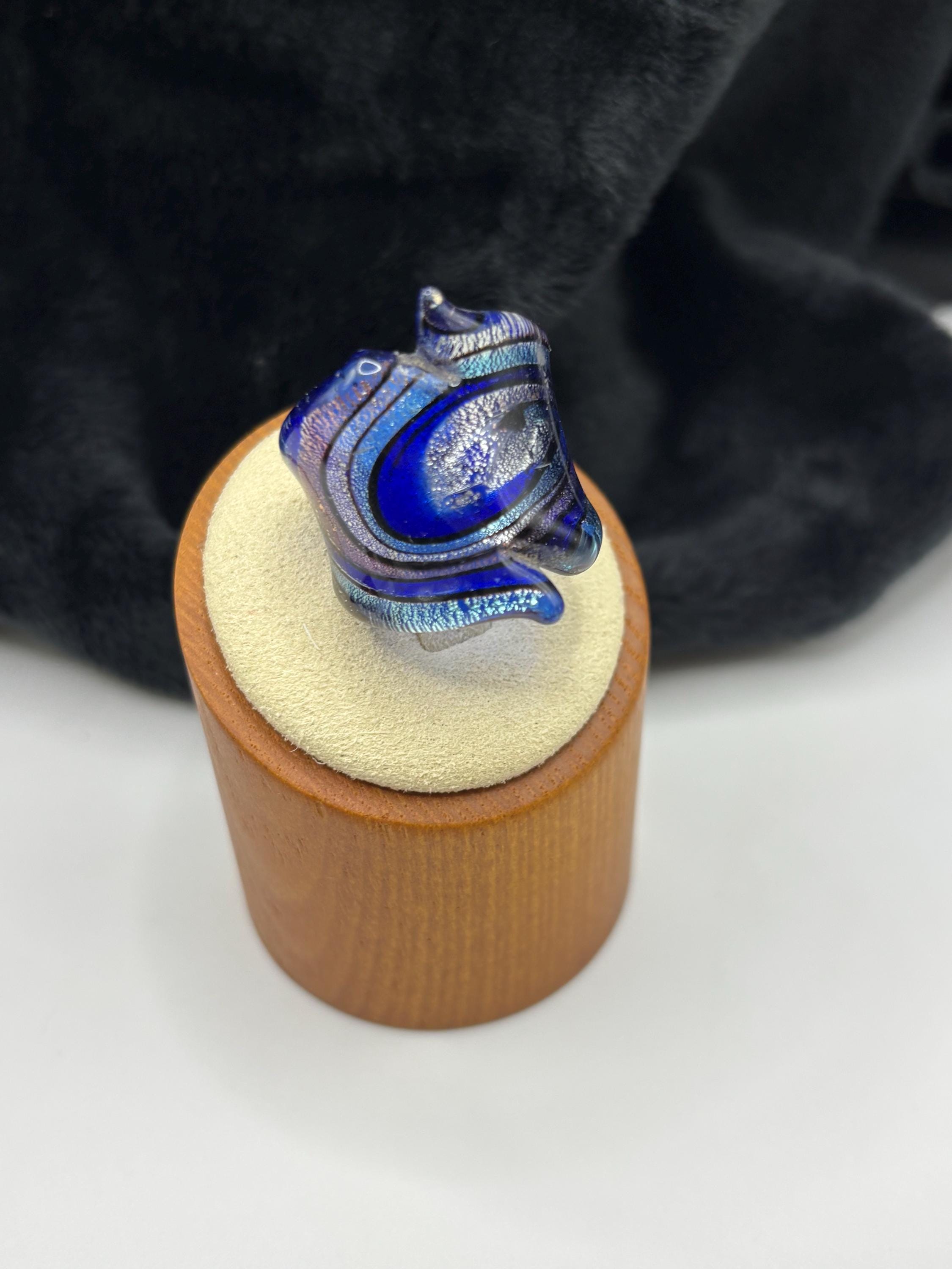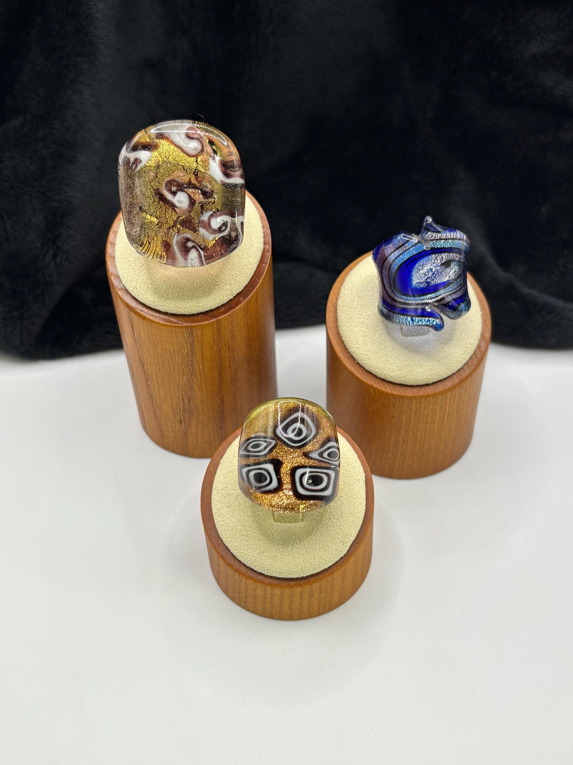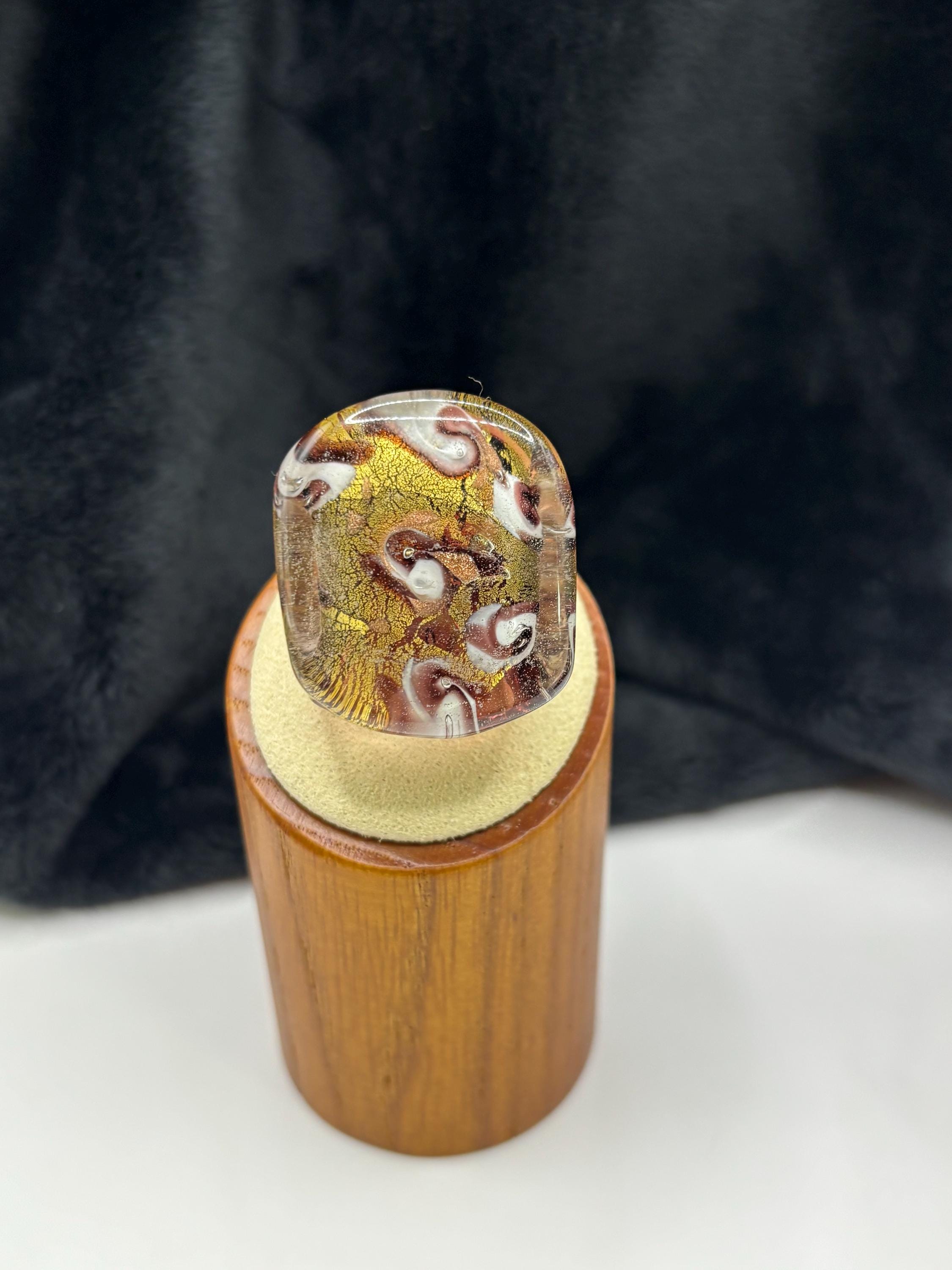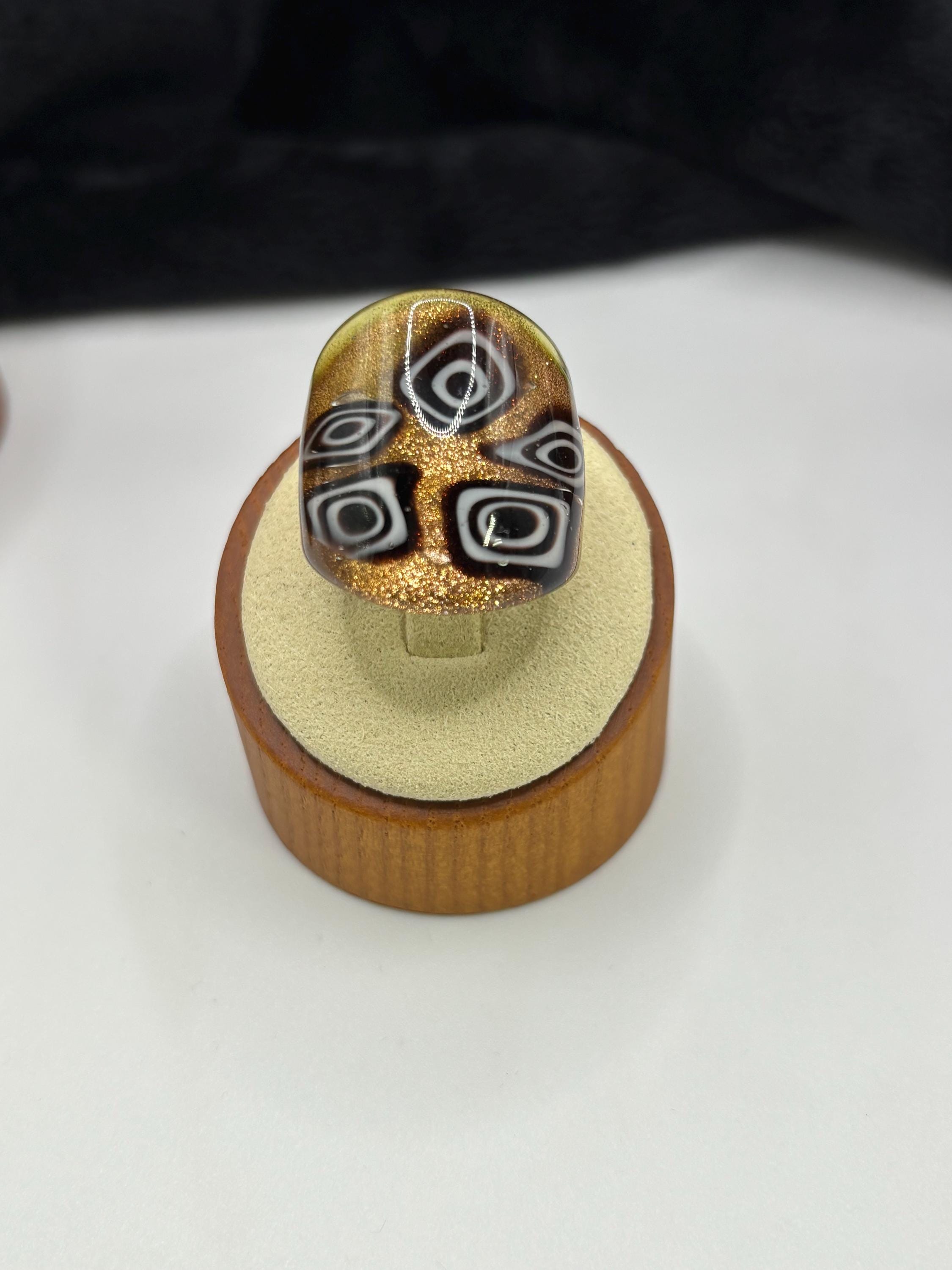 This is a Millefiori glass ring and has geometric designs in rich brown and white on a gold/copper colored base.