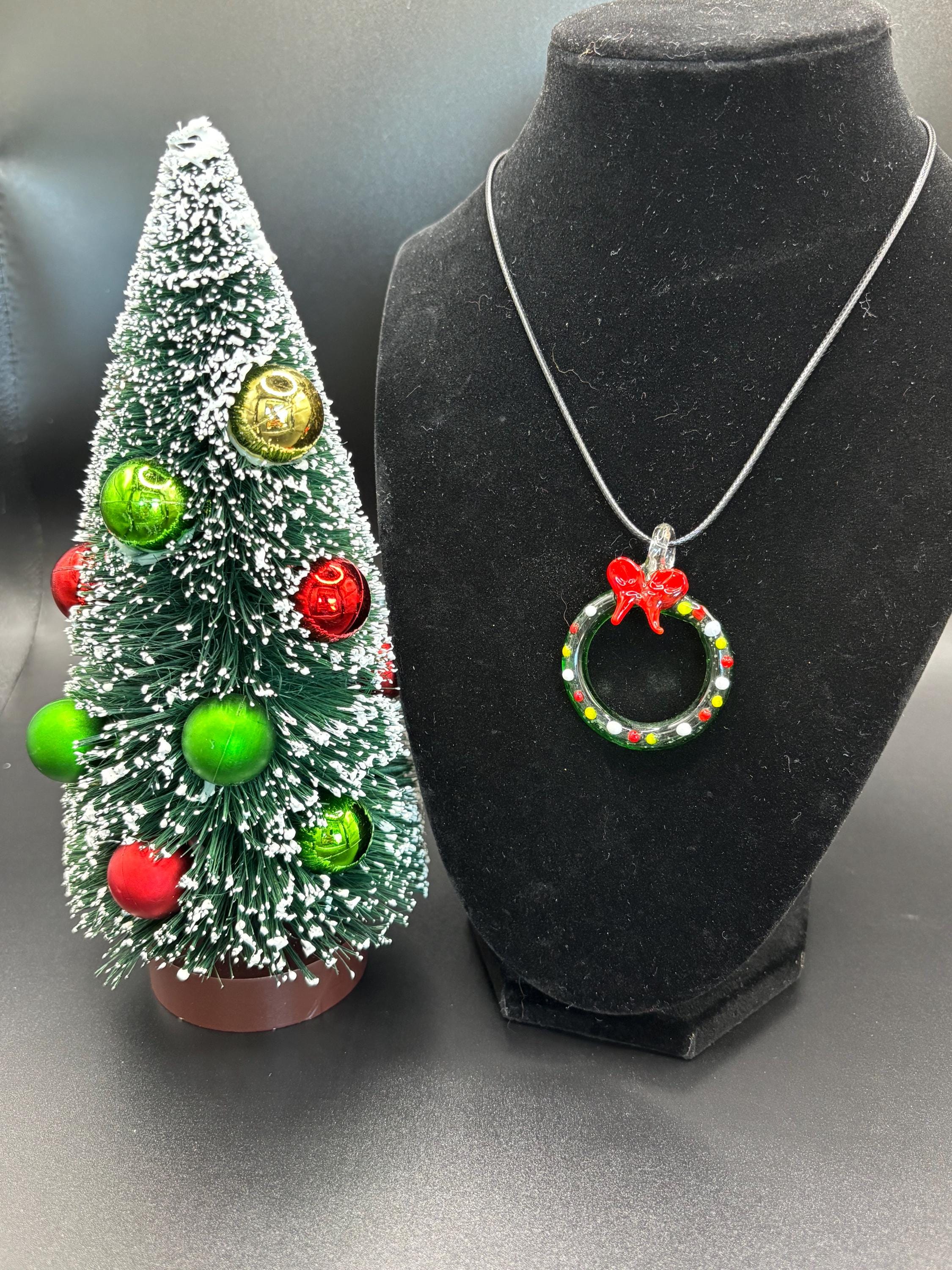 This is a Glass Lampwork Wreath pendant necklace, Murano inspired with Christmas vibes and Holiday colors.