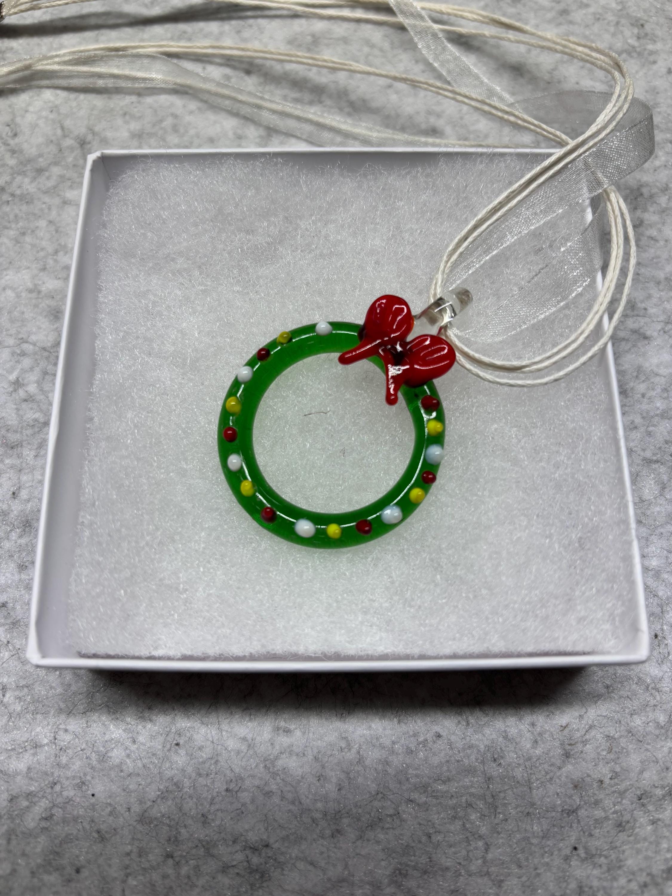 This is a Glass Lampwork Wreath pendant necklace, Murano inspired with Christmas vibes and Holiday colors.