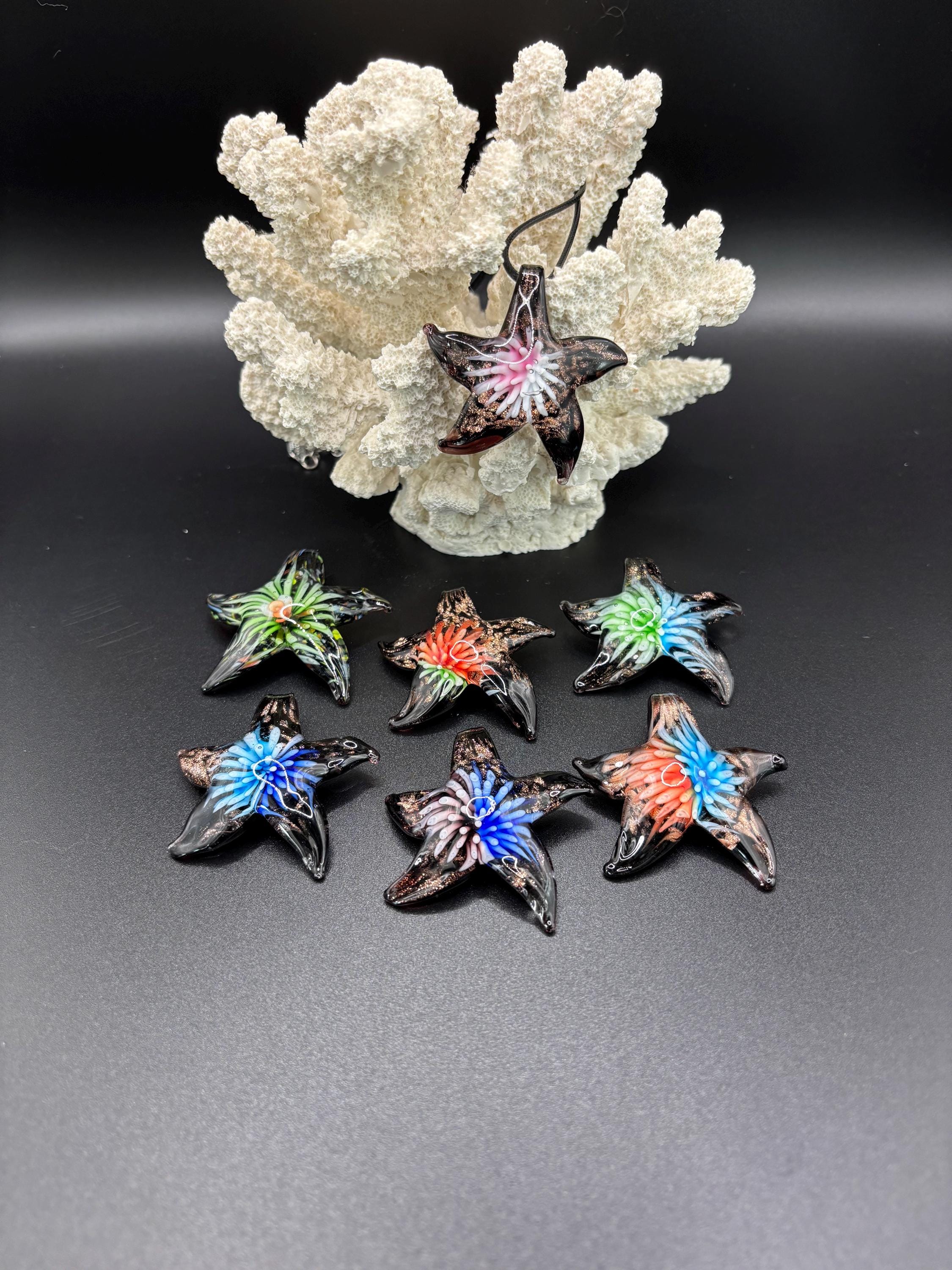 These necklaces are a Murano inspired glass flower starfish and are in an assortment of dual colors with a black background.