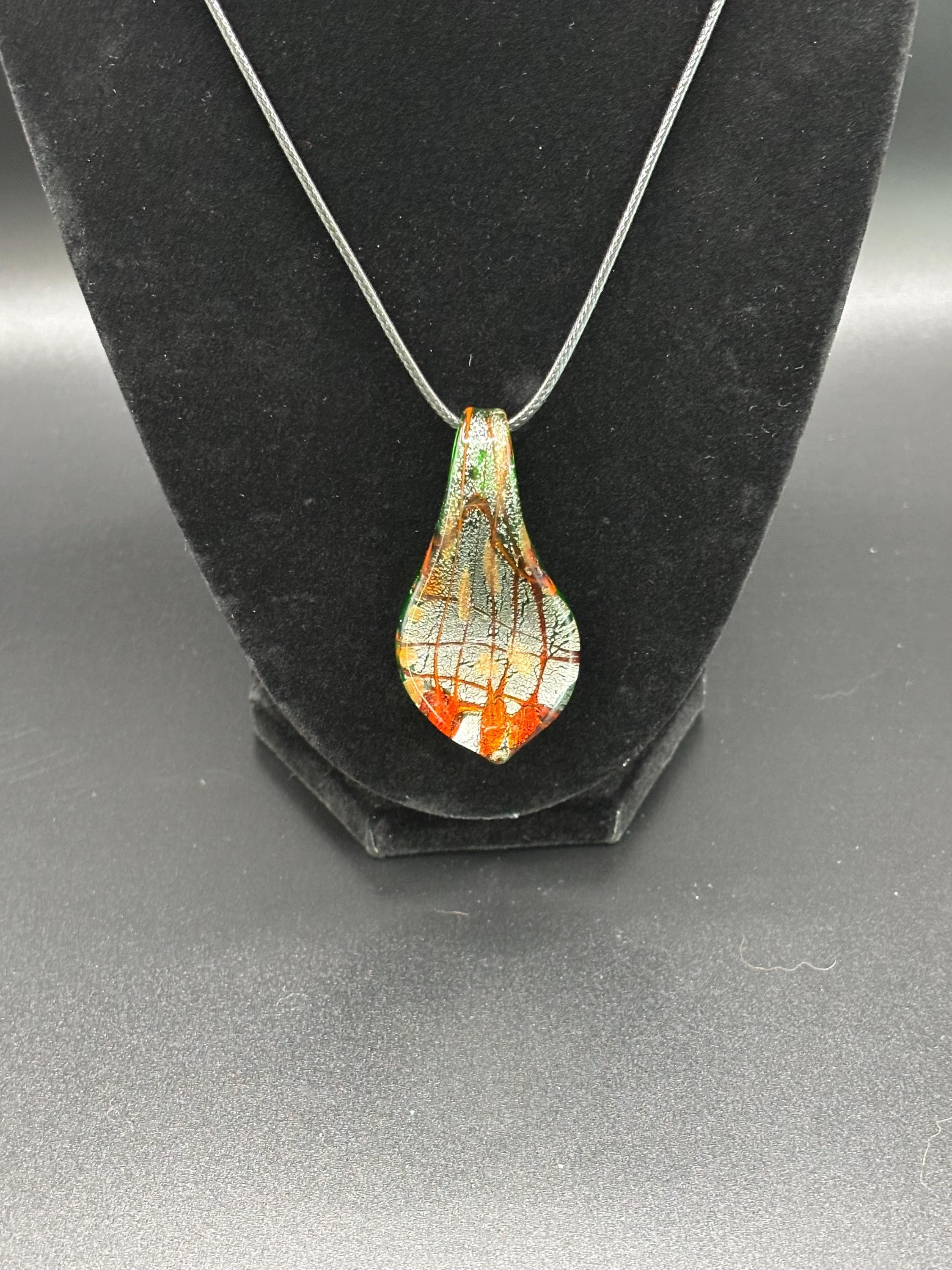This is a Glass Lampwork leaf necklace pendant. This Murano inspired glass has copper colored swirls on a green background.