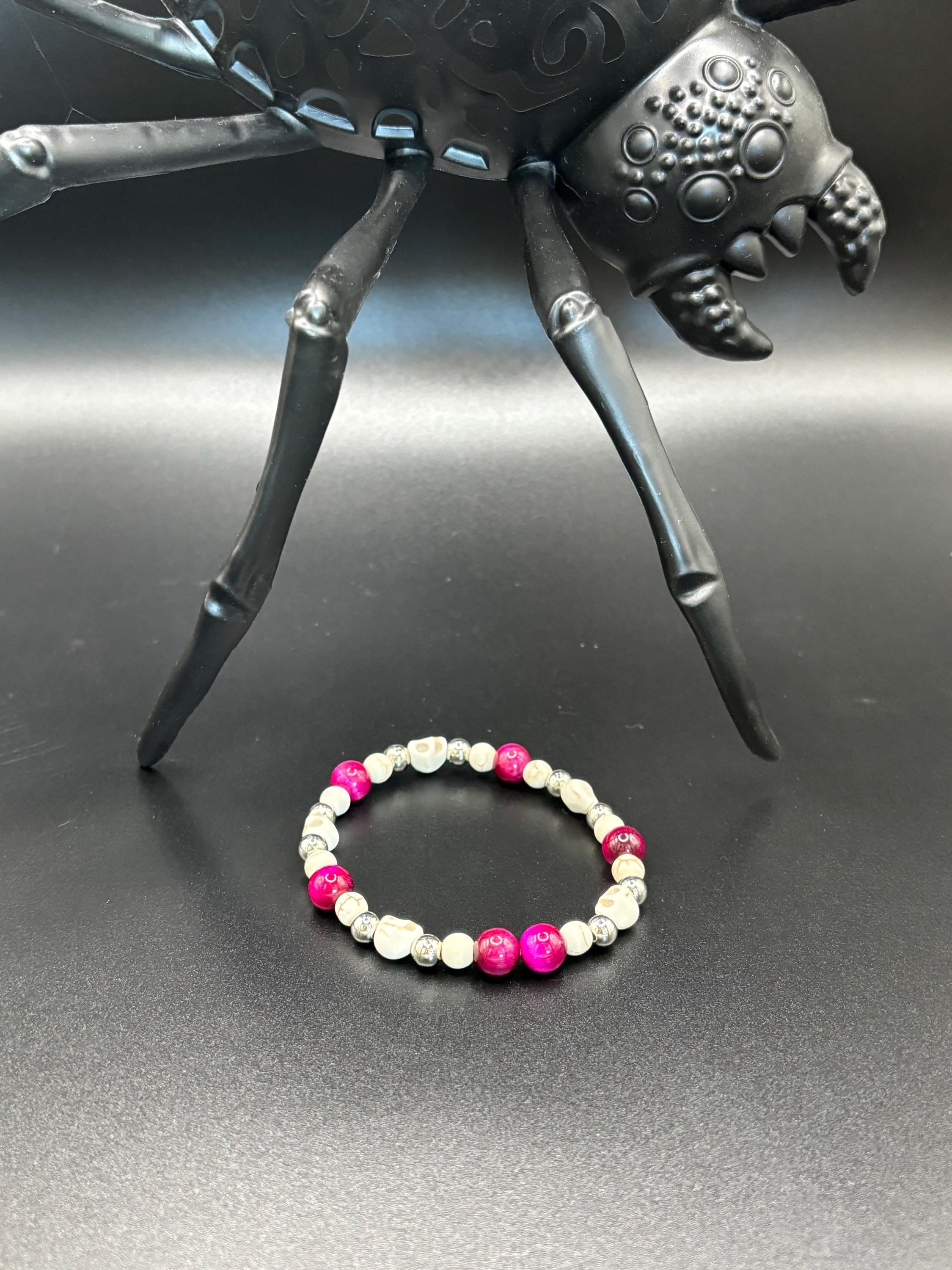 Pink Tiger eye gemstone bracelet with white howlite skulls. Going with the trend for Halloween with Pink! As they say, Pinkoween.