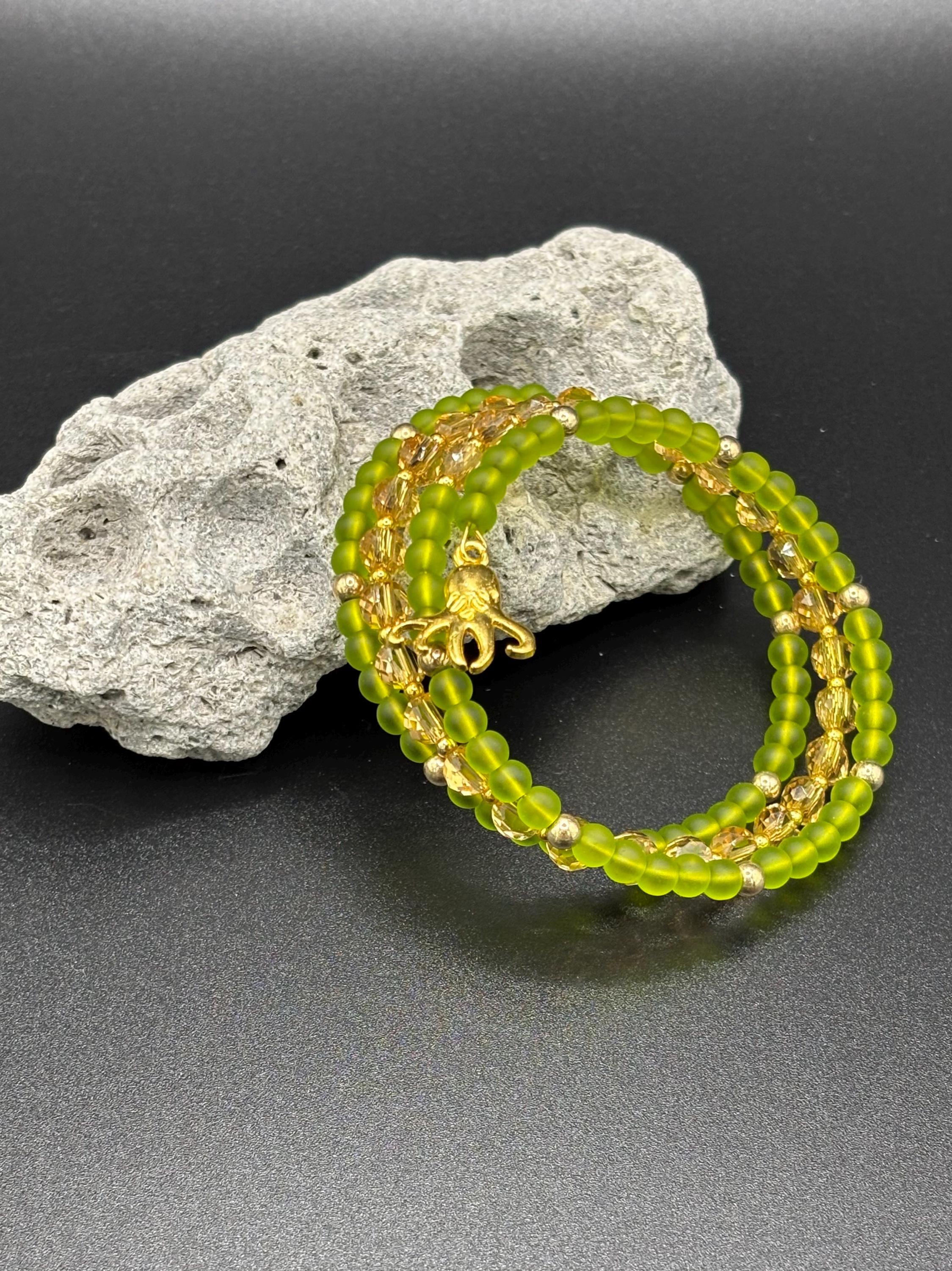 This beautiful Memory Wire Seaglass bracelet is made with Olive Green Seaglass . There are different listings with the options I have available. This one has Olive green Seaglass with coin shaped Topaz crystals and an Octopus charm.
