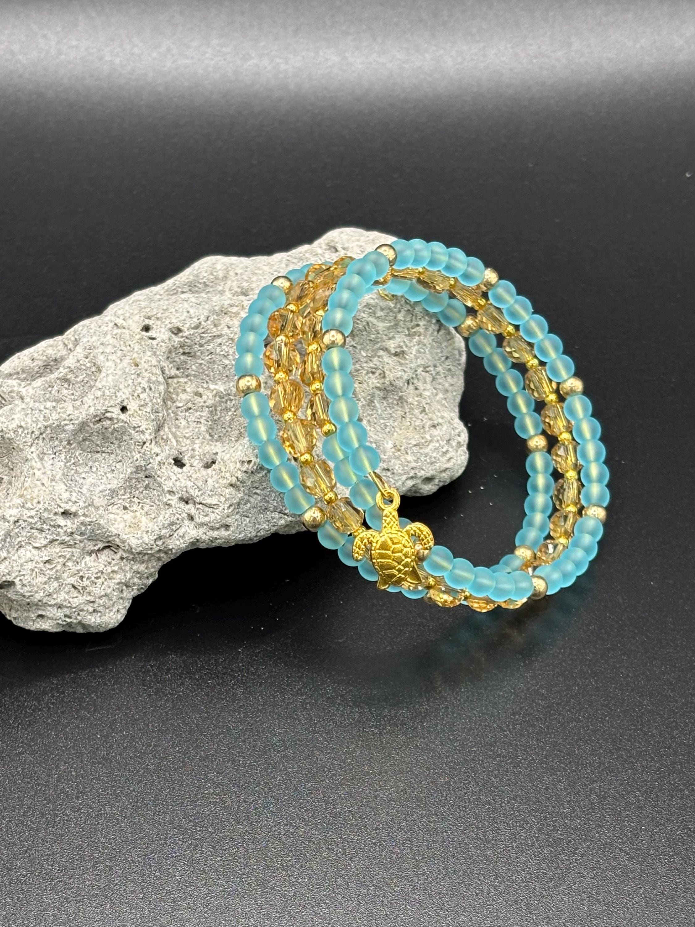 This beautiful Memory Wire Seaglass bracelet is made with Turquoise blue Seaglass . There are different listings with the options I have available. This one has Blue Seaglass with coin shaped Topaz crystals and a turtle charm.