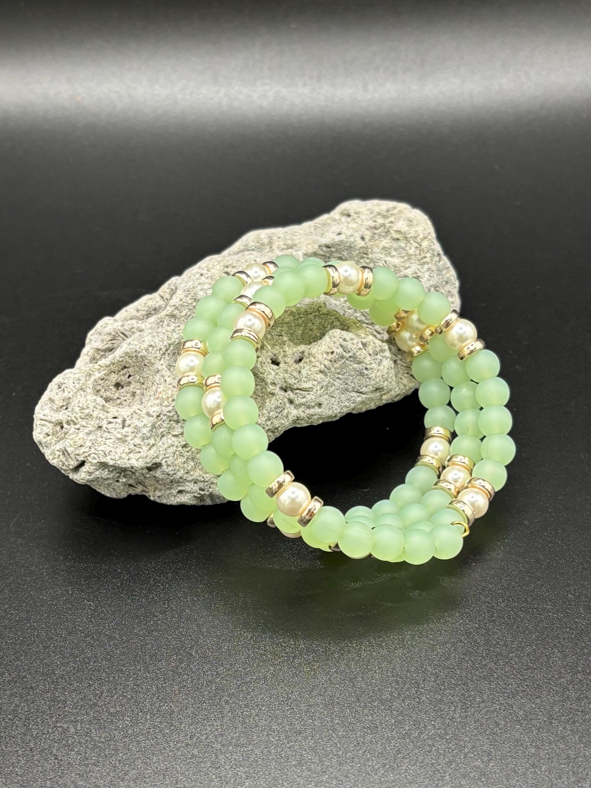 This beautiful Memory Wire Seaglass bracelet is made with sea foam green Seaglass. The seaglass makes up most of the bracelet and is accented with pearls and rose gold small findings.