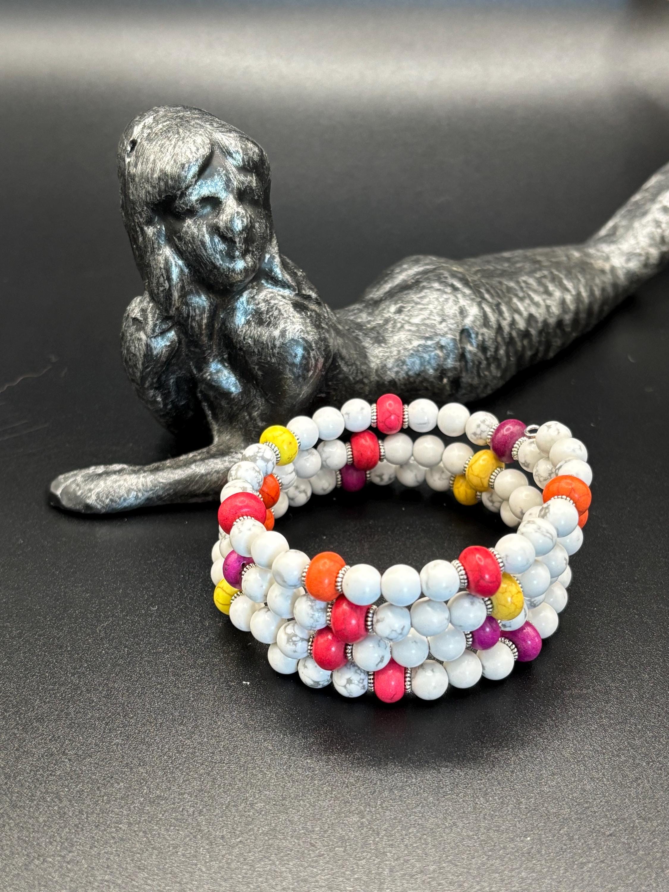 Add a touch of sophistication to your style with our elegant memory wire multistrand bracelet, made with White Turquoise Howlite gemstones and silver accent metal beads.