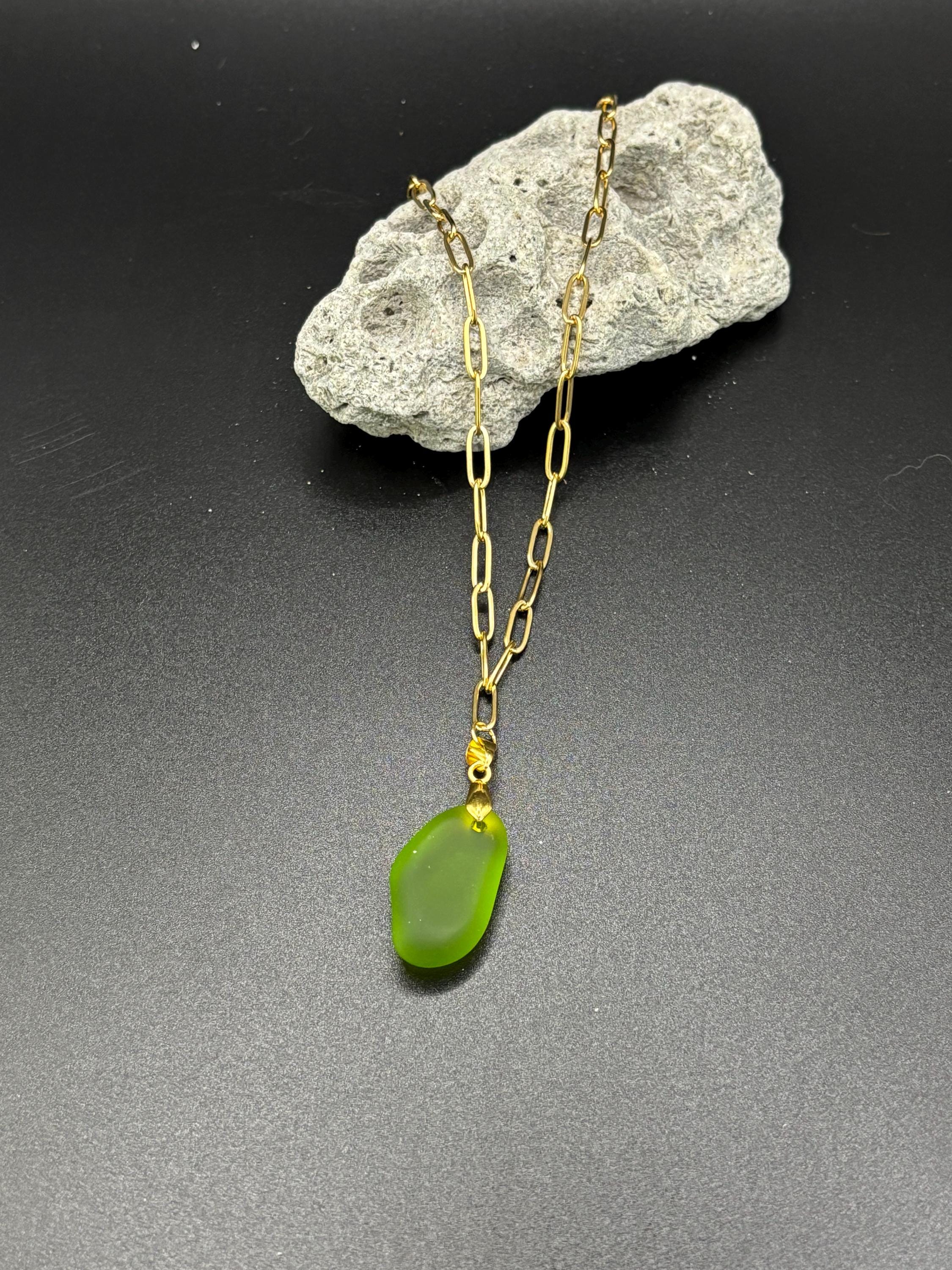 This pretty Seaglass necklace is made with a green Seaglass pendant. The necklace chain is the gold paper clip style that is trending right now!