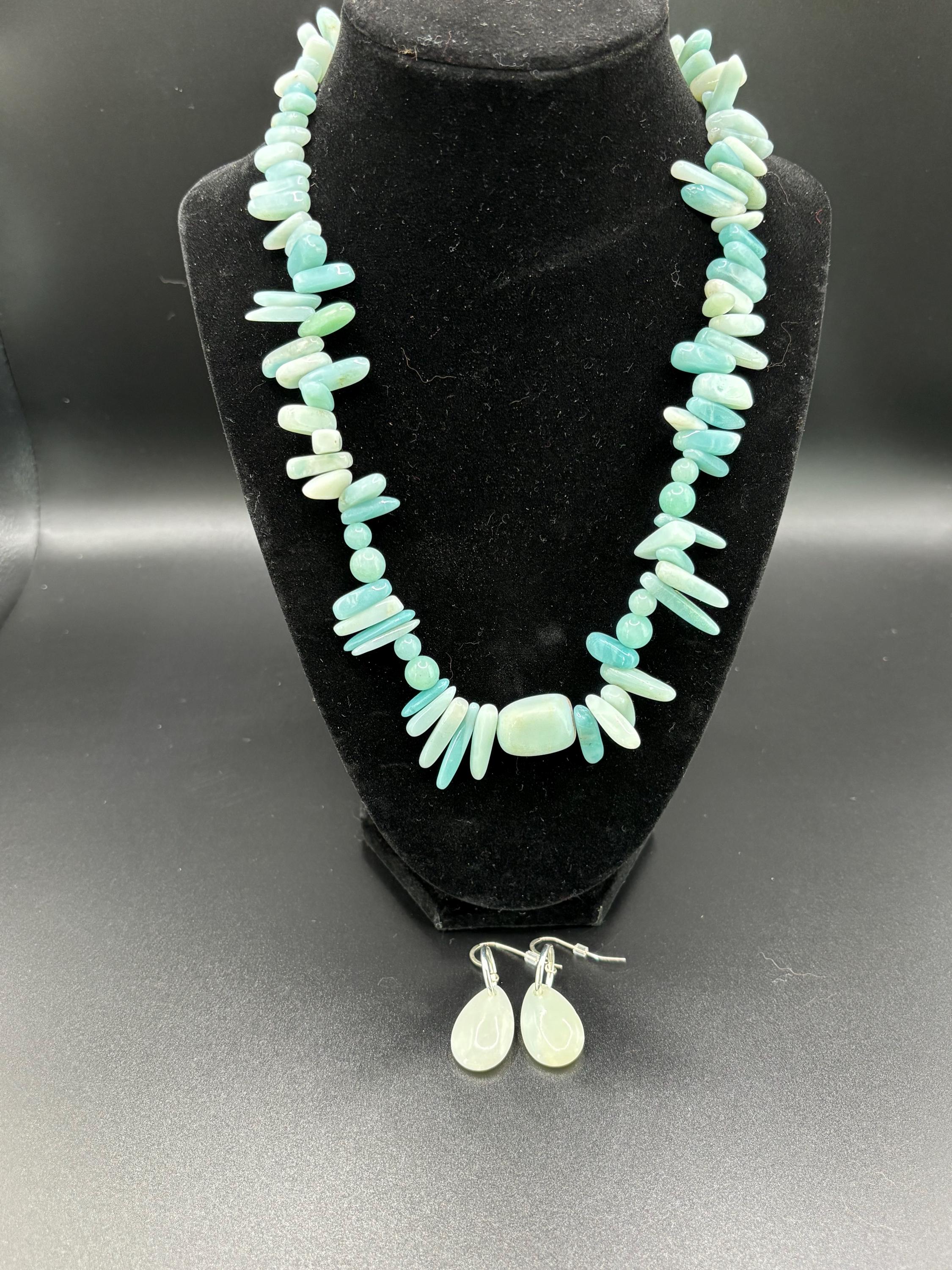 This is a definite statement necklace! It is made with Amazonite gemstones in alll shapes and sizes. The necklace weighs 3 ounces so it isnt as heavy considering all the gemstones. It makes its statement. Would look great with a white collared shirt and jeans or your favorite LBD.
