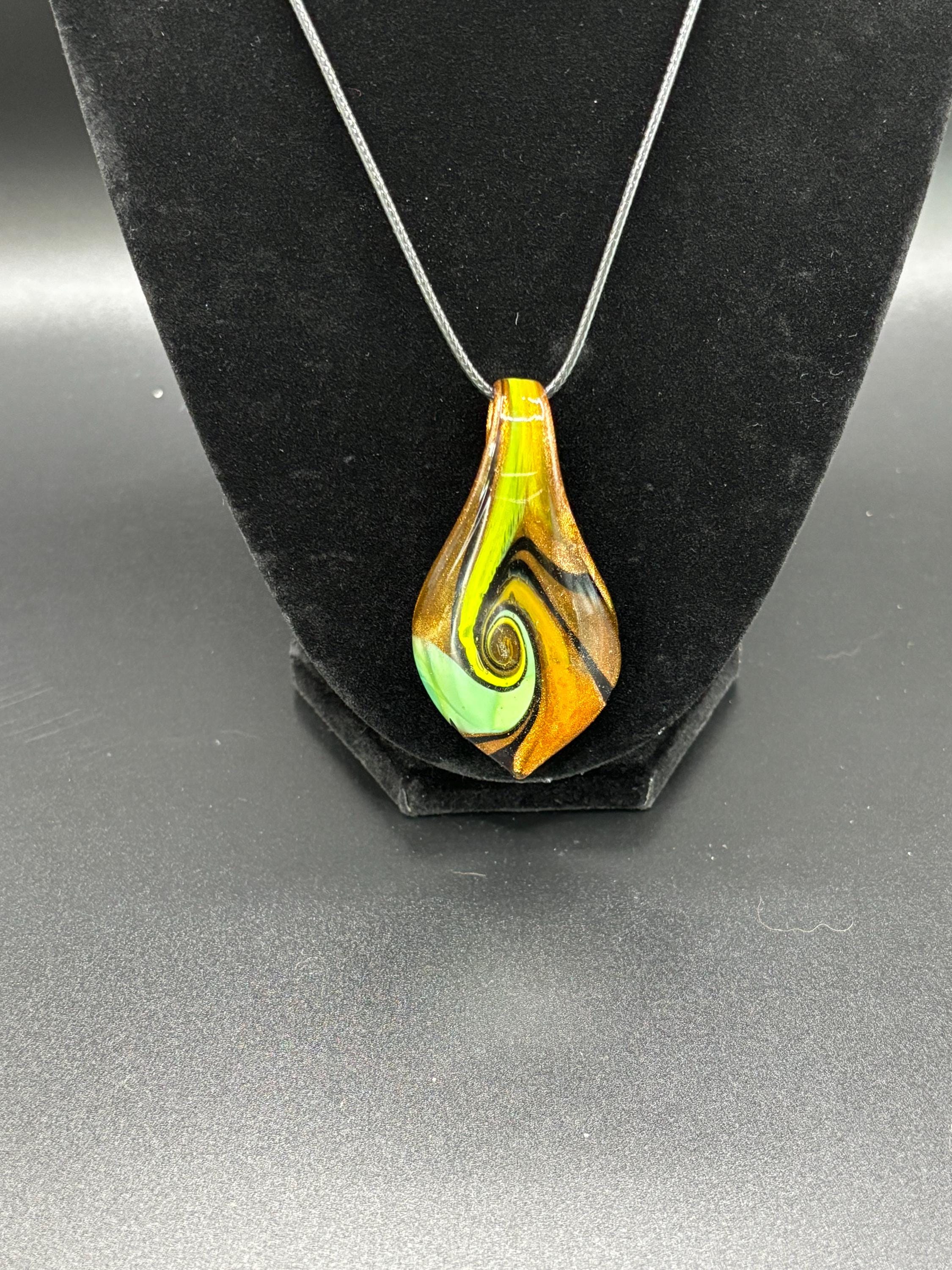This is a Glass Lampwork leaf necklace pendant. This Murano inspired glass has gold fleck accents with main color shades of green.