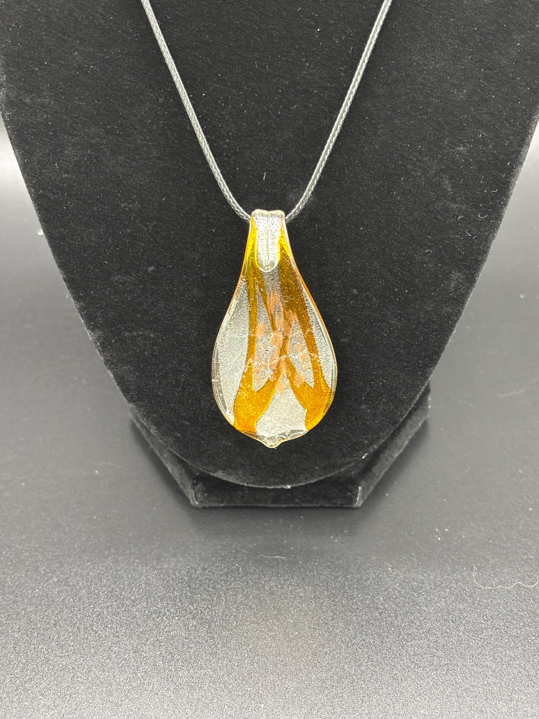 This is a Glass Lampwork leaf necklace pendant. This Murano inspired glass has silver accents with main color of a golden yellow.
