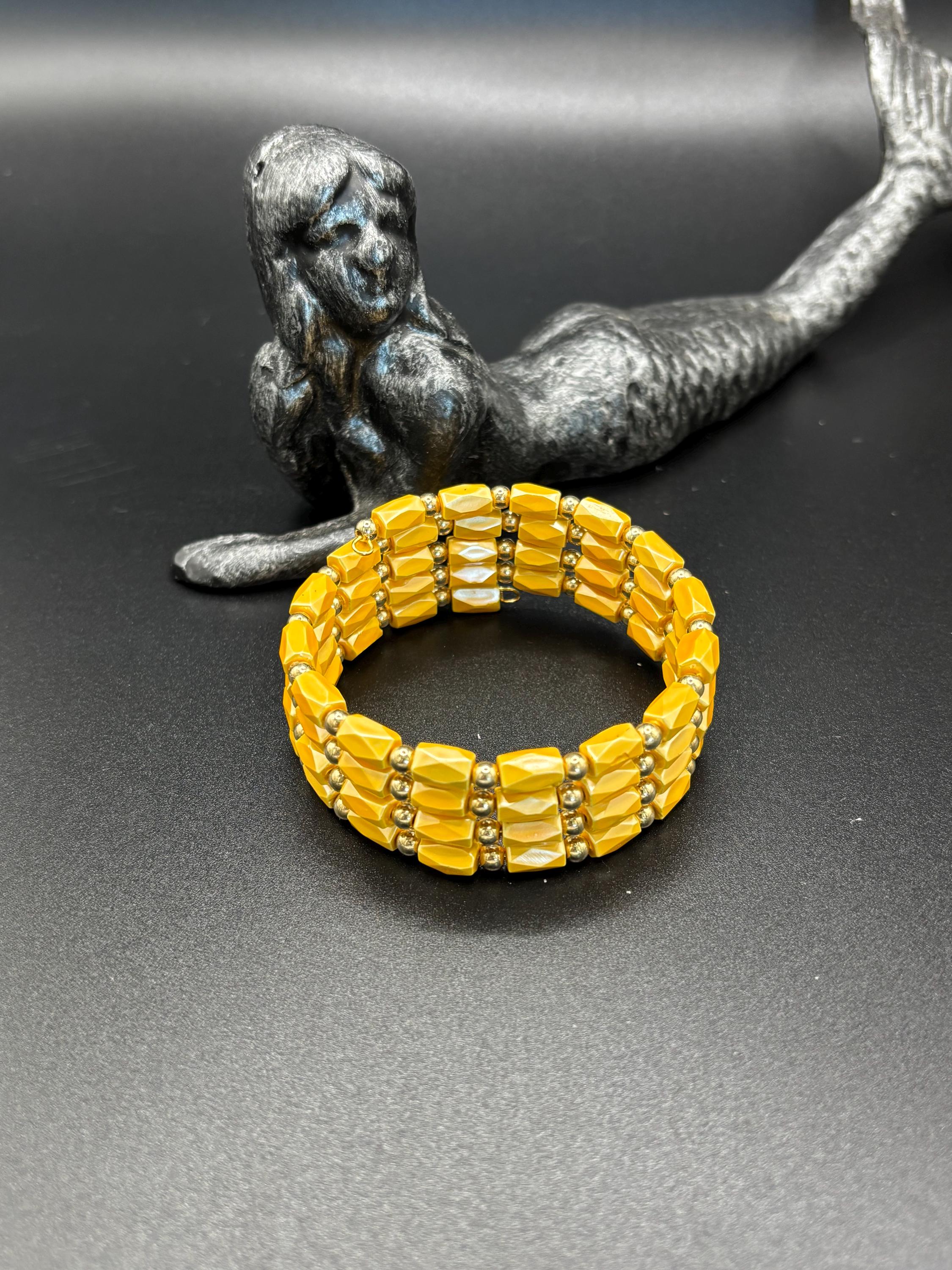 Our magnetic memory wire multistrand bracelet is made with Hematite gemstones and Gold accent metal beads. The hematite is coated In a golden yellow color making it a vibrant and unique piece of jewelry.