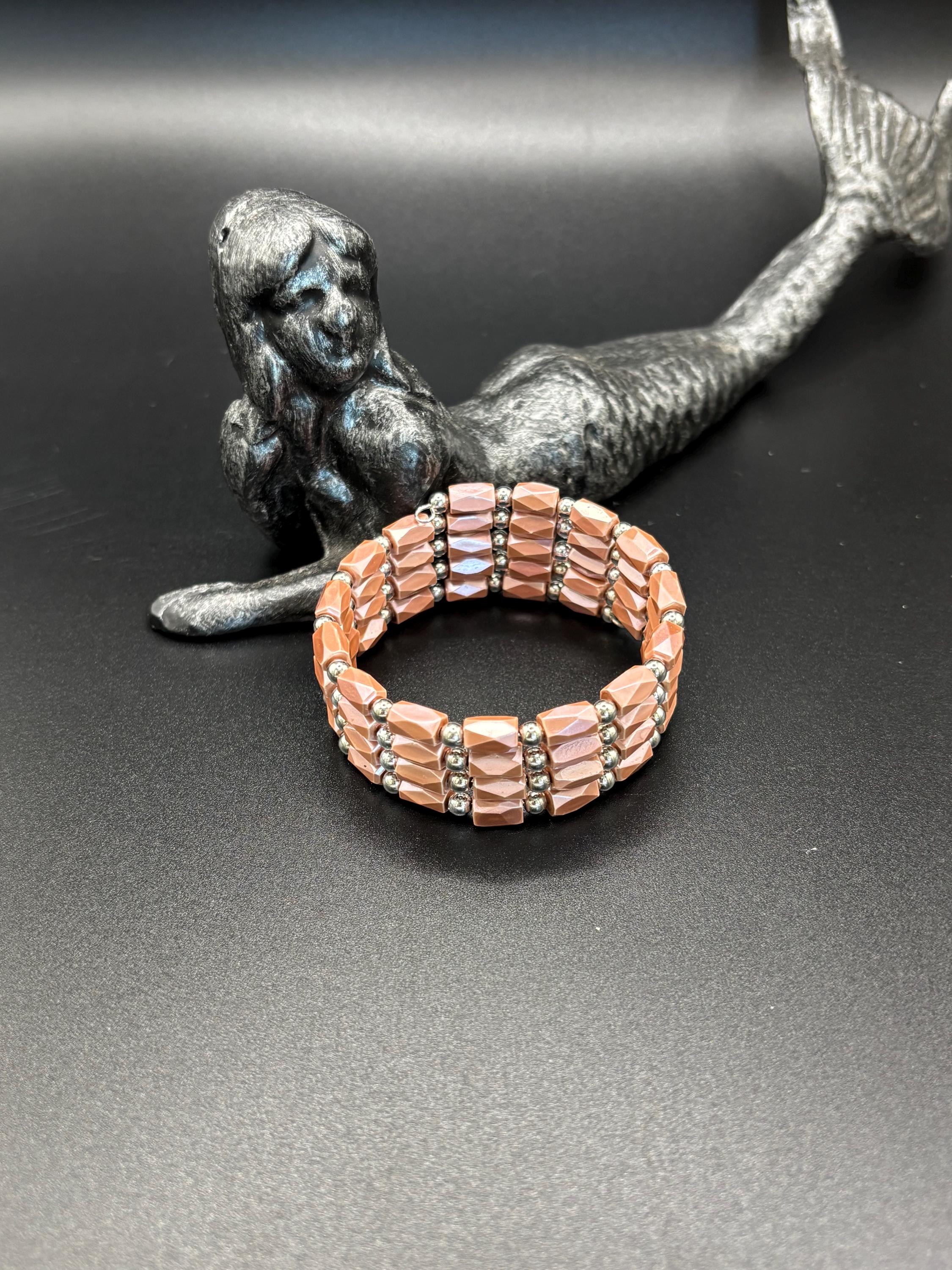 Our magnetic memory wire multistrand bracelet is made with Hematite gemstones and silver accent metal beads. The hematite is coated In a rose gold pink color making it a pretty and unique piece of jewelry.