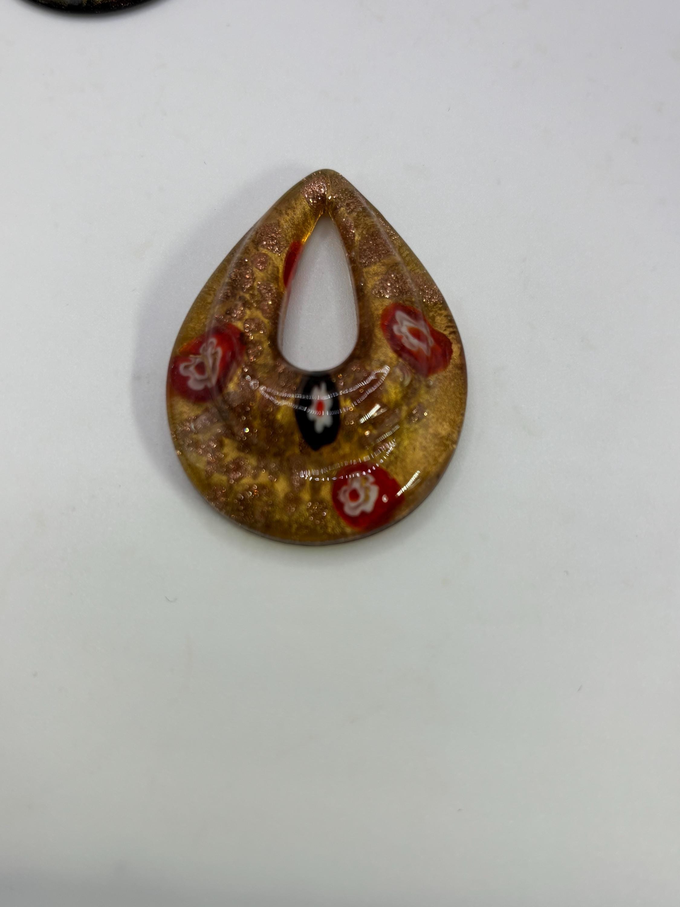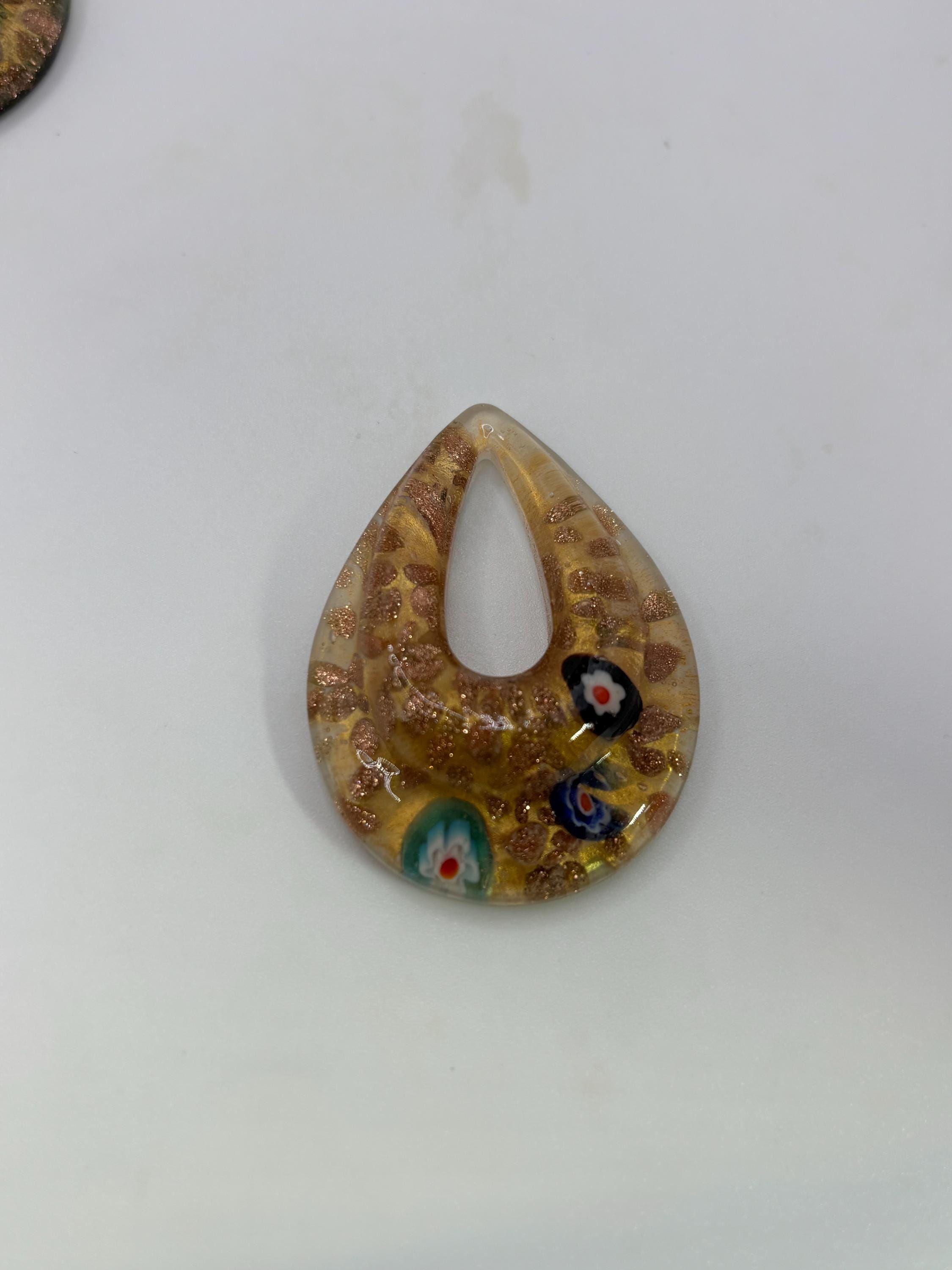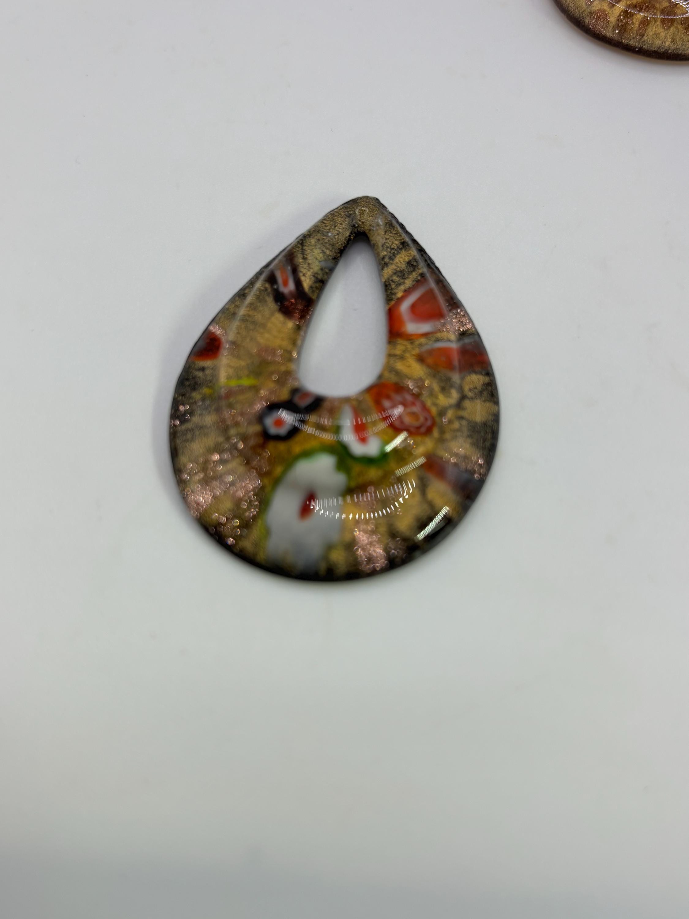 These MilleFiori pendants are made of glass in the shape of a teardrop. The color is topaz/ yellow .
