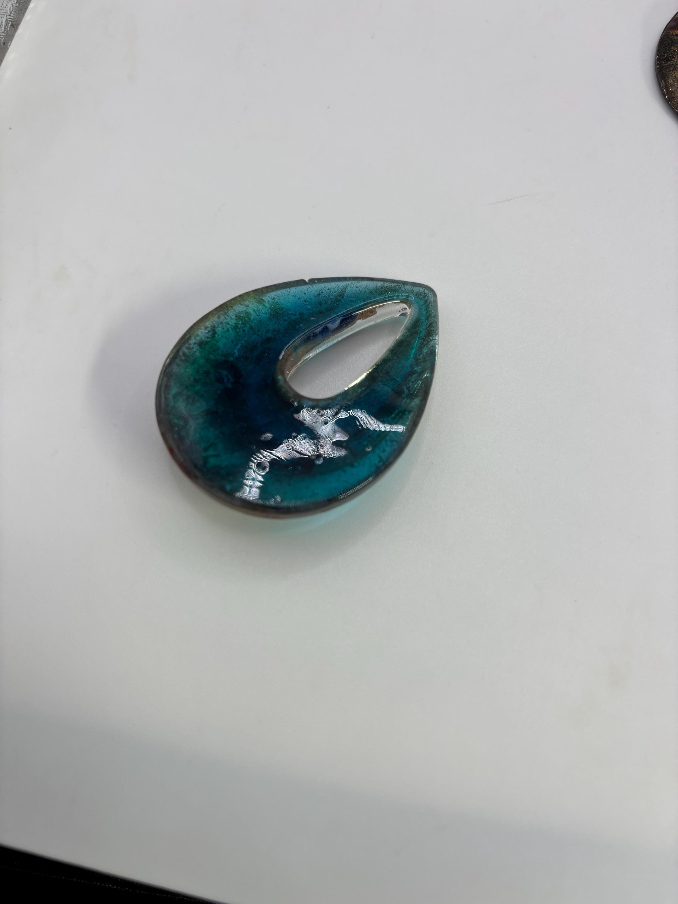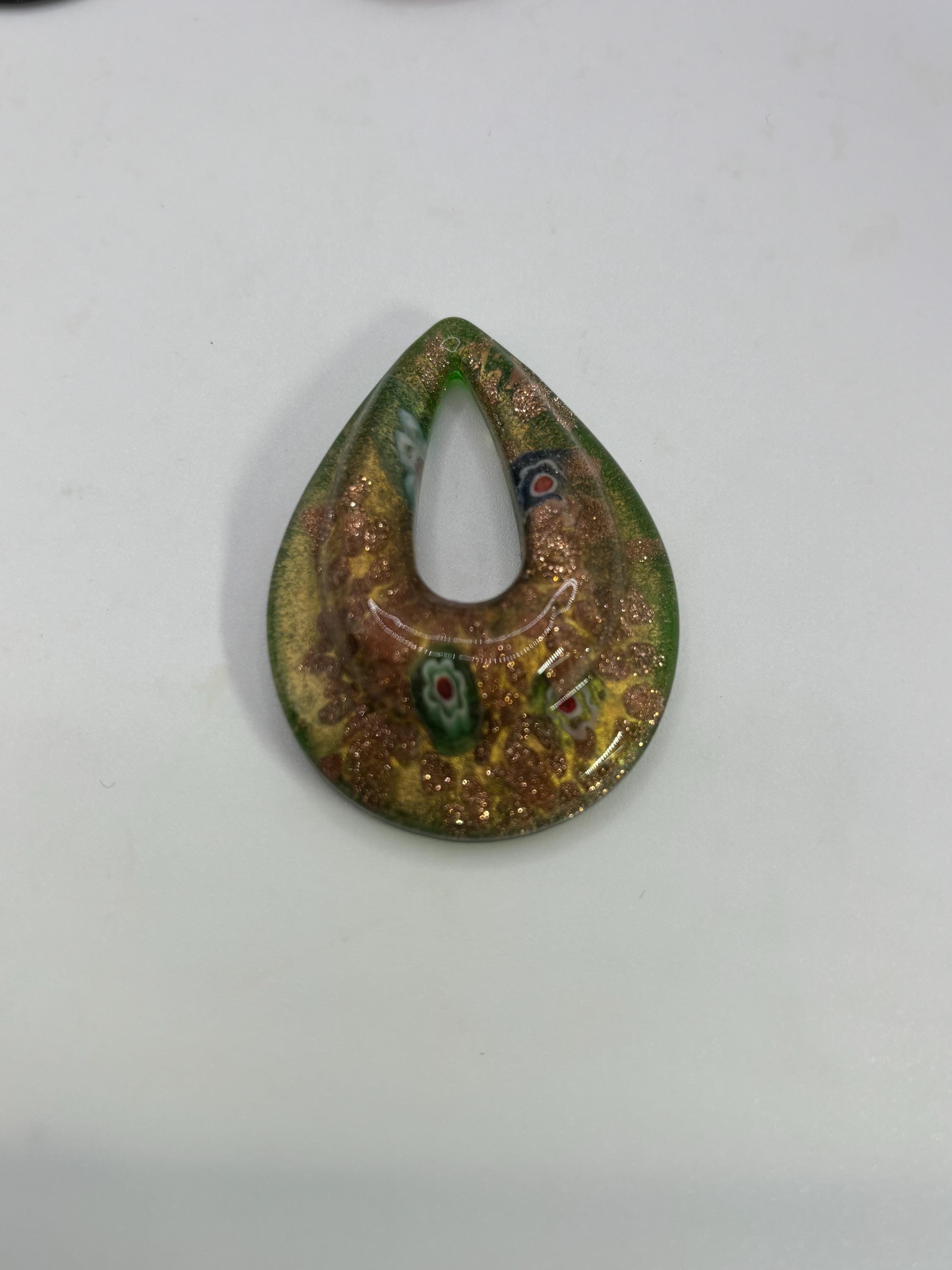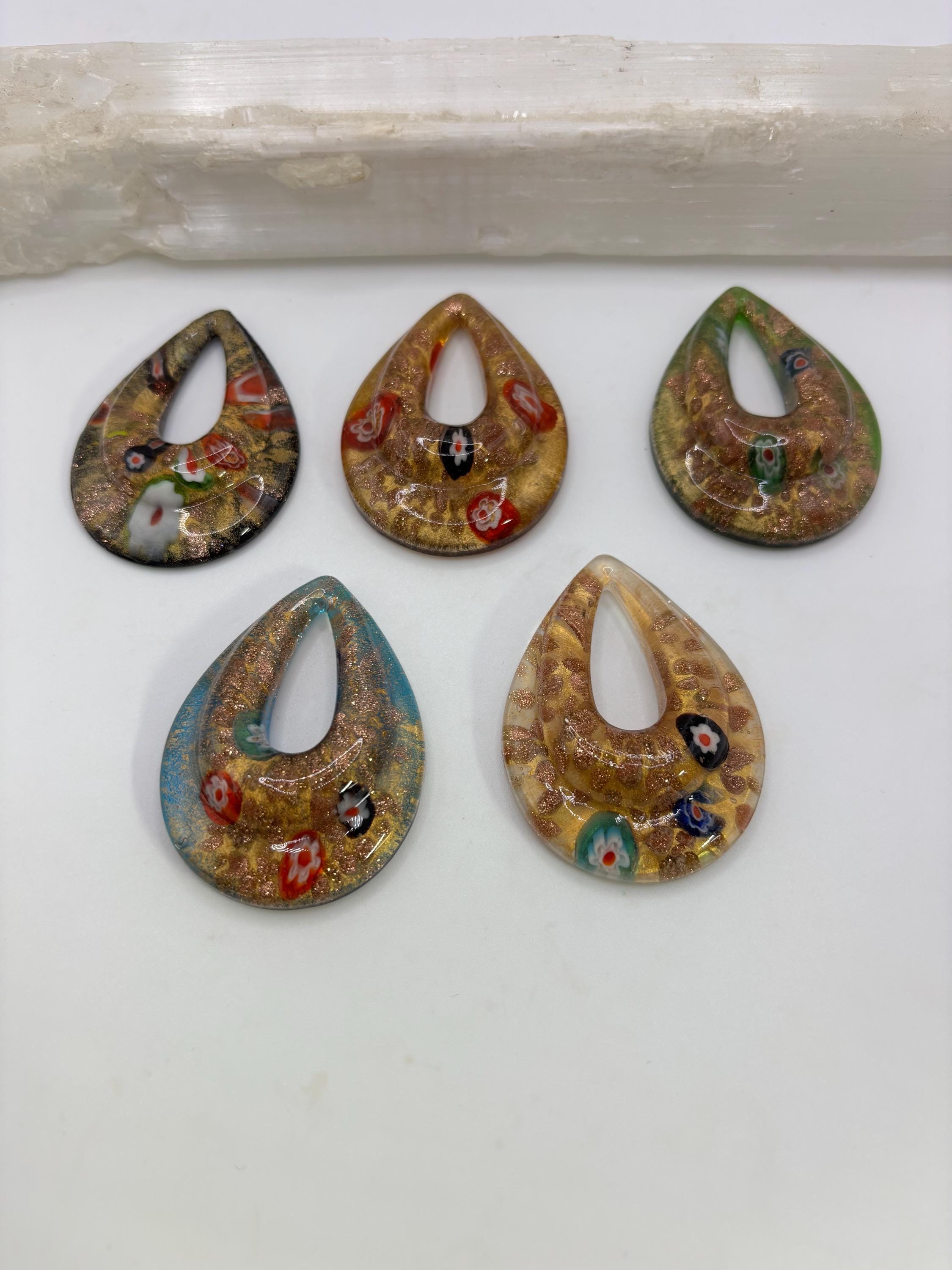 These MilleFiori pendants are made of glass in the shape of a teardrop. The color is topaz/ yellow .