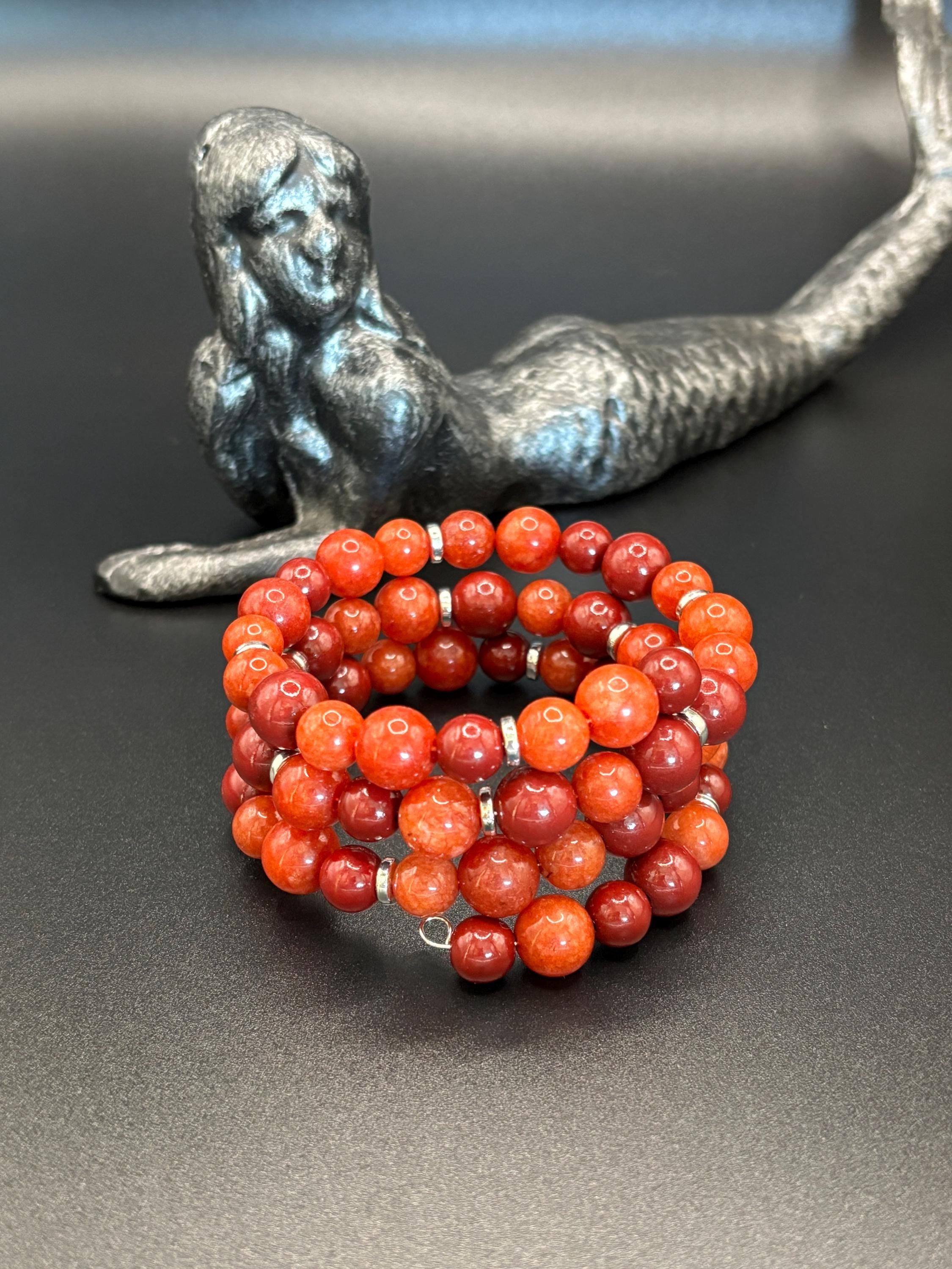 Add a touch of sophistication to your style with our elegant memory wire multistrand bracelet, made with Cinnabar and Carnelian gemstones and silver accent metal beads.