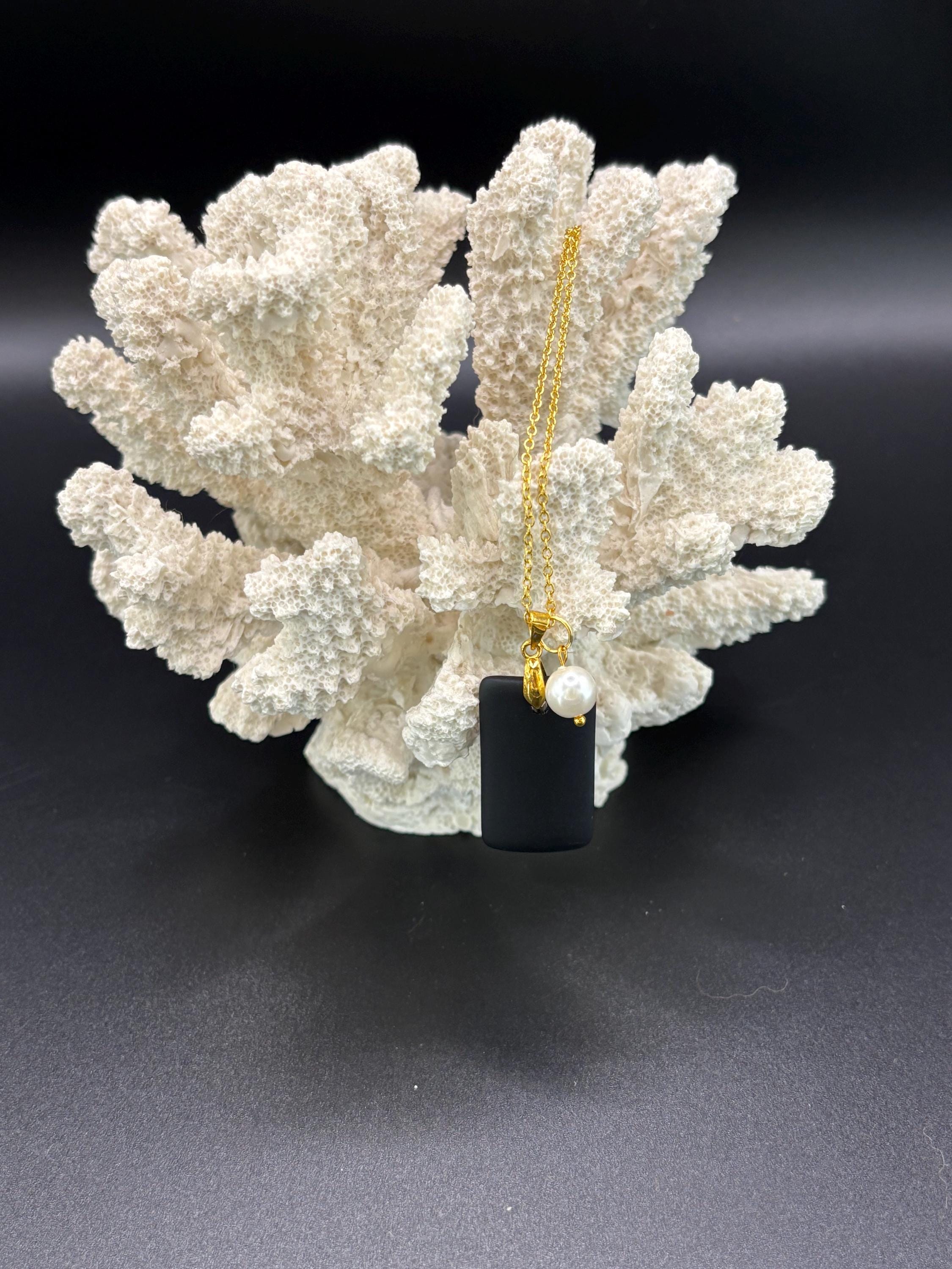 This pretty Seaglass necklace is made with black Seaglass and accented with a freshwater pearl.
