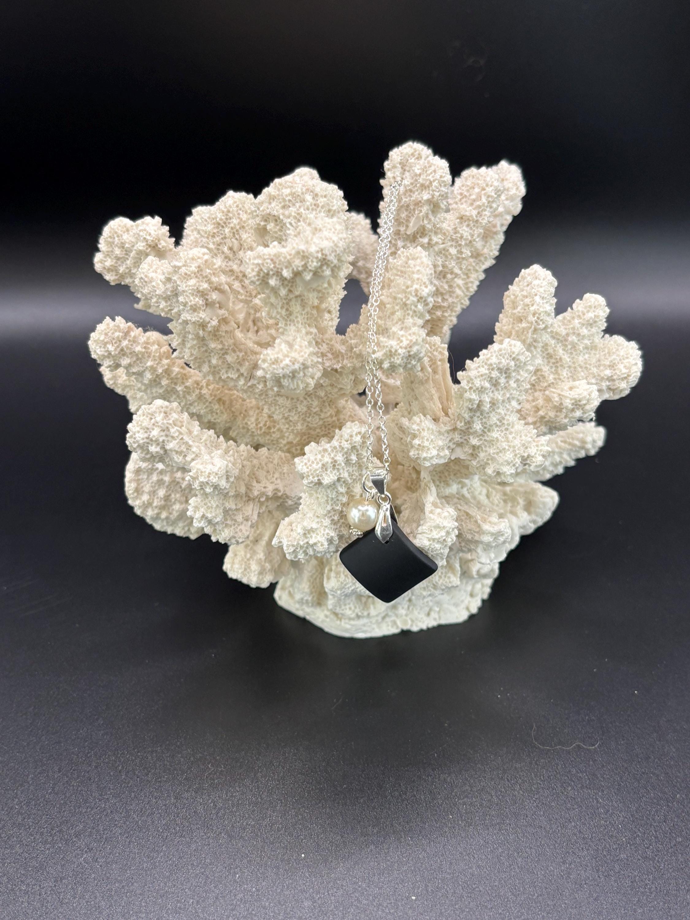 This pretty Seaglass necklace is made with black Seaglass and accented with a freshwater pearl.