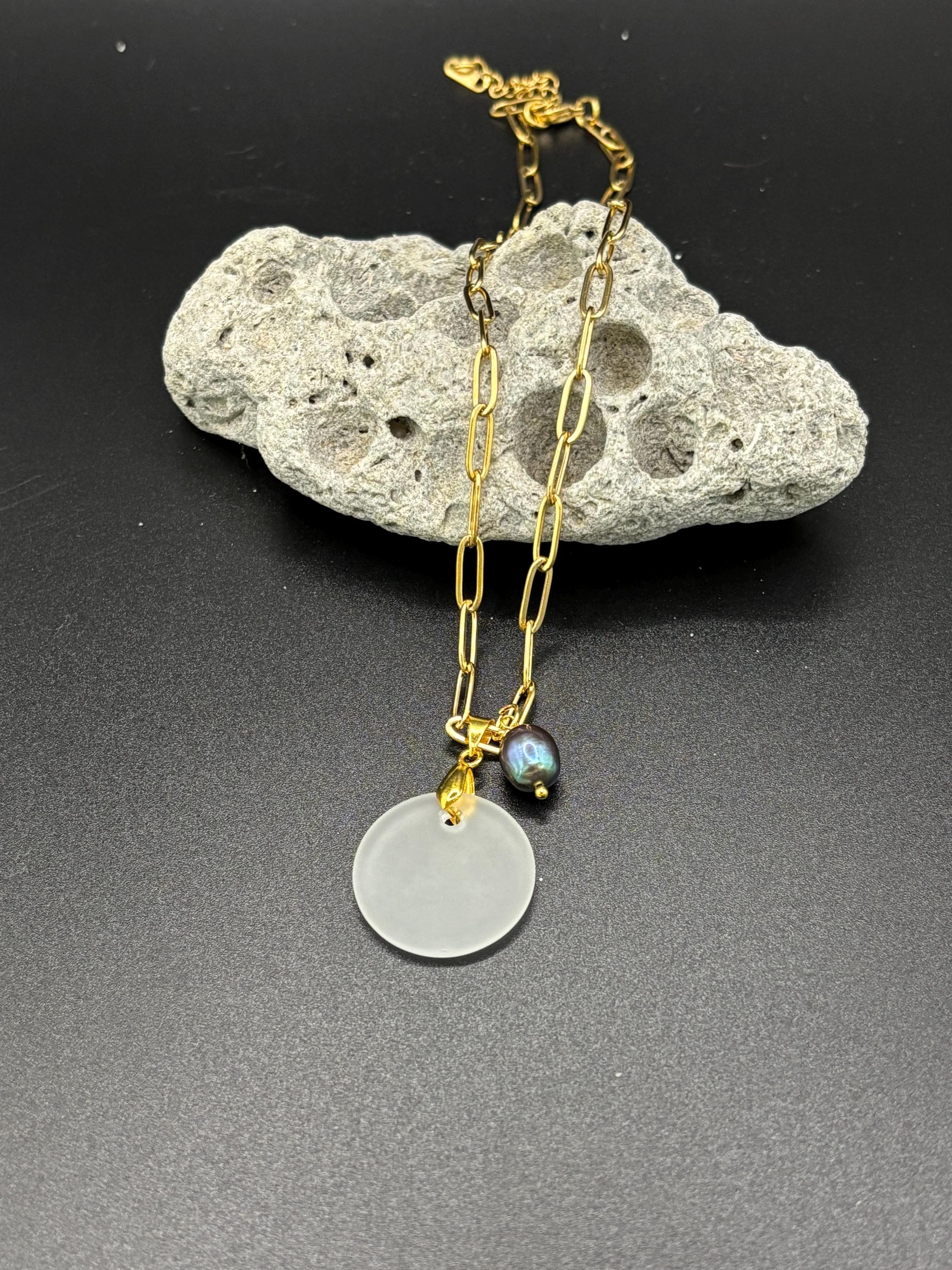 This pretty Seaglass necklace is made with white Seaglass and accented with a freshwater black pearl.
