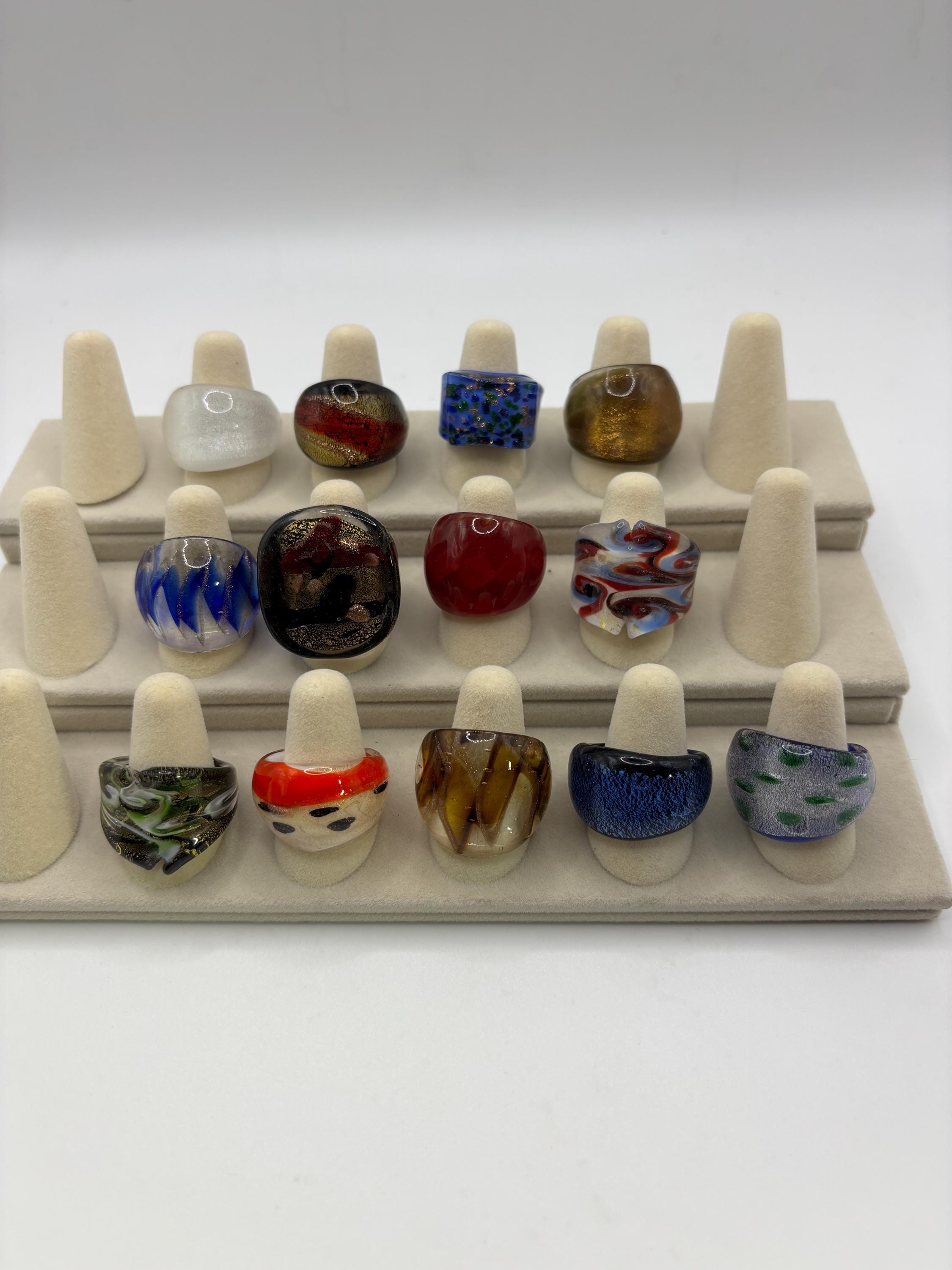 There will be many options by style, color and ring type. There are Millefiori designs as well as Murano inspired glass rings to chose from.