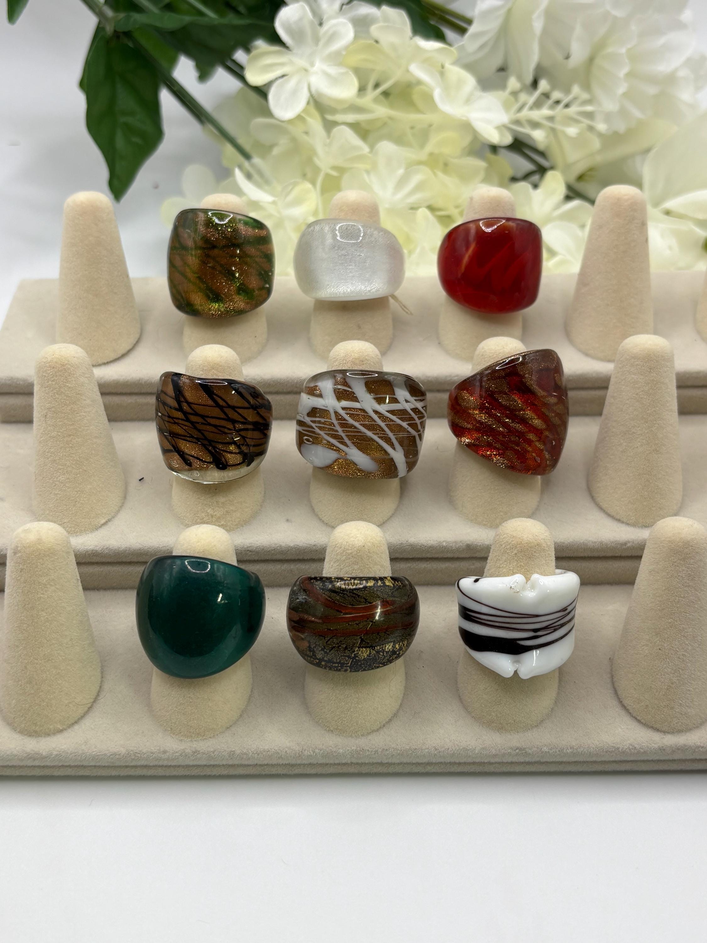 There will be many options by style, color and ring type. There are Millefiori designs as well as Murano inspired glass rings to chose from.
