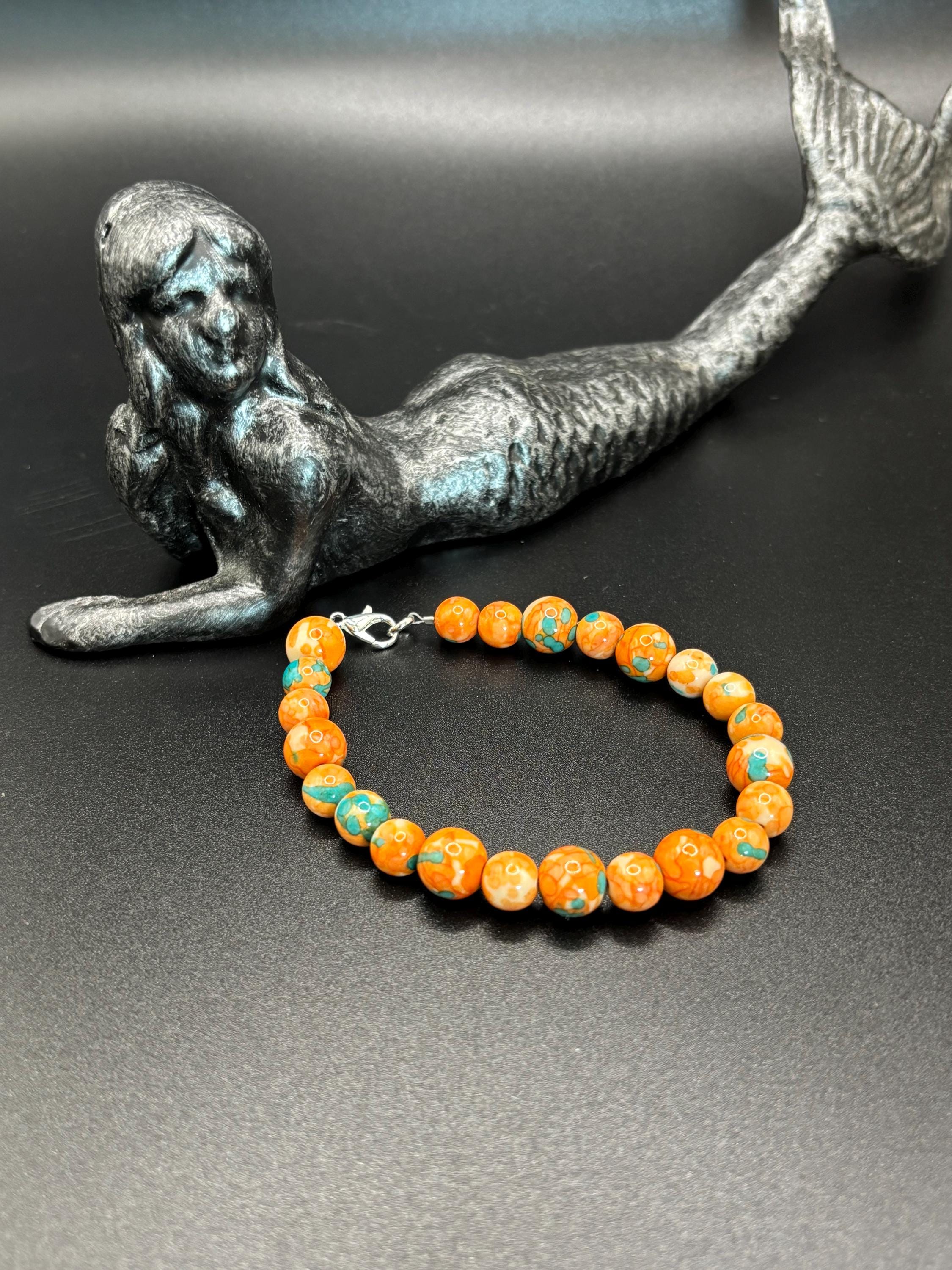 It has a mix of orange and teal running naturally through the gemstones. It is unique!