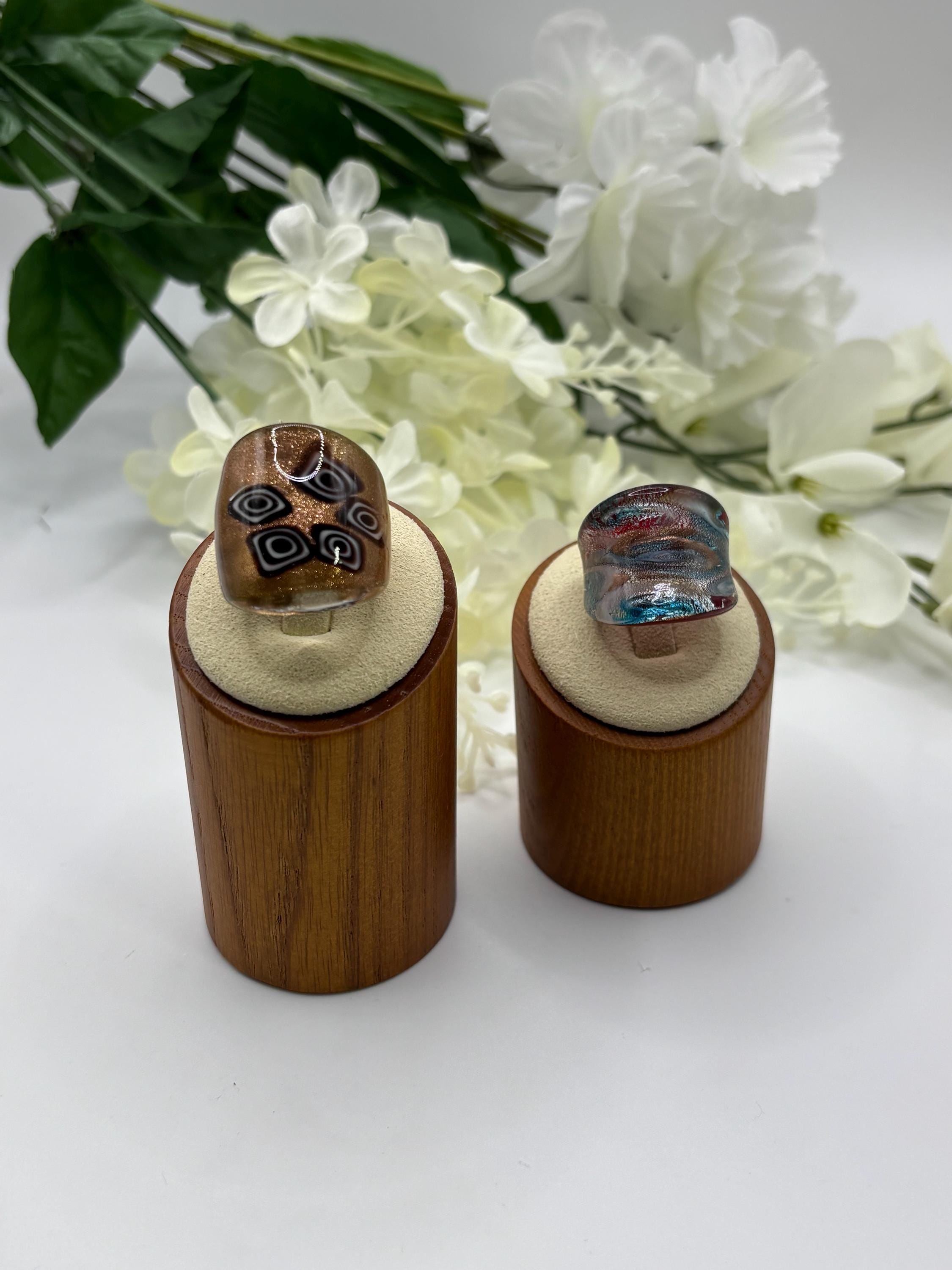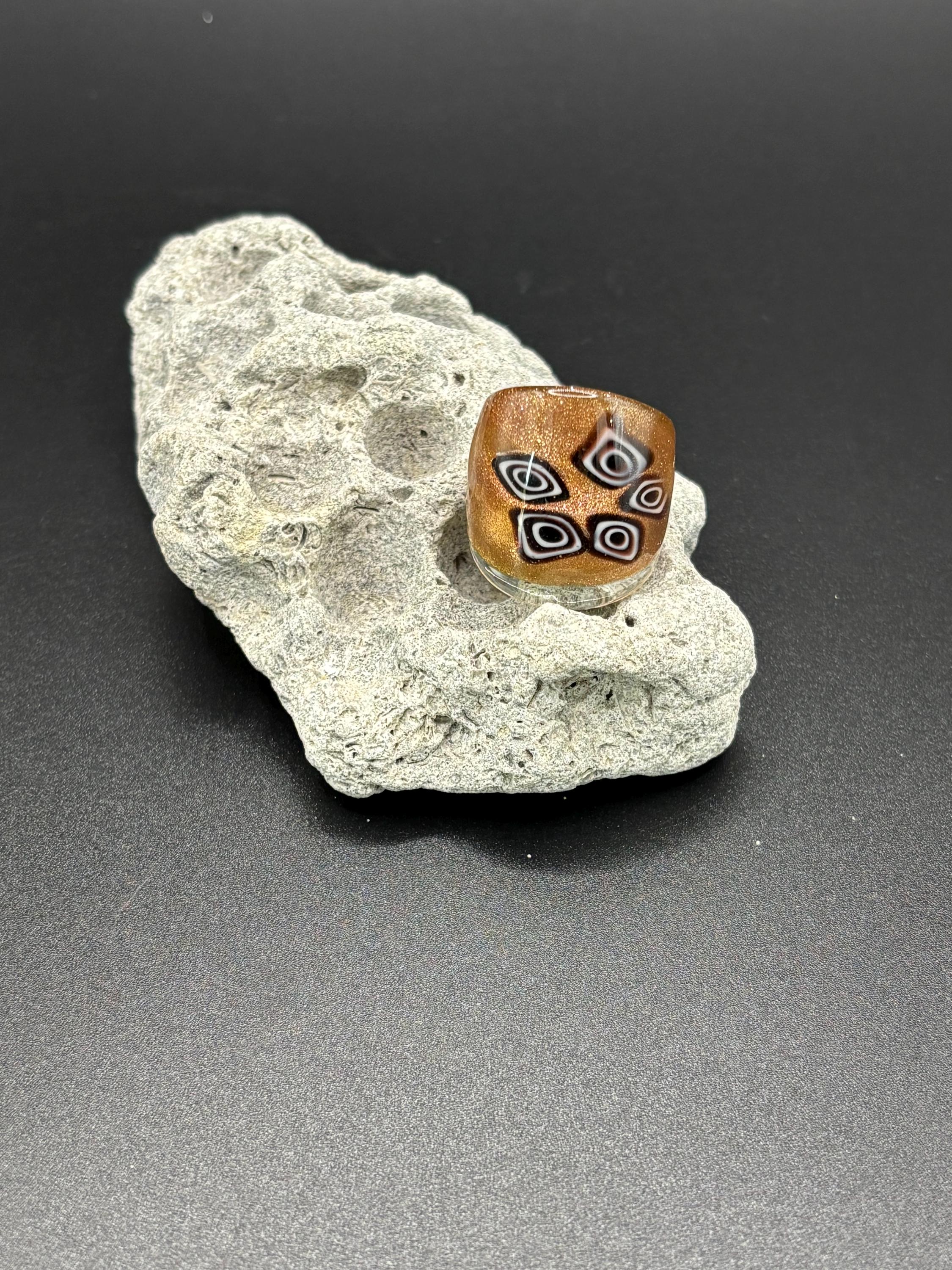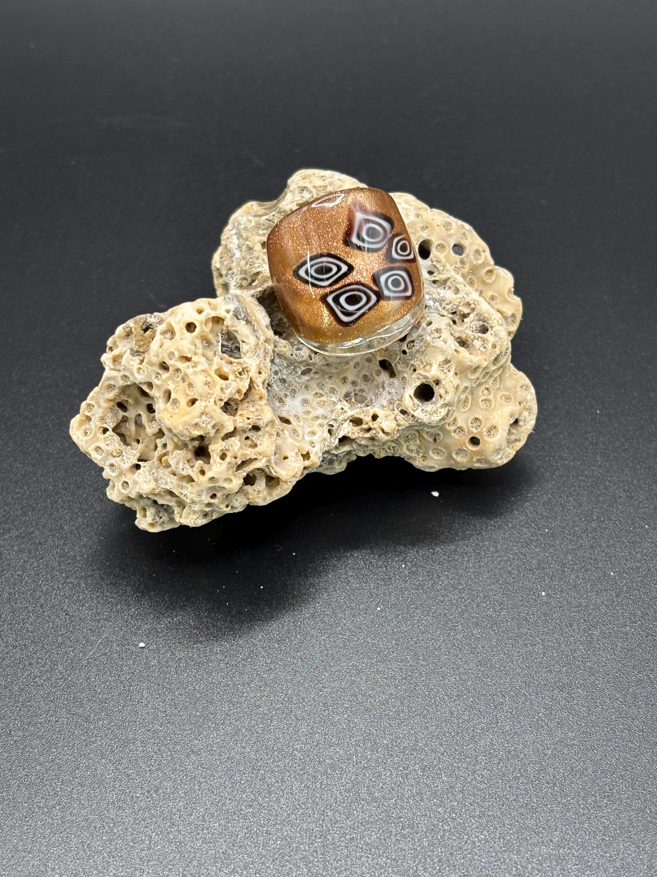 This is a Millefiori glass ring and has geometric designs in rich brown and white on a gold/copper colored base.