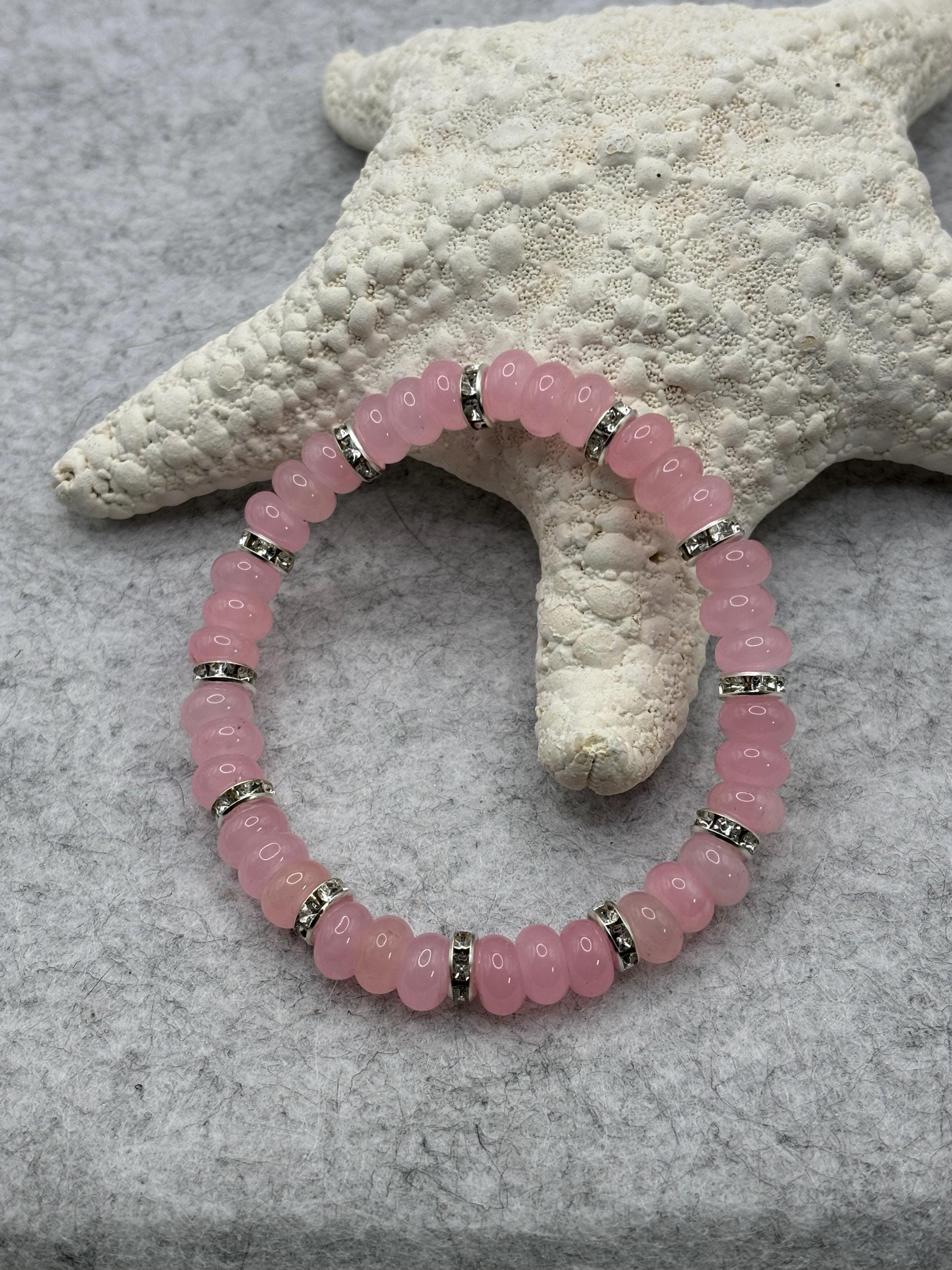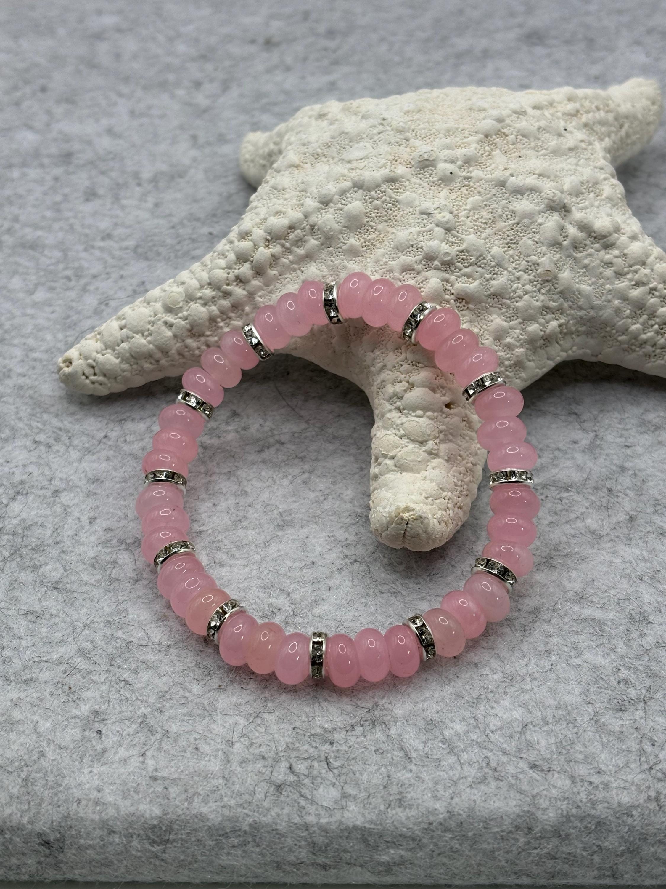 Pink quartz rondelles with silver rhinestone rondelles. Stretch bracelet