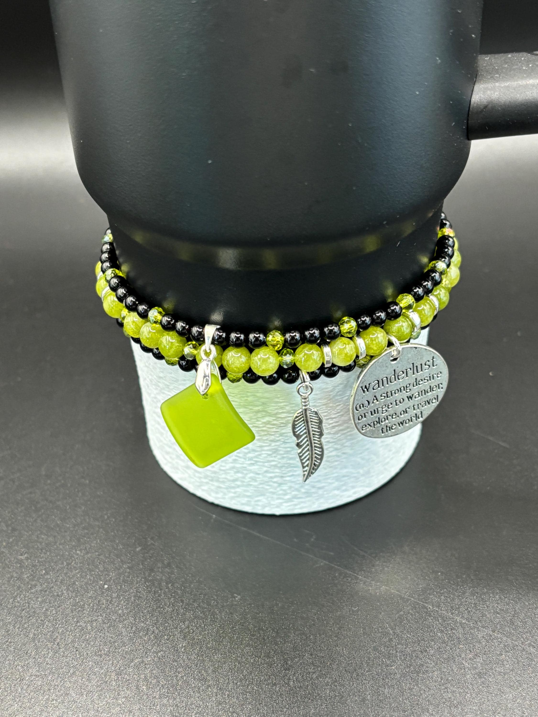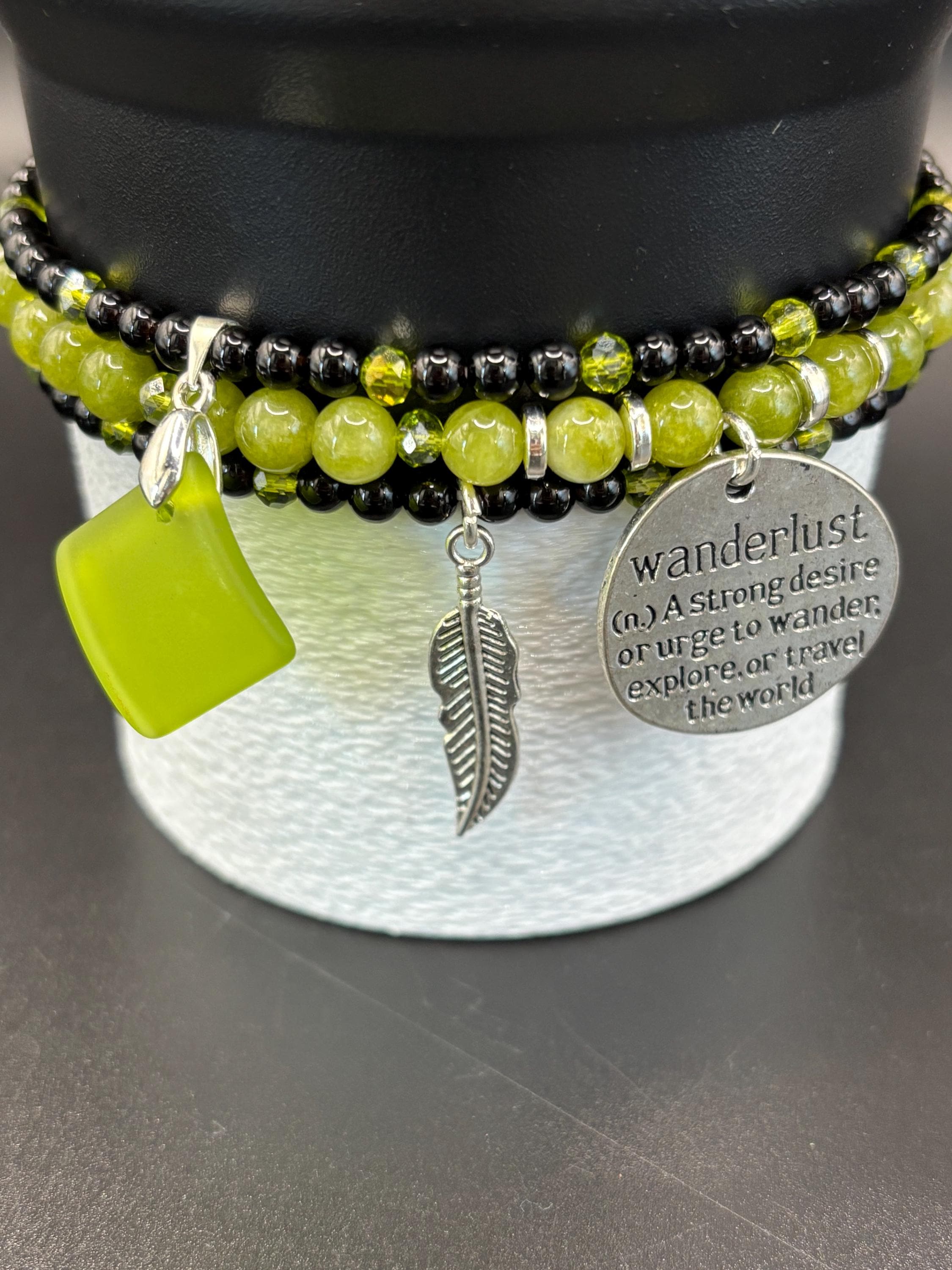 Charm says Wanderlust (with definition) . There is also Seaglass charm on one of the bracelets.