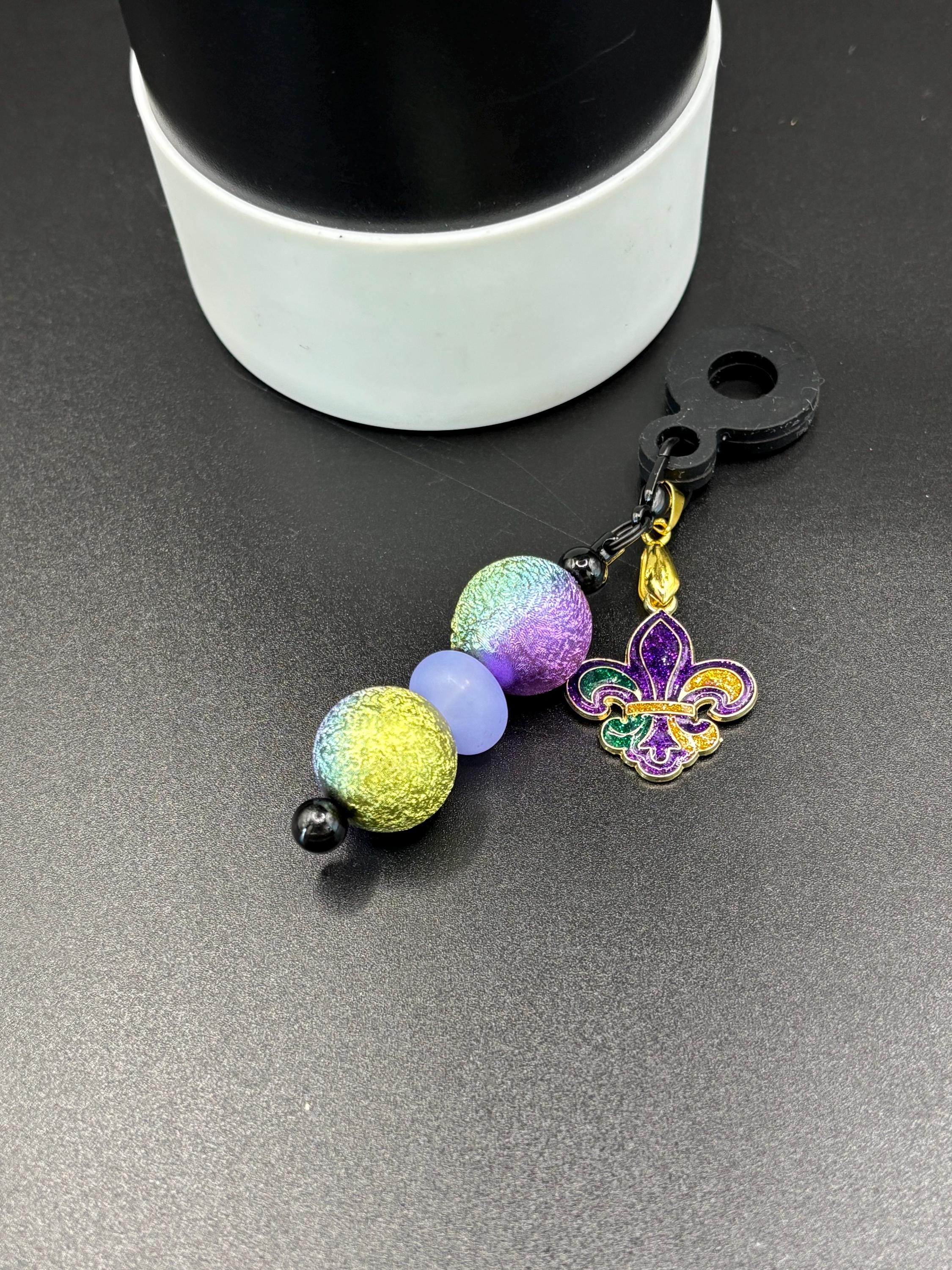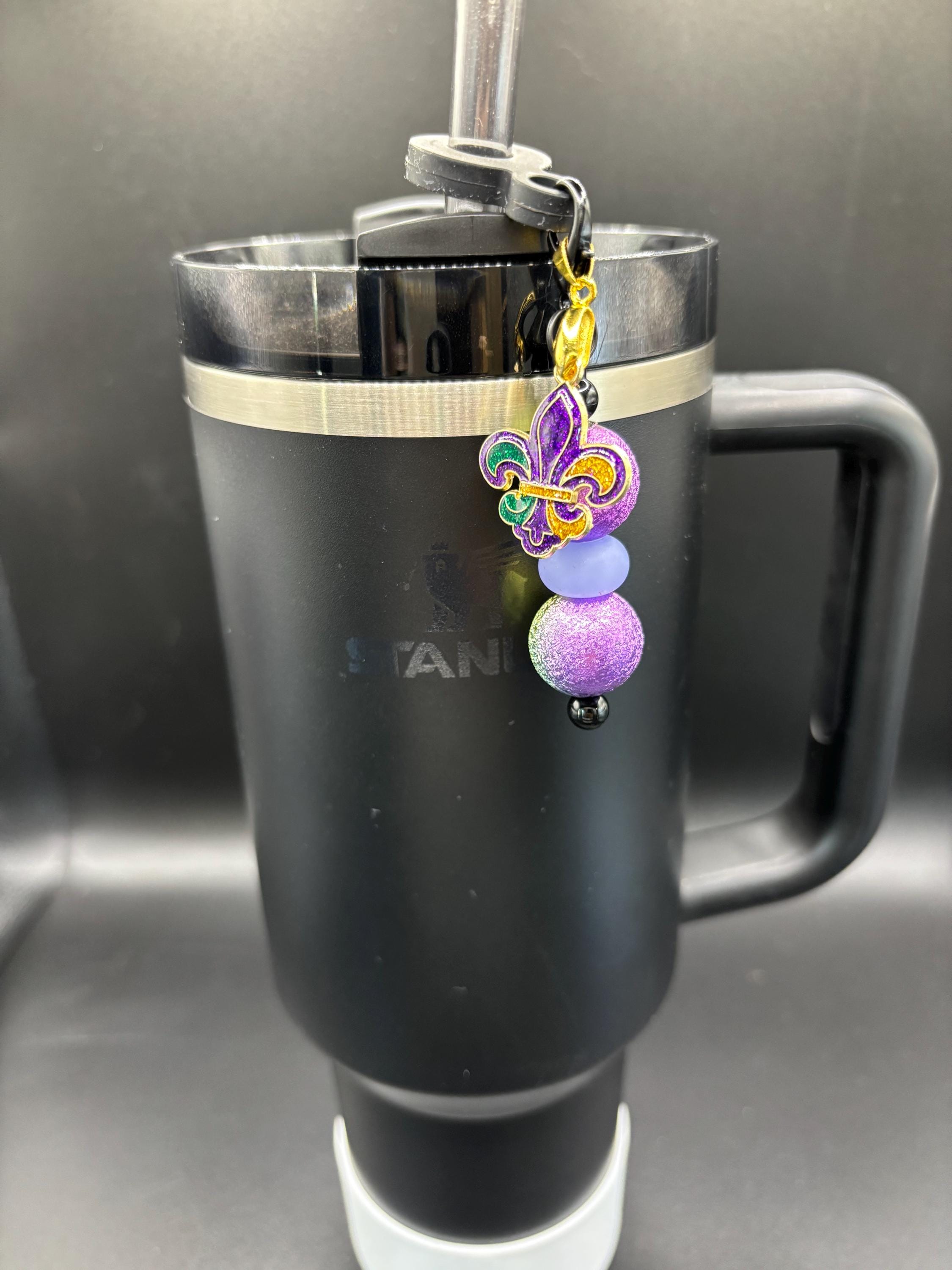 This fun Mardi Gras straw charm strand is made for your Tumbler and is shown on a 30 Ounce Stanley. It will fit any tumbler with a straw