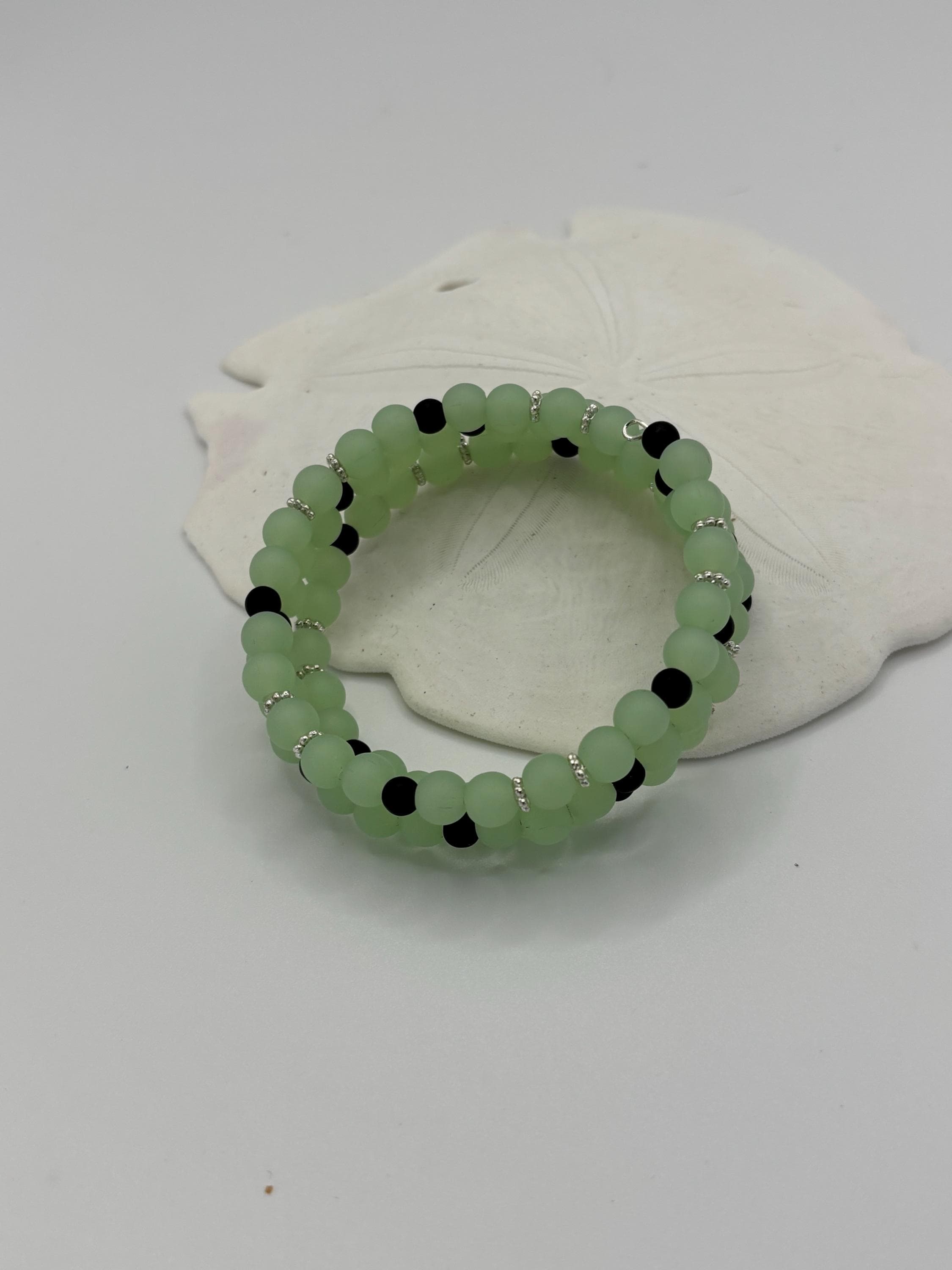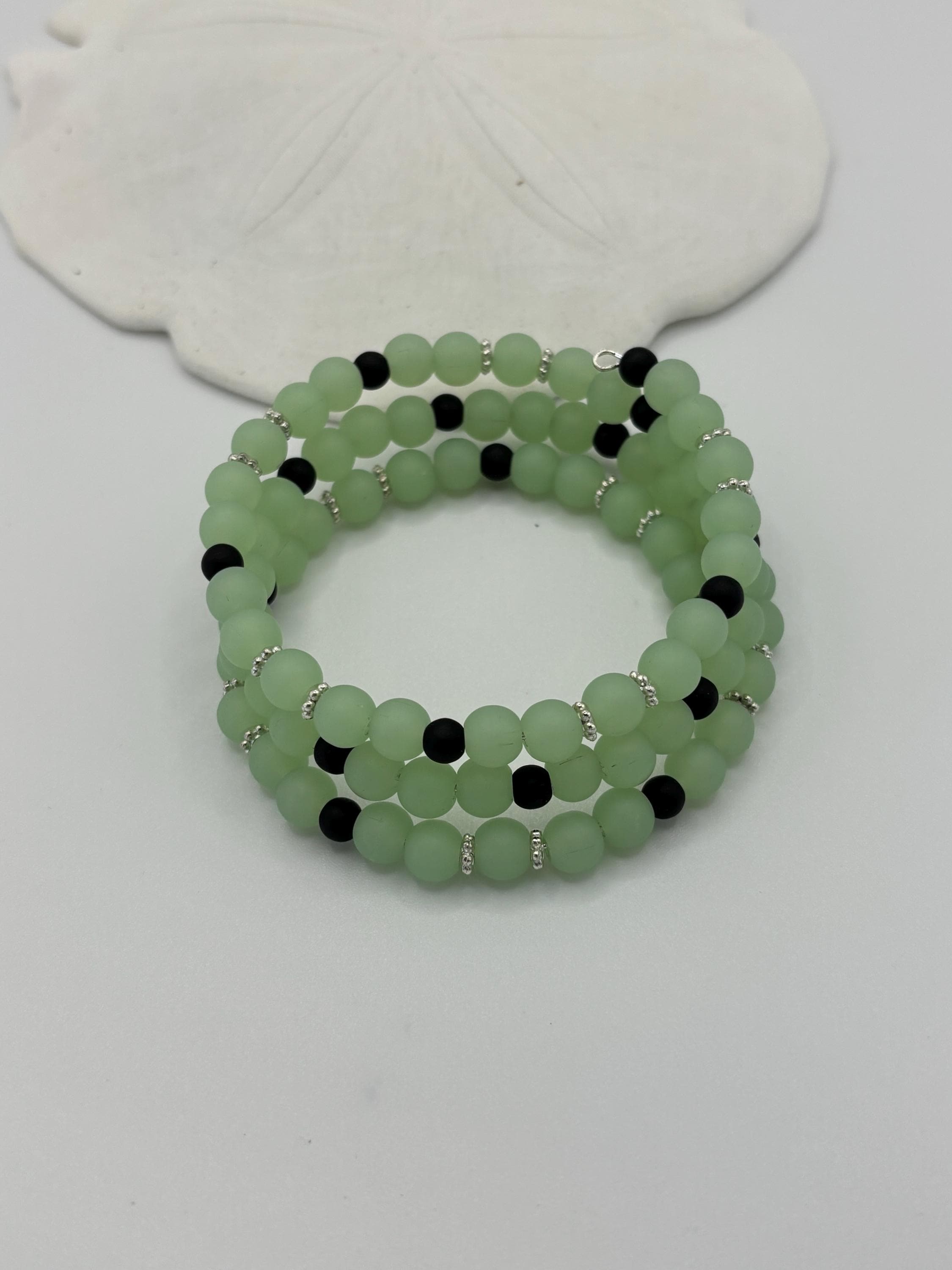 This beautiful Memory Wire Seaglass bracelet is made with sea foam green Seaglass. The seaglass makes up most of the bracelet and is accented with pearls and rose gold small findings.