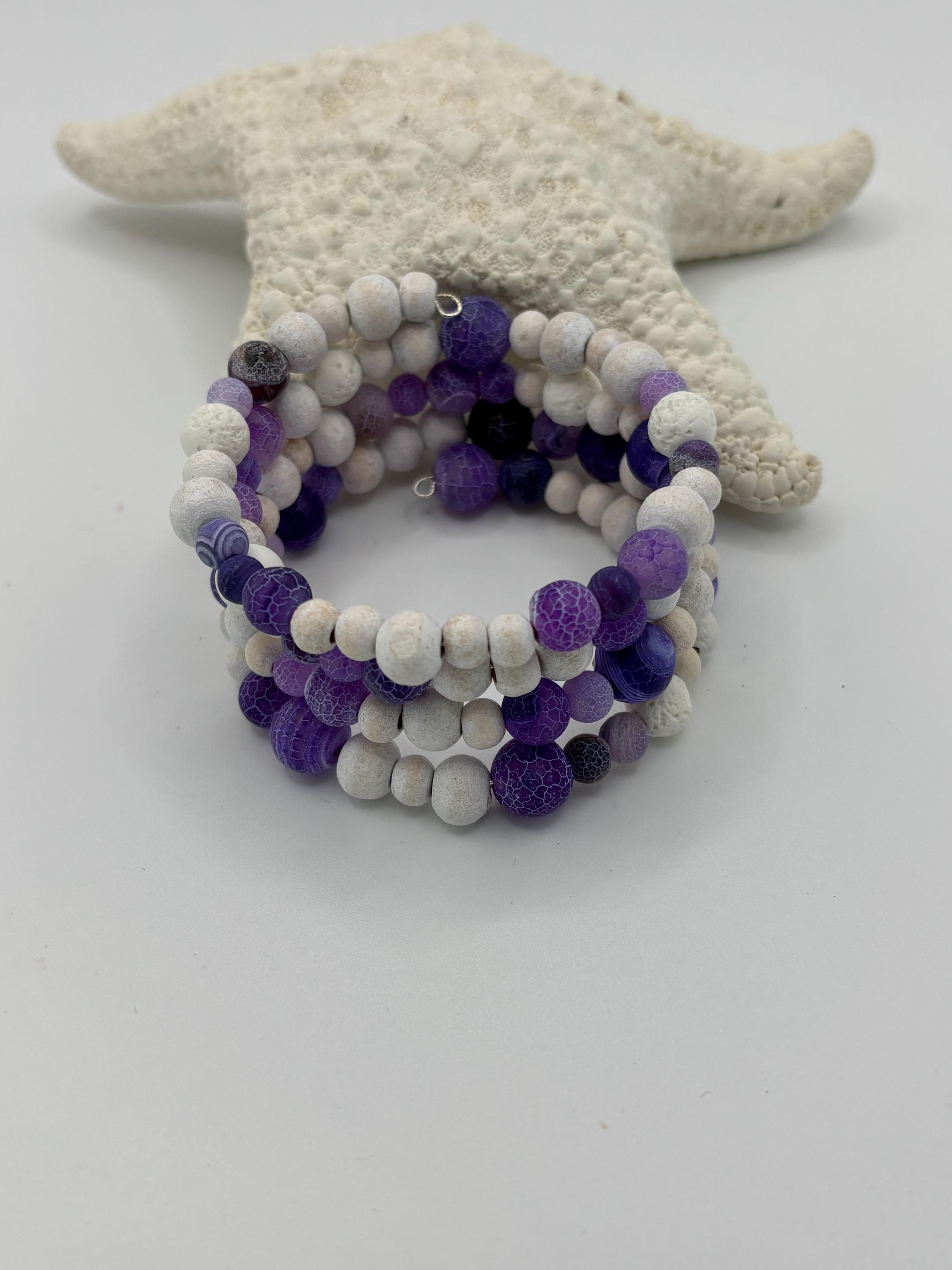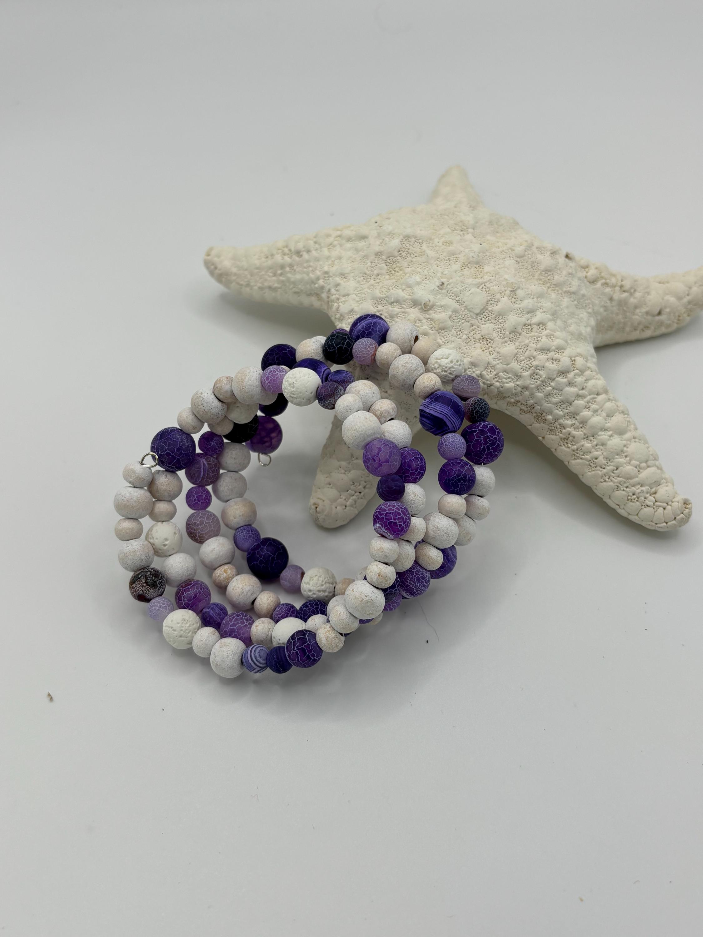 Add a touch of sophistication to your style with our purple agate and white wooden bead memory wire multistrand bracelet.