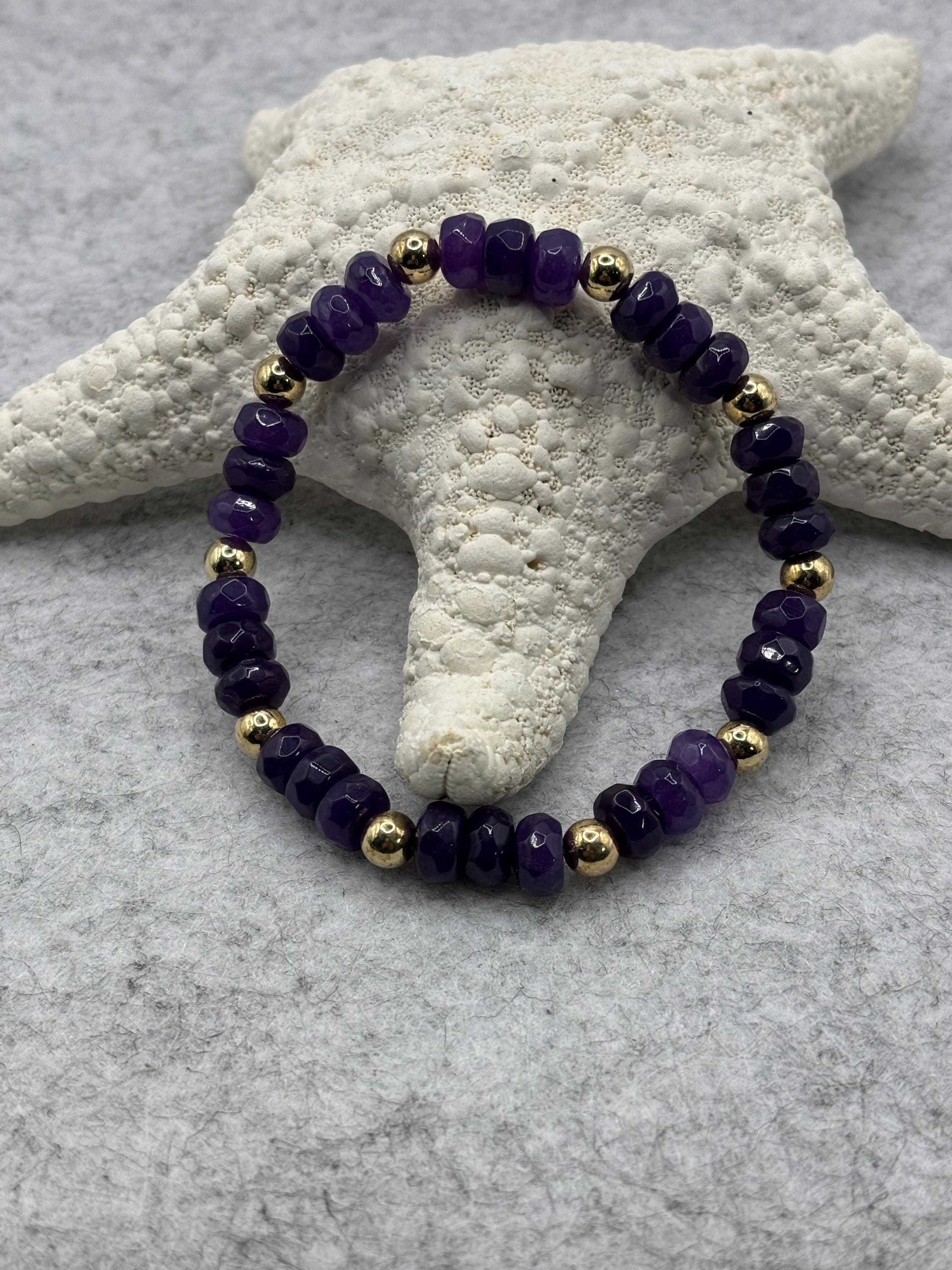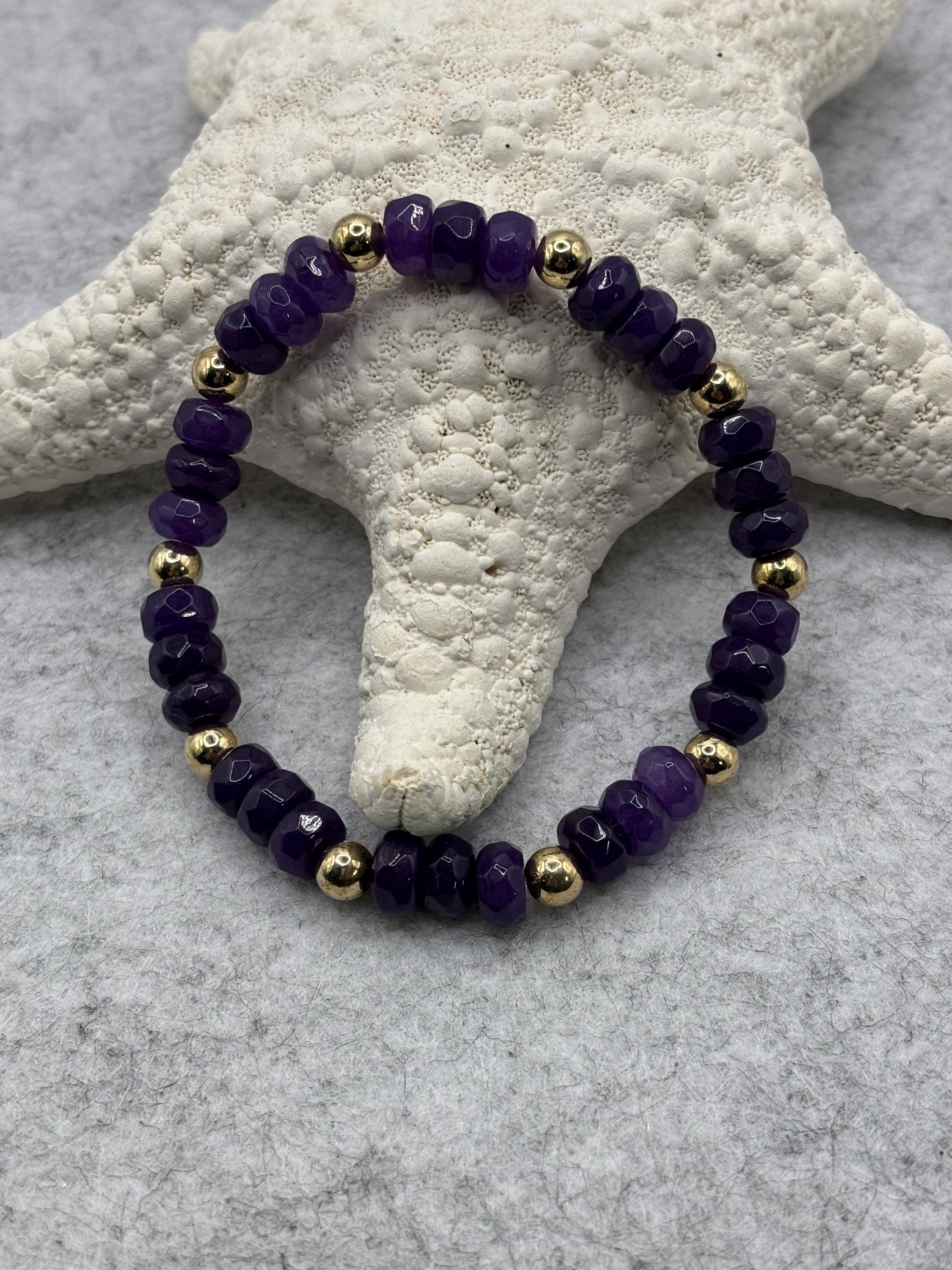 Beautiful purple amethyst bracelet in Rondelle shape that are faceted. Gold accent beads.