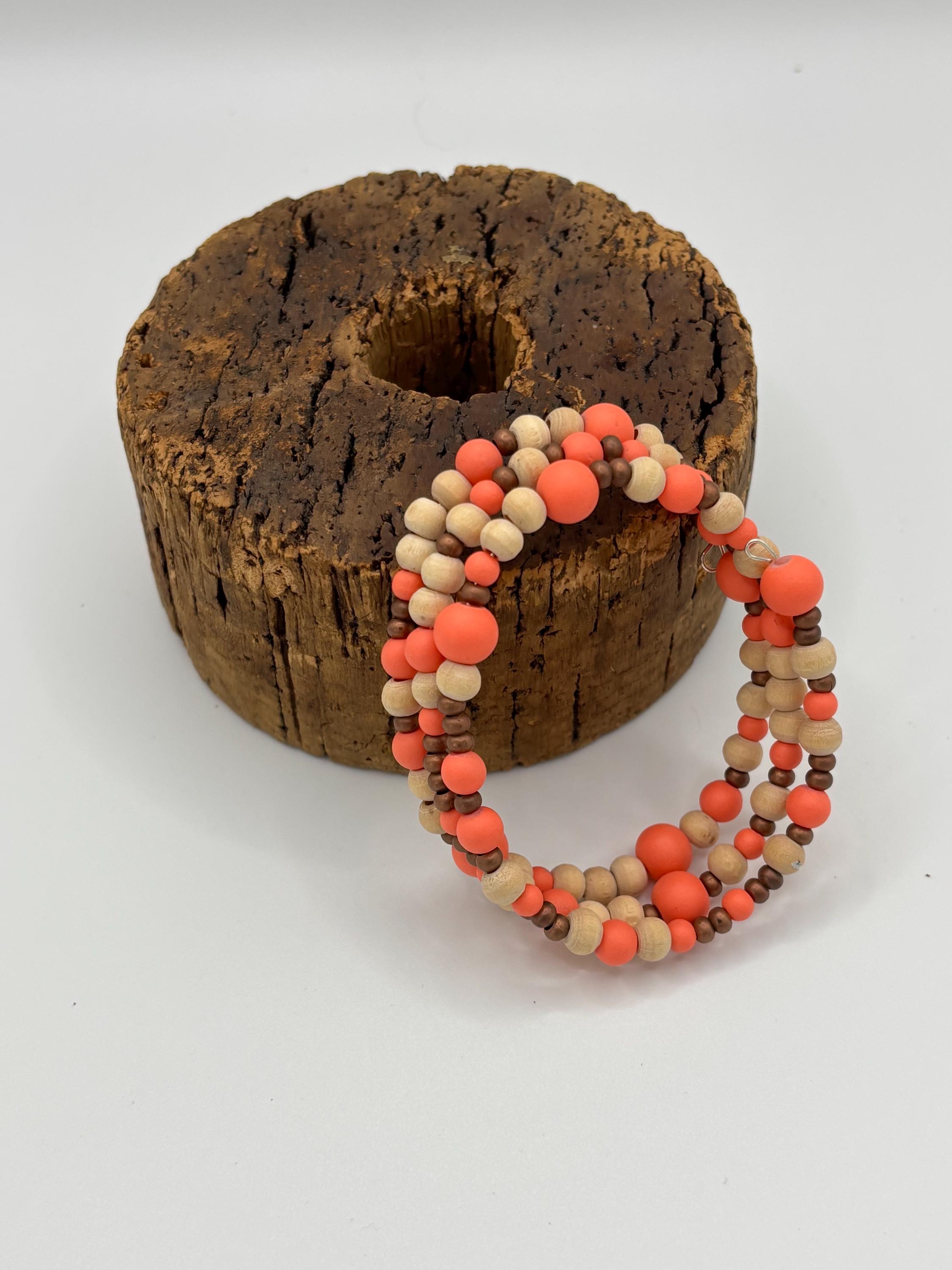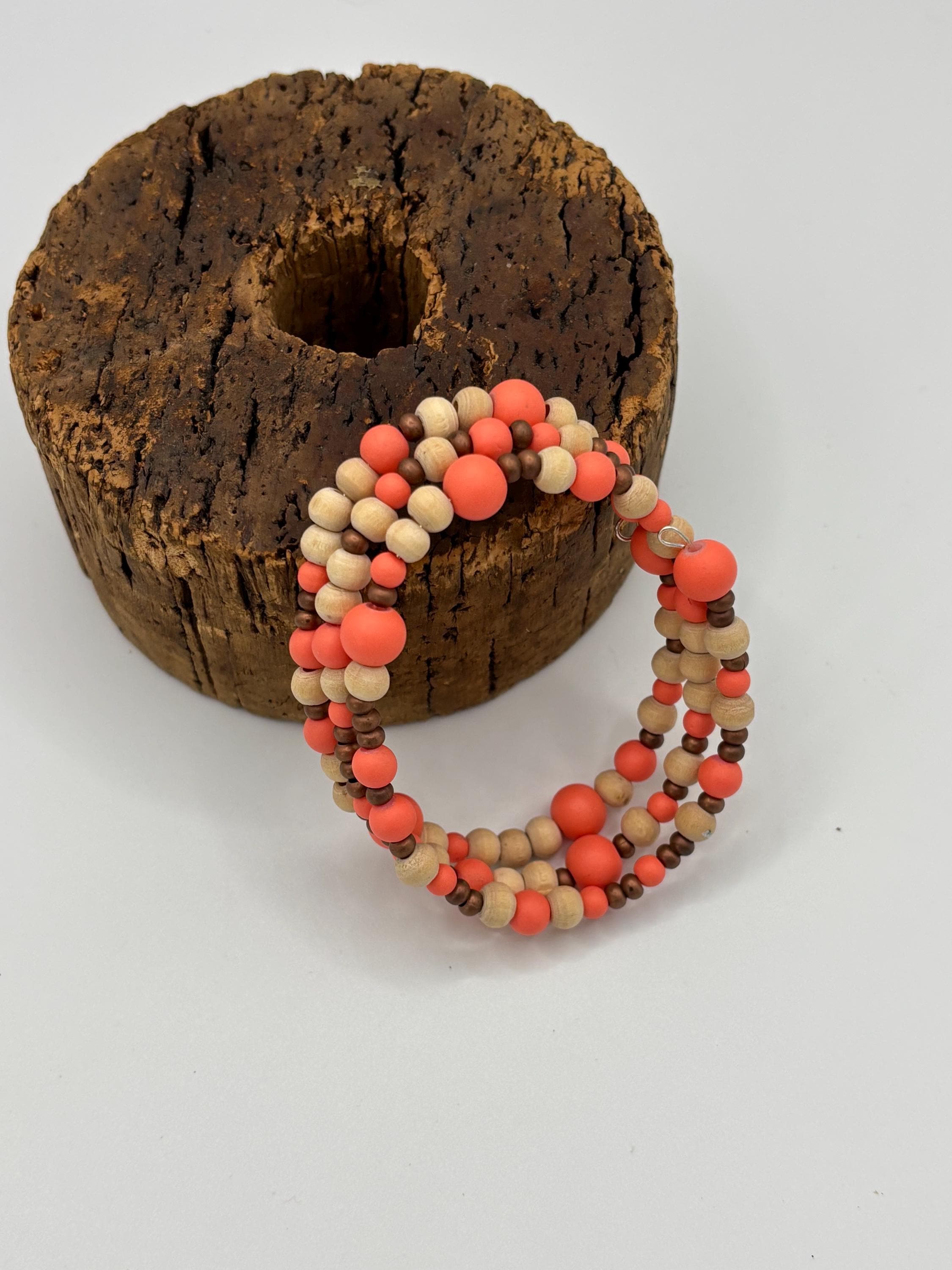 Add a touch of sophistication to your style with our salmon and tan wooden bead memory wire multistrand bracelet.