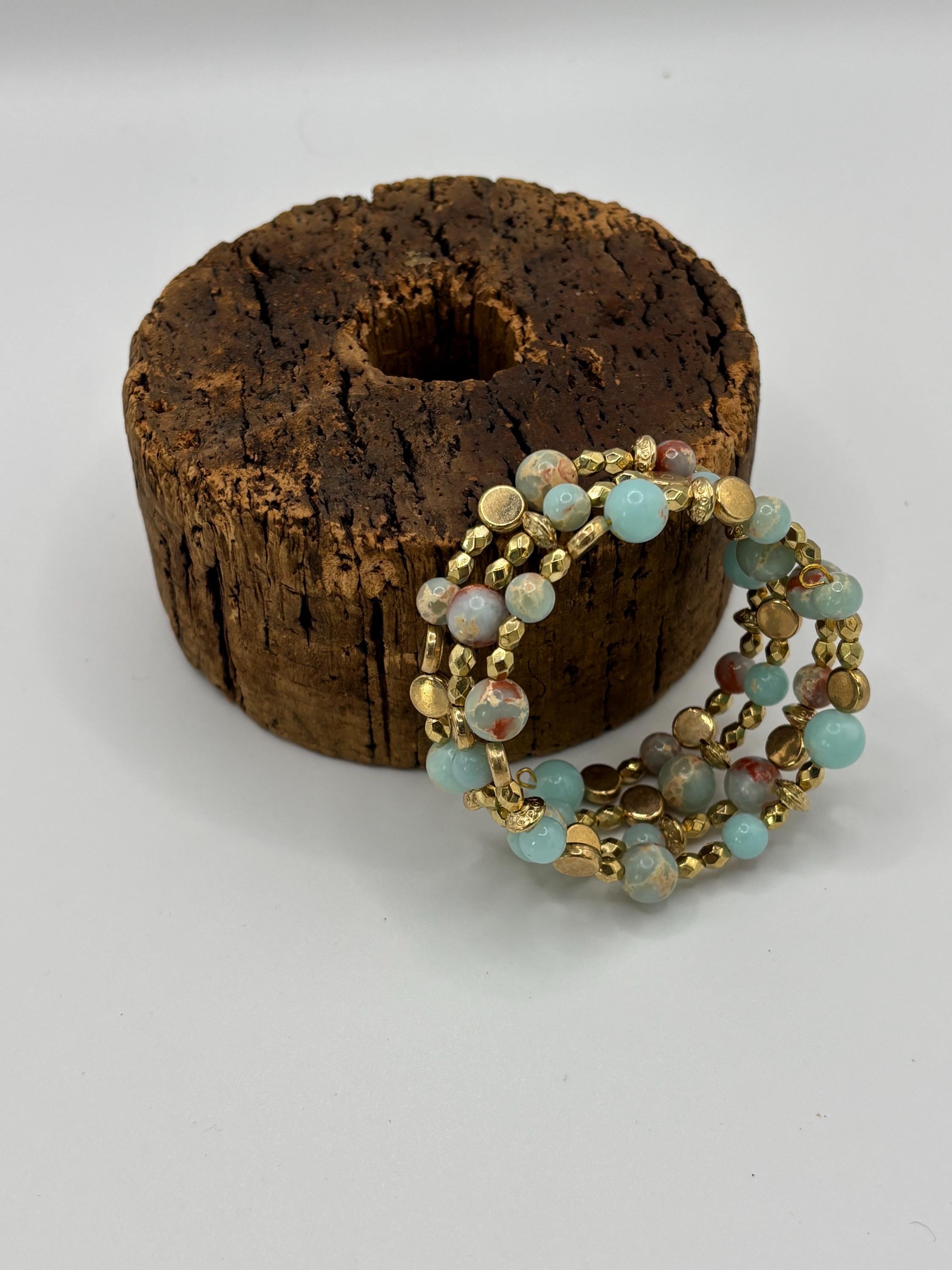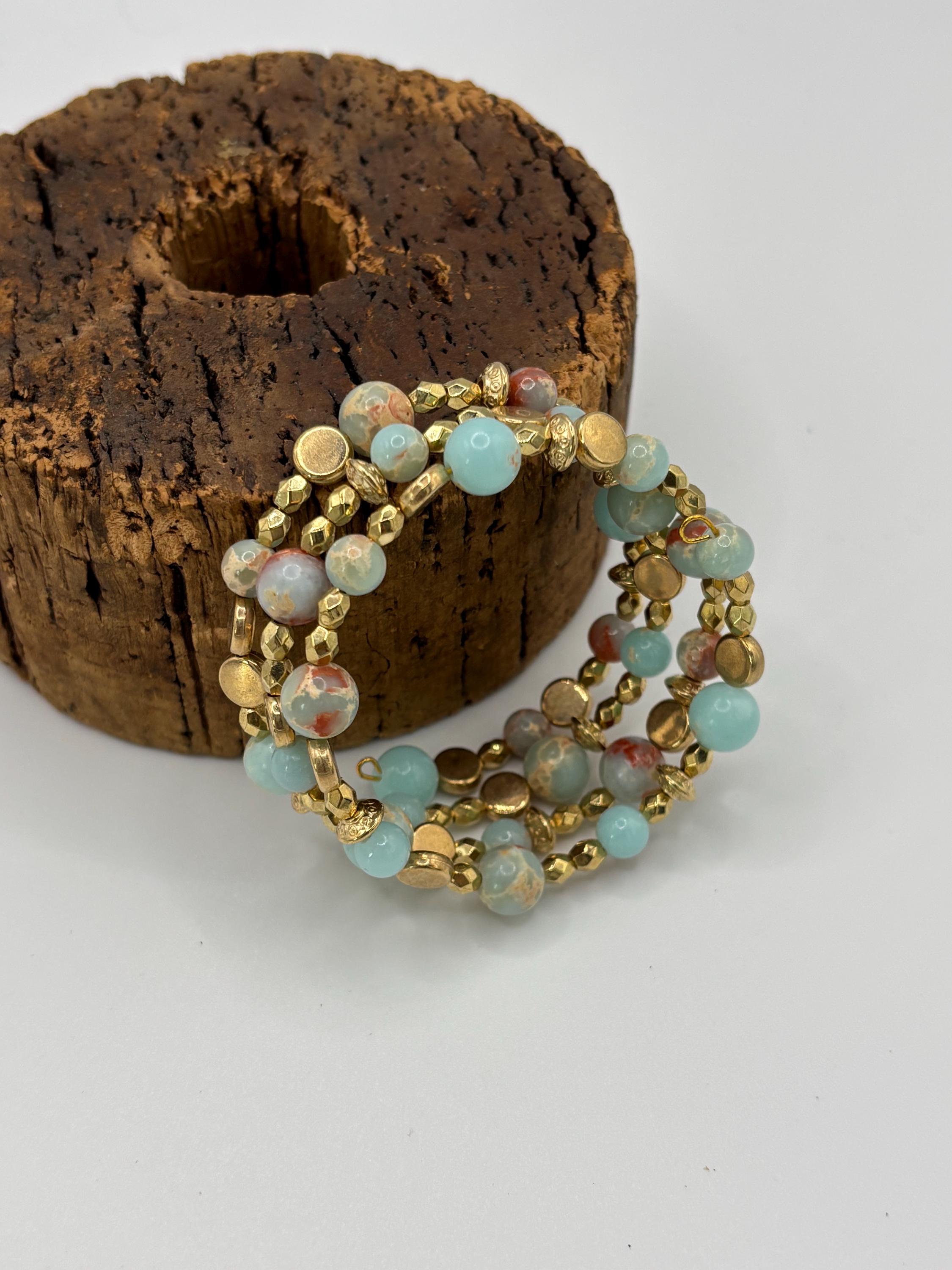 Add a touch of sophistication to your style with our elegant memory wire multistrand bracelet, made with Amazonite.