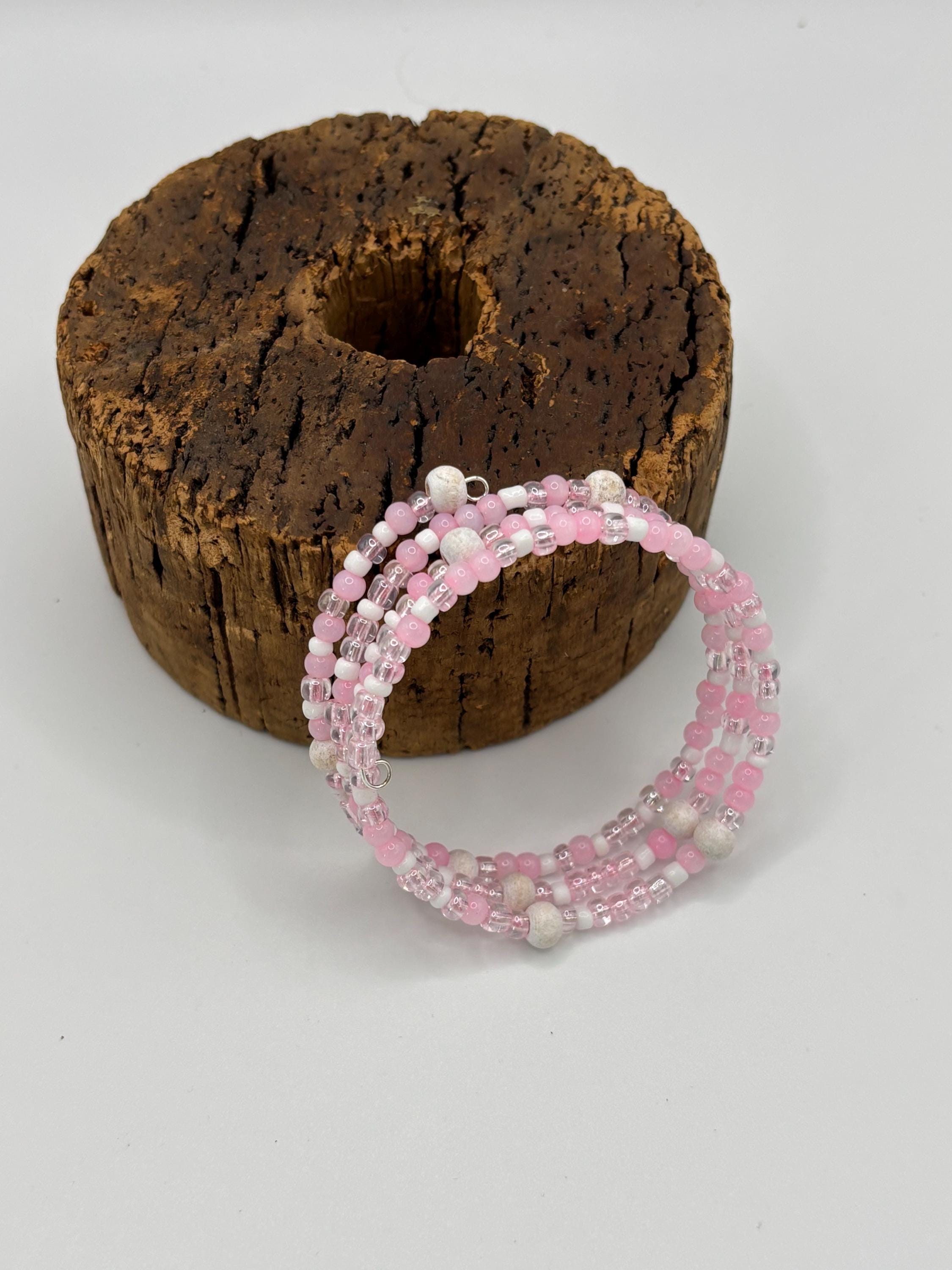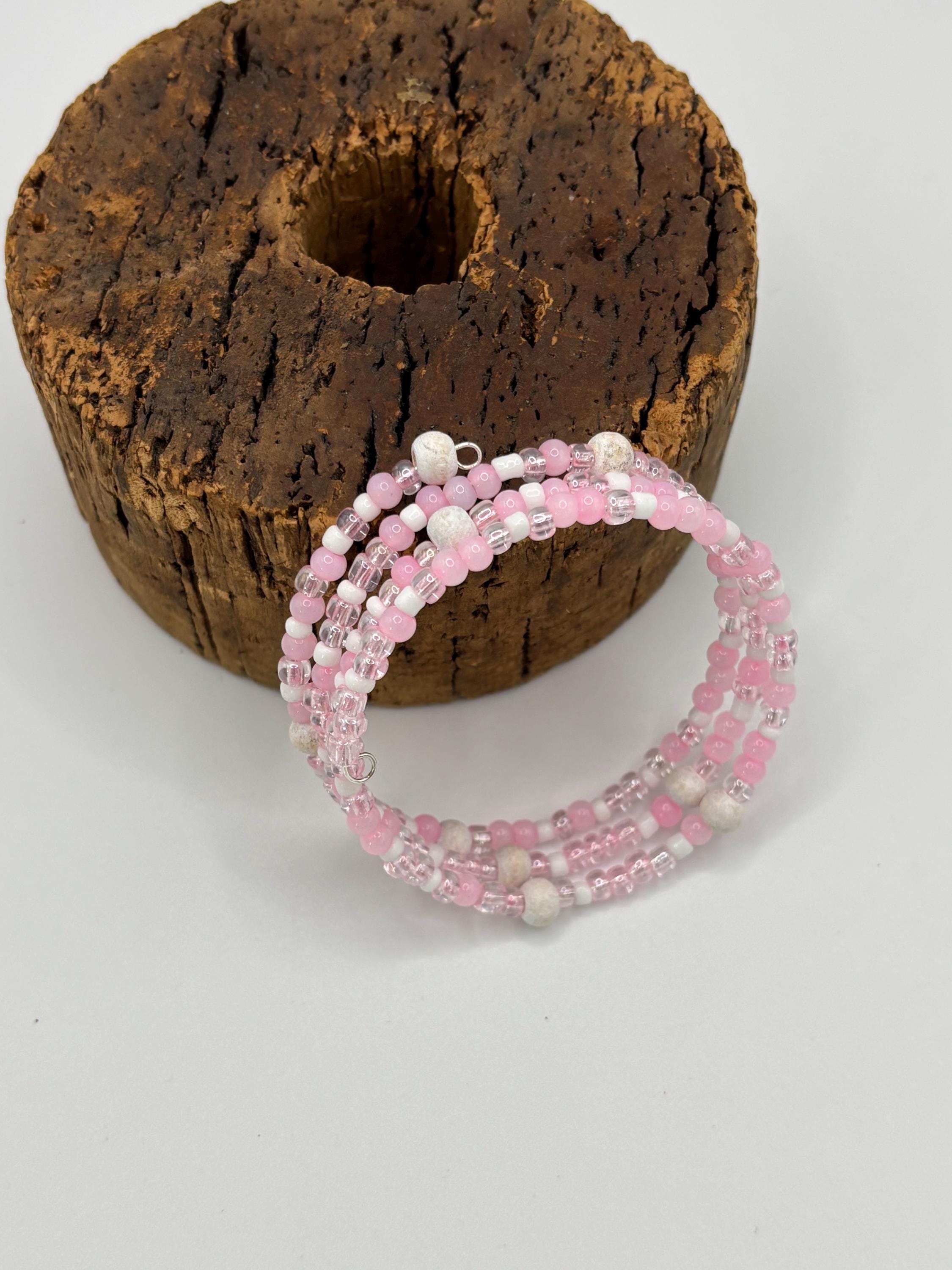 Add a touch of sophistication to your style with our pink cats eye and white wooden bead memory wire multistrand bracelet.