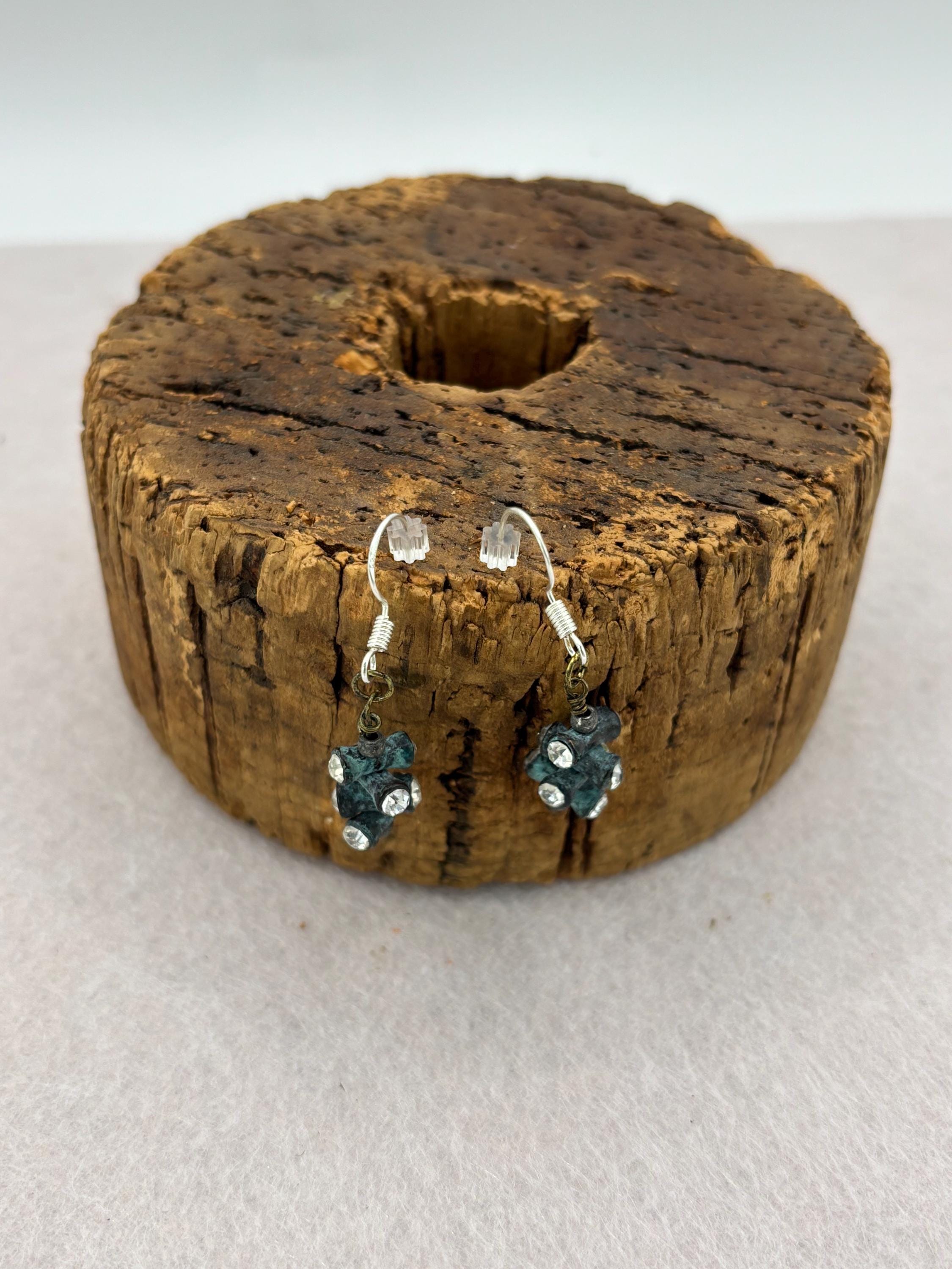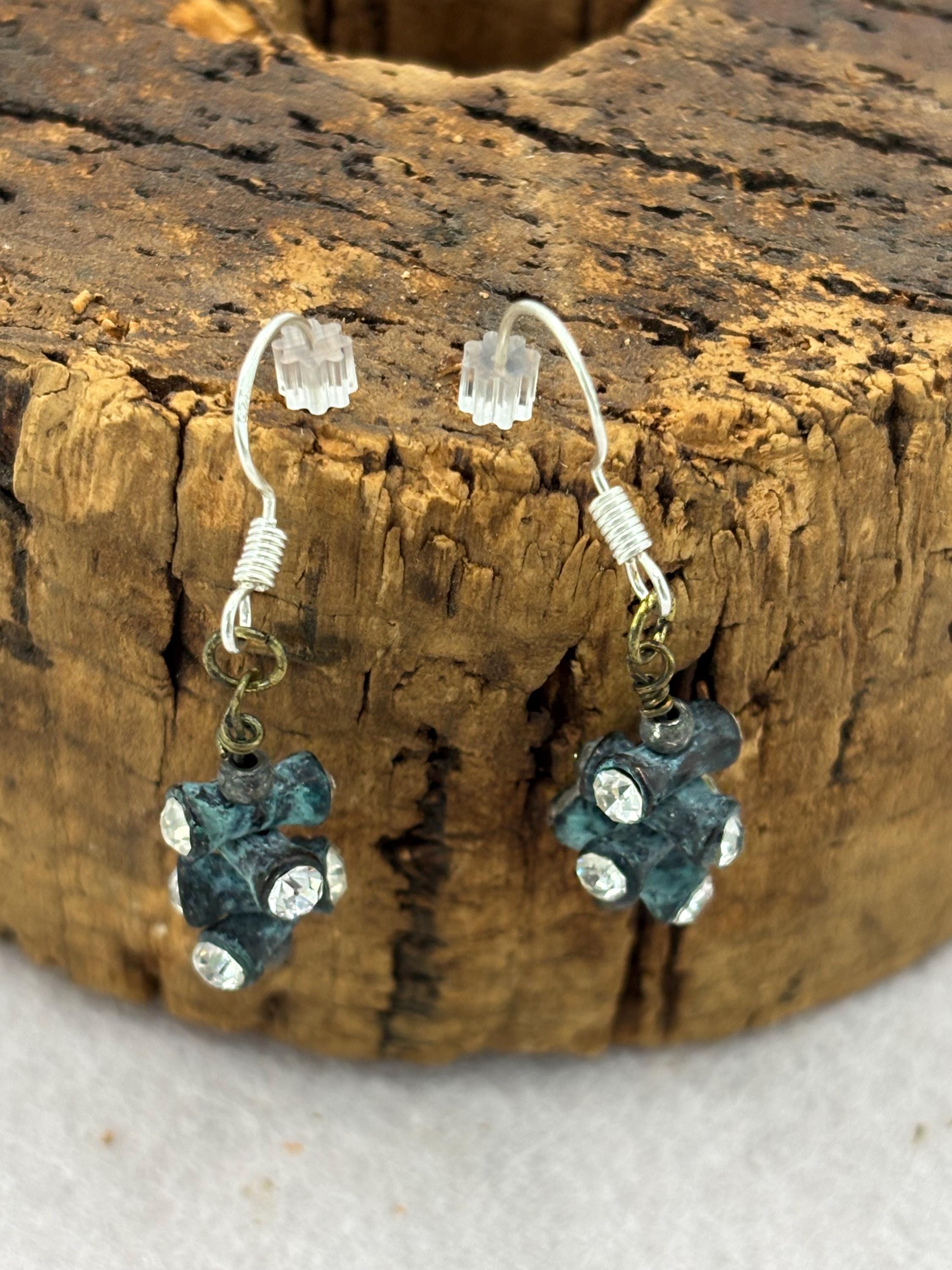These earrings are made with a vintage look that includes metal and crystals. They are on silver ear wires