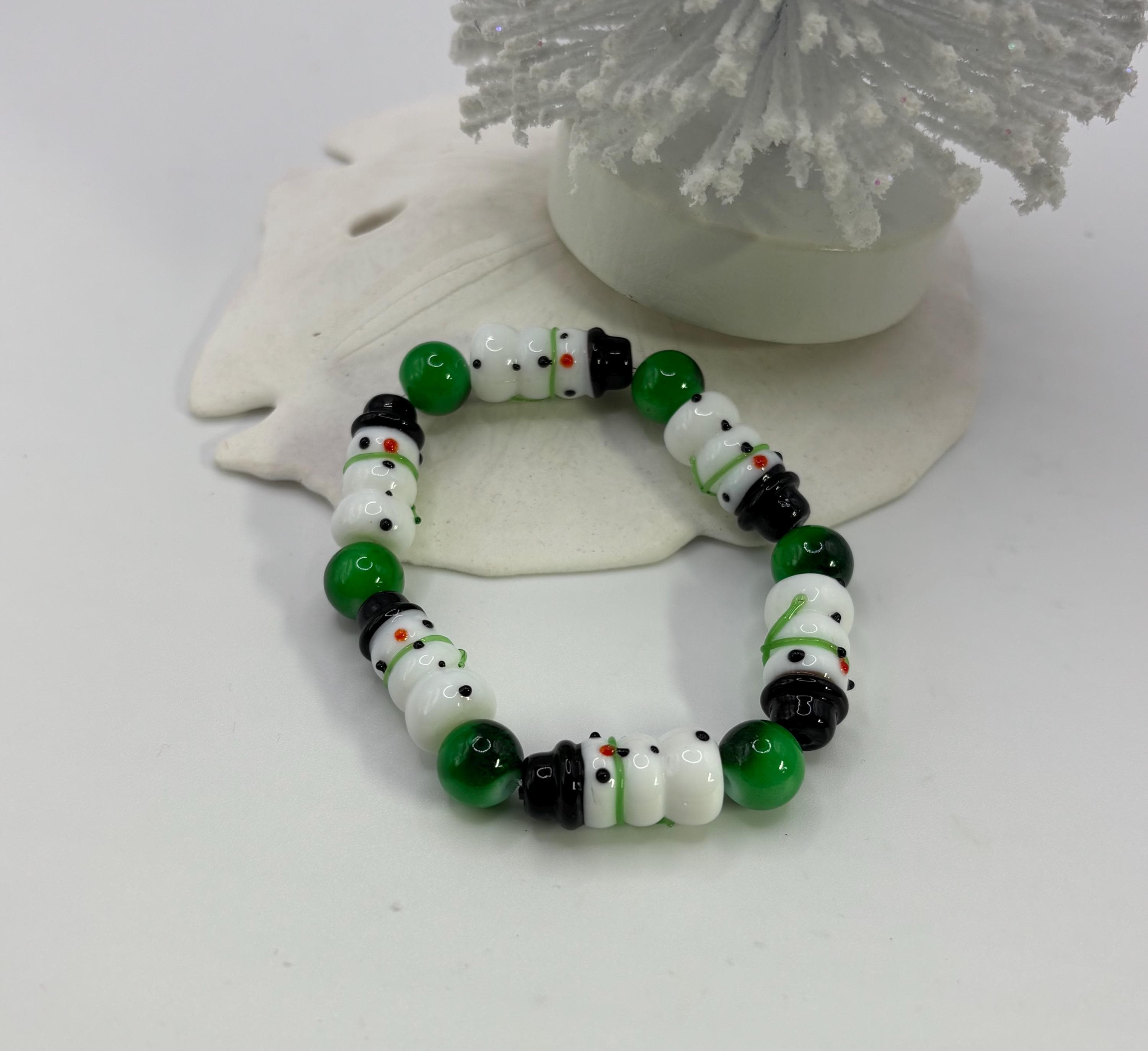 Bracelet has lampwork snowmen .