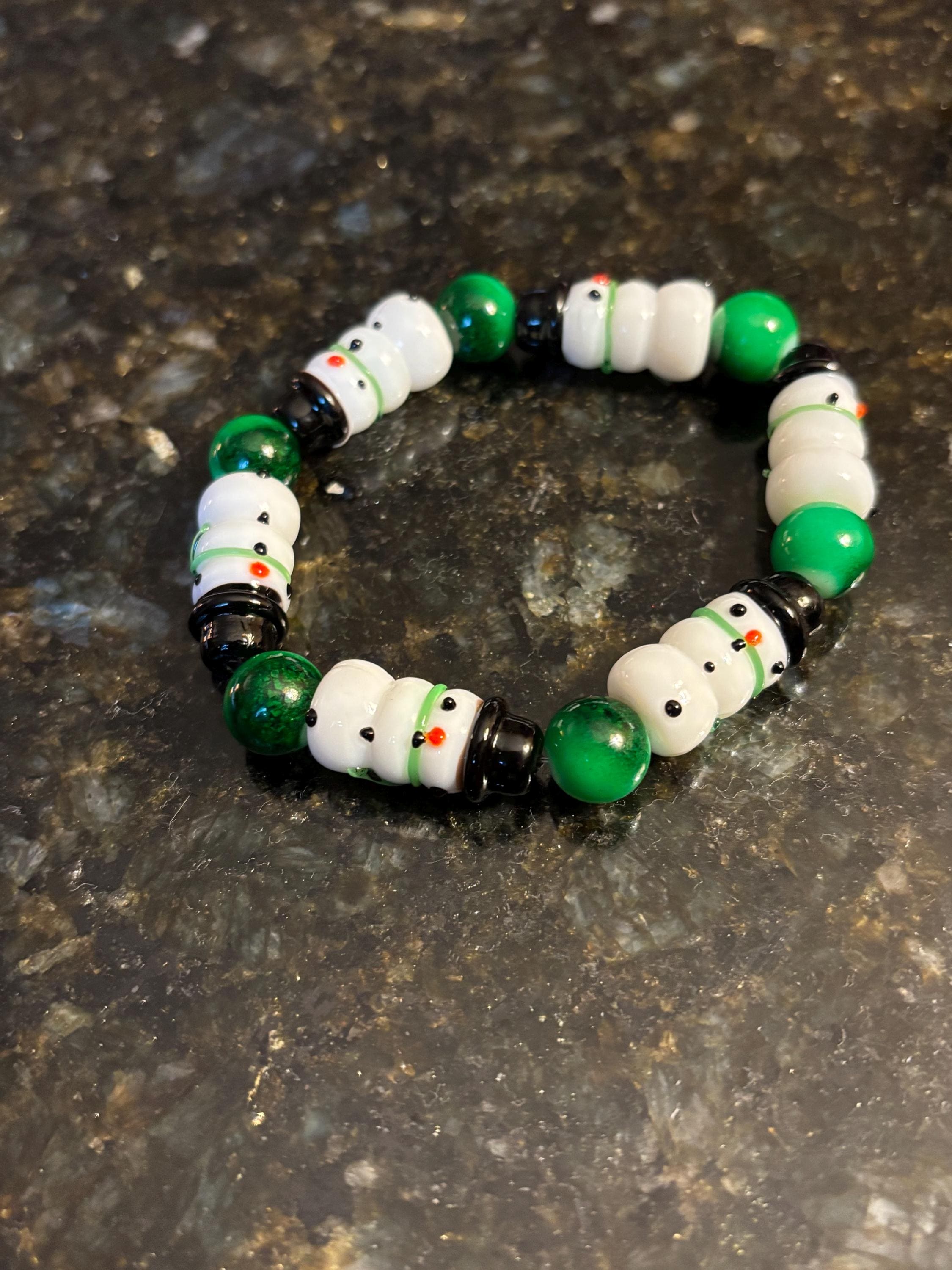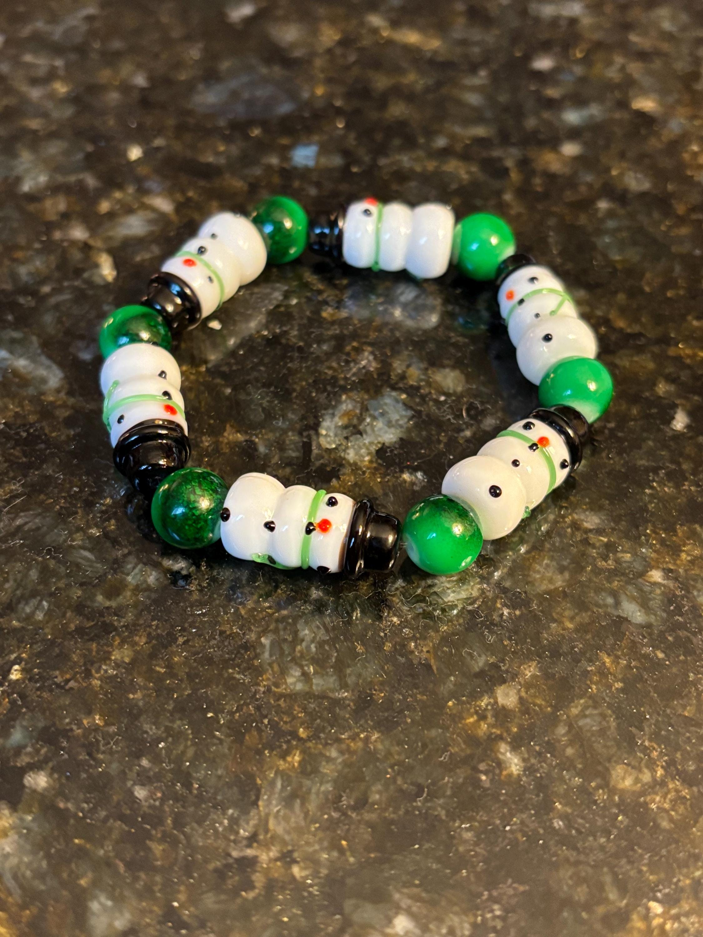 This is a lamp work glass bracelet , single strand stretch bracelet. Its giving Christmas vibes and Holiday cheer.