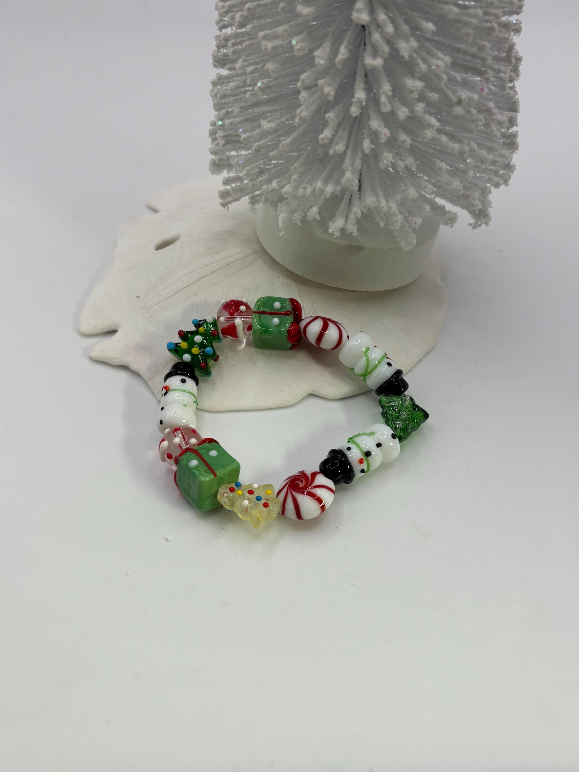 This is a lamp work glass bracelet , single strand stretch bracelet. Its giving Christmas vibes and Holiday cheer.