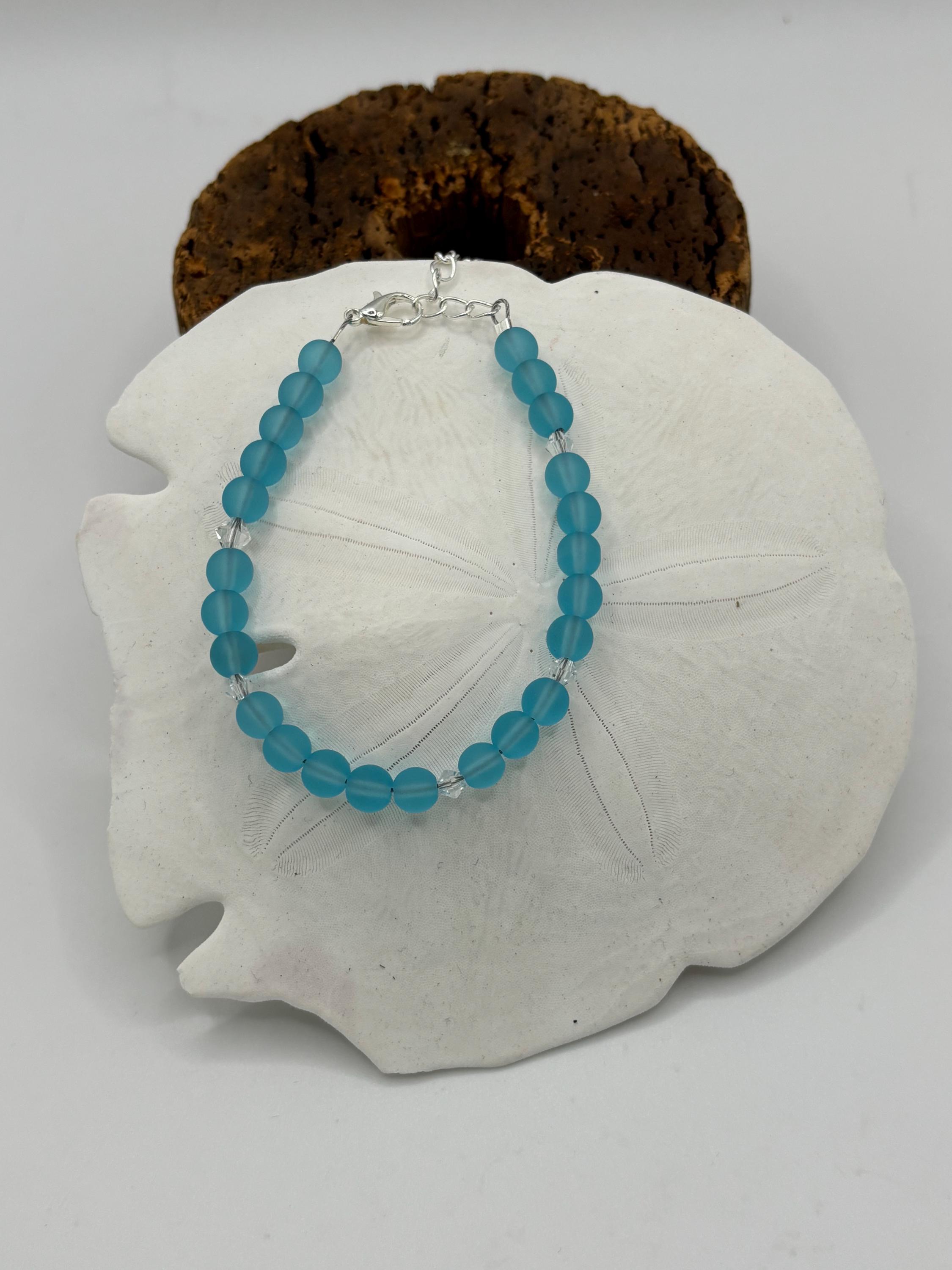 Turquoise Blue Seaglass Bracelet | Blue Seaglass | Seaglass Bracelet | 6 mm beads with Swarovski Crystals
