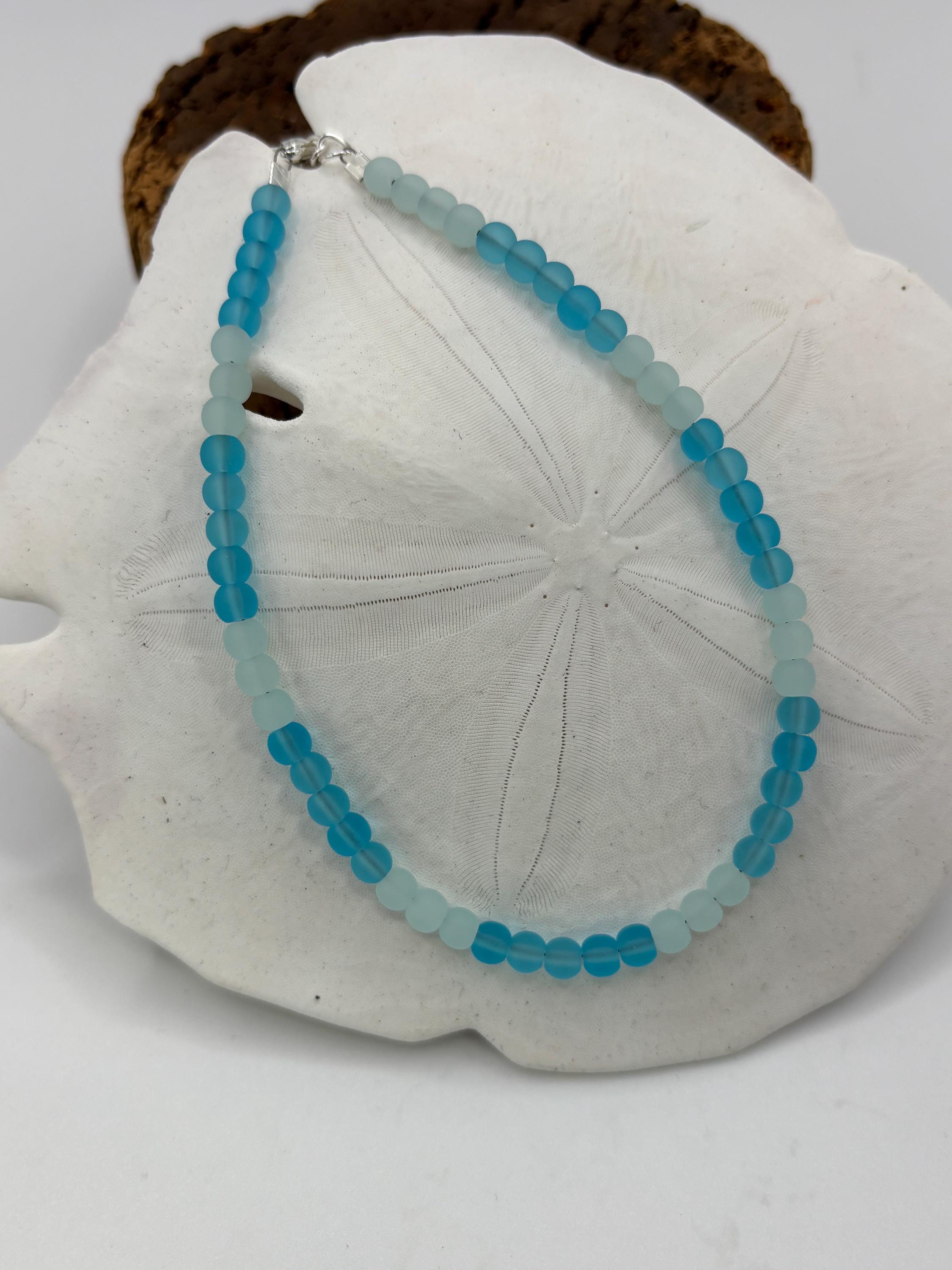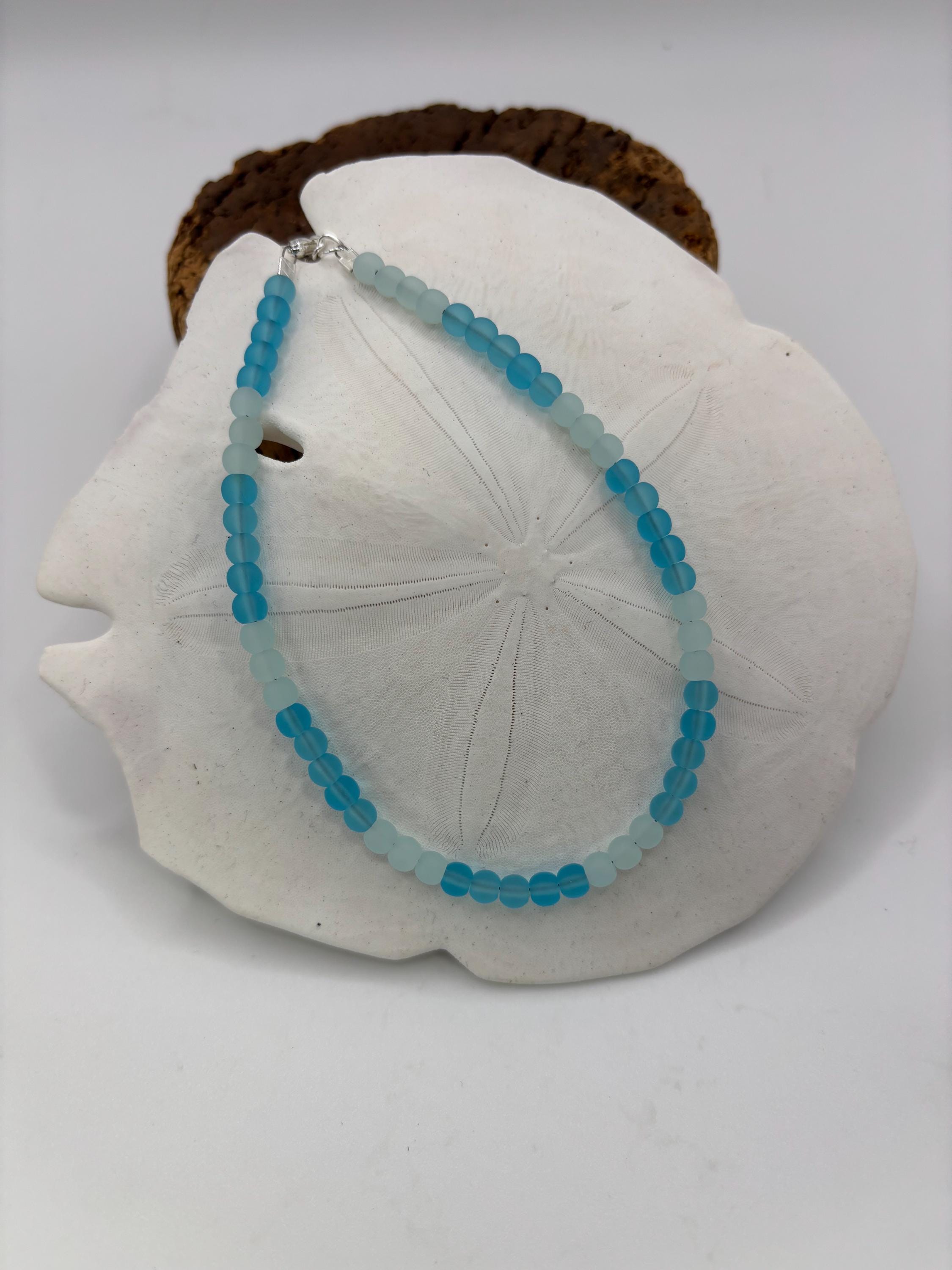 This beautiful Seaglass ankle bracelet is made with small rounds in turquoise blue and pale blue Seaglass.