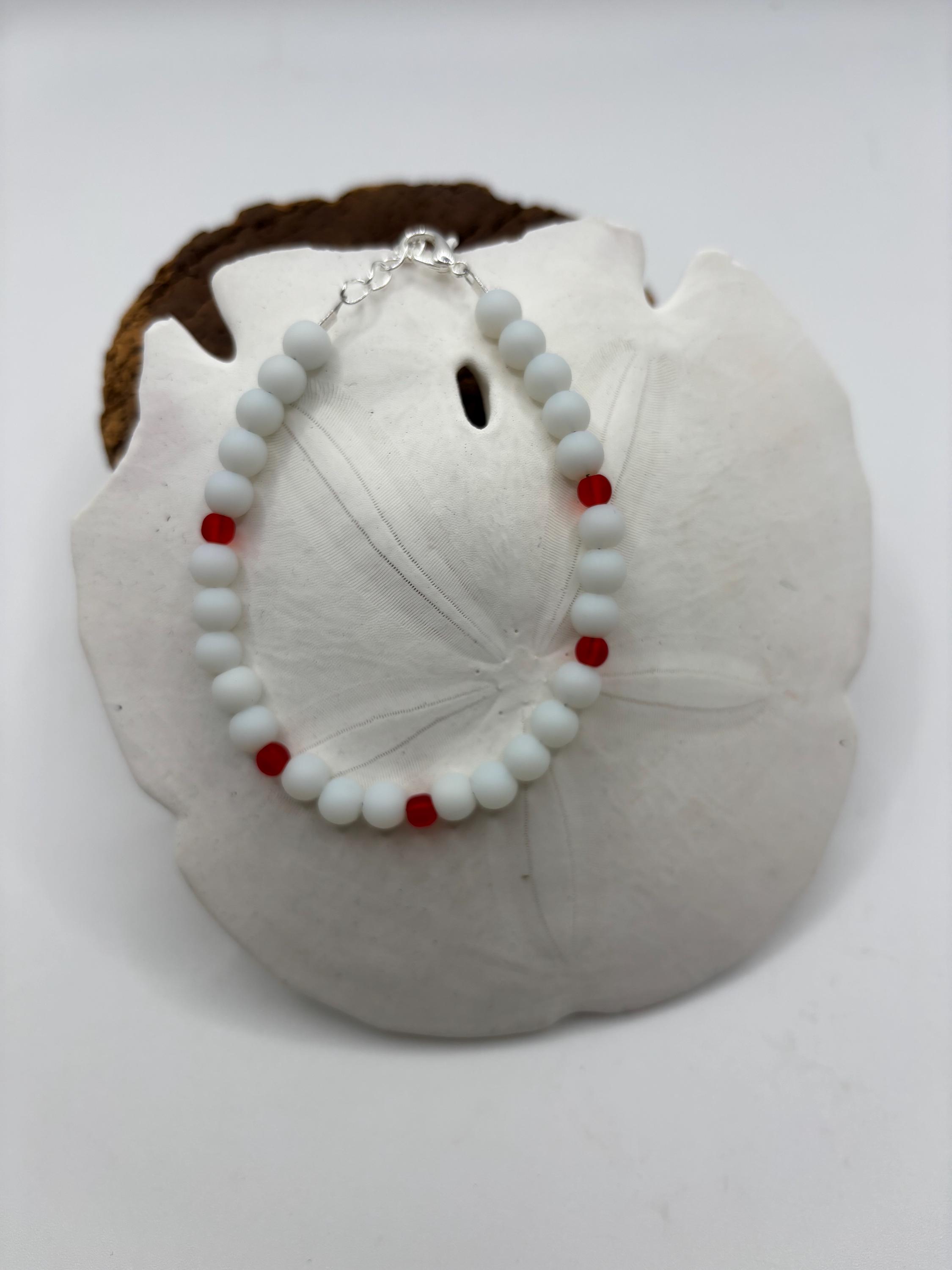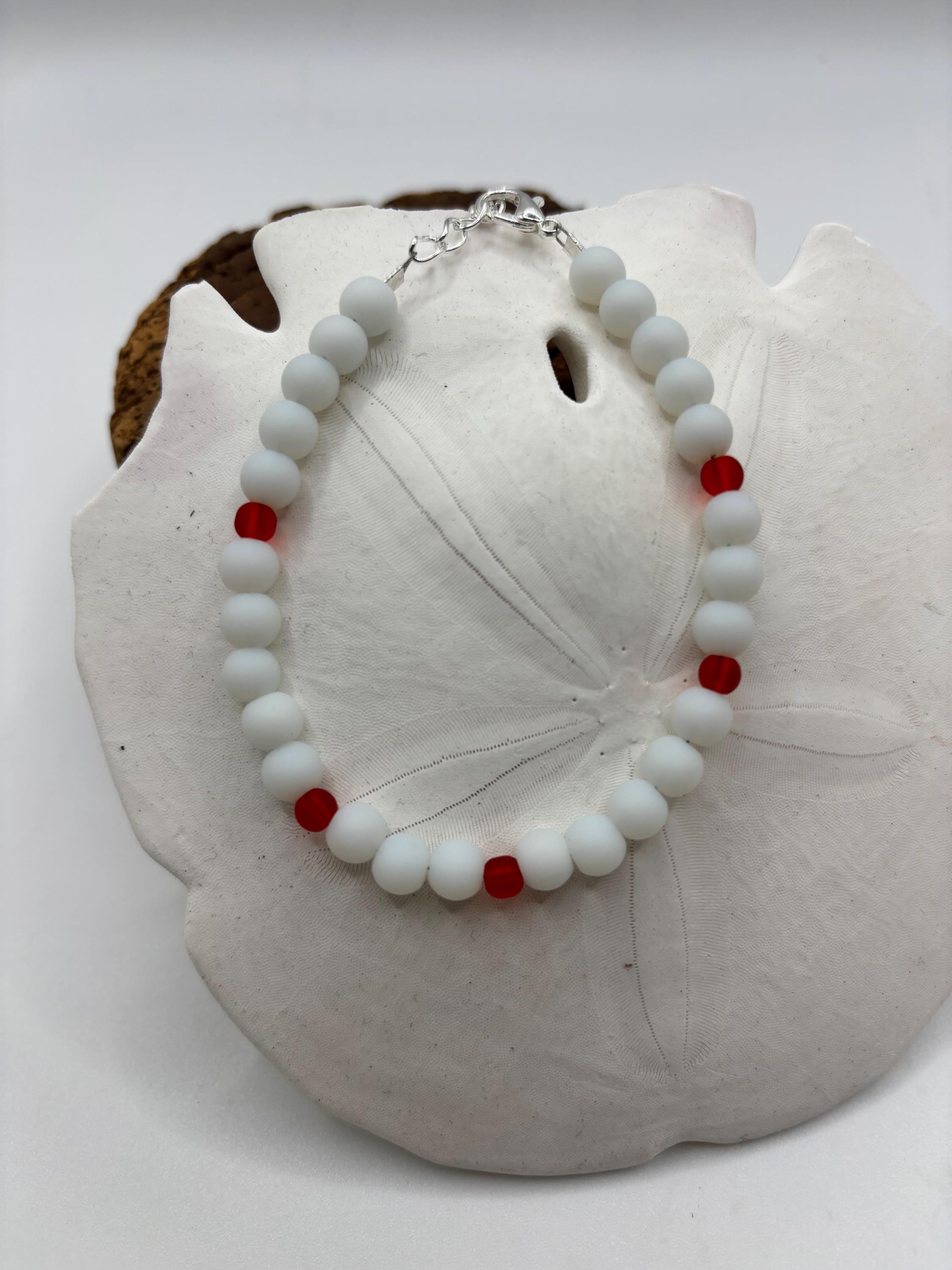 This beautiful Seaglass bracelet is made with white Seaglass and red Seaglass accent beads.