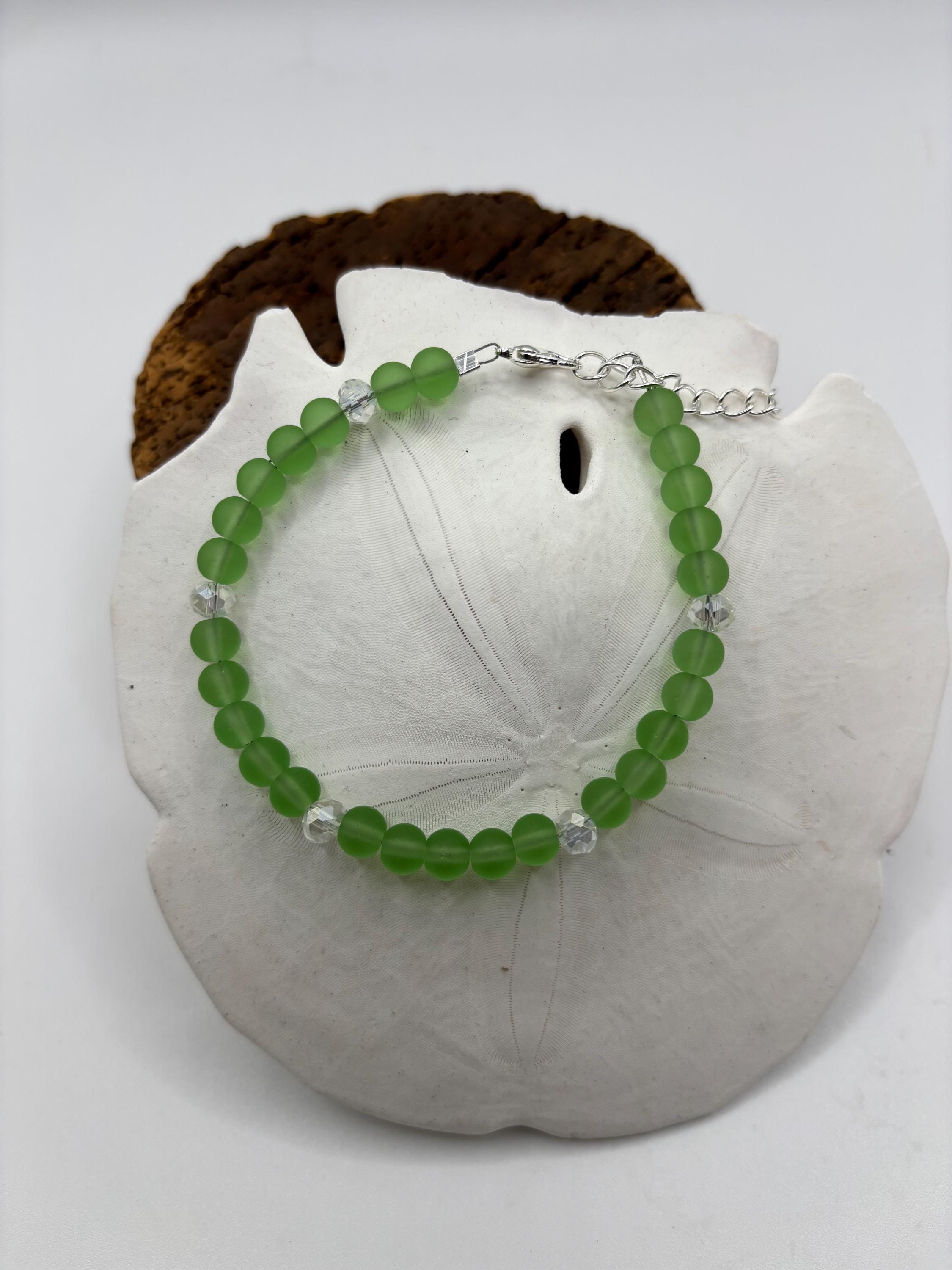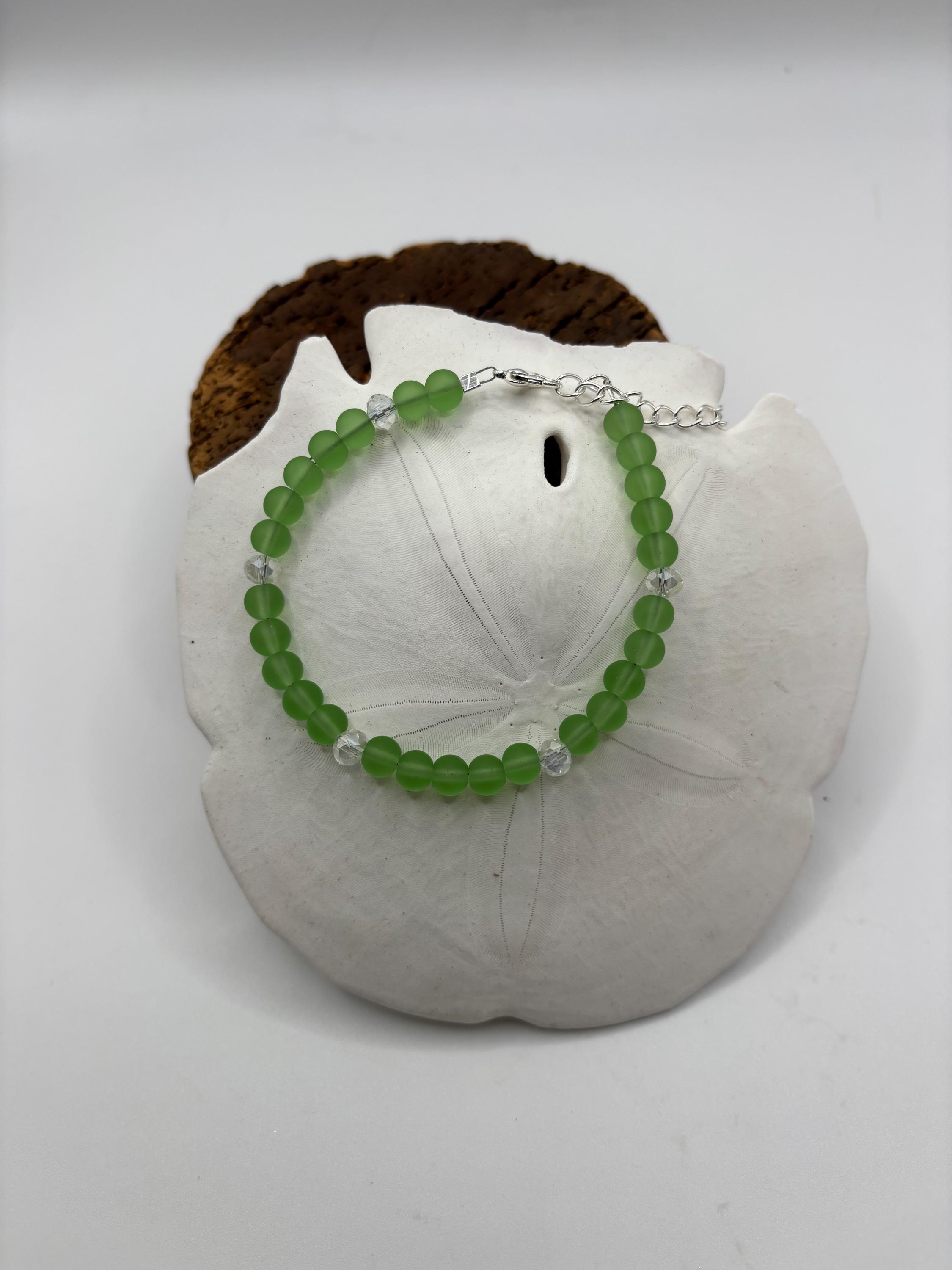 This beautiful Seaglass bracelet is made with green Colored Seaglass. It is accented with crystals.