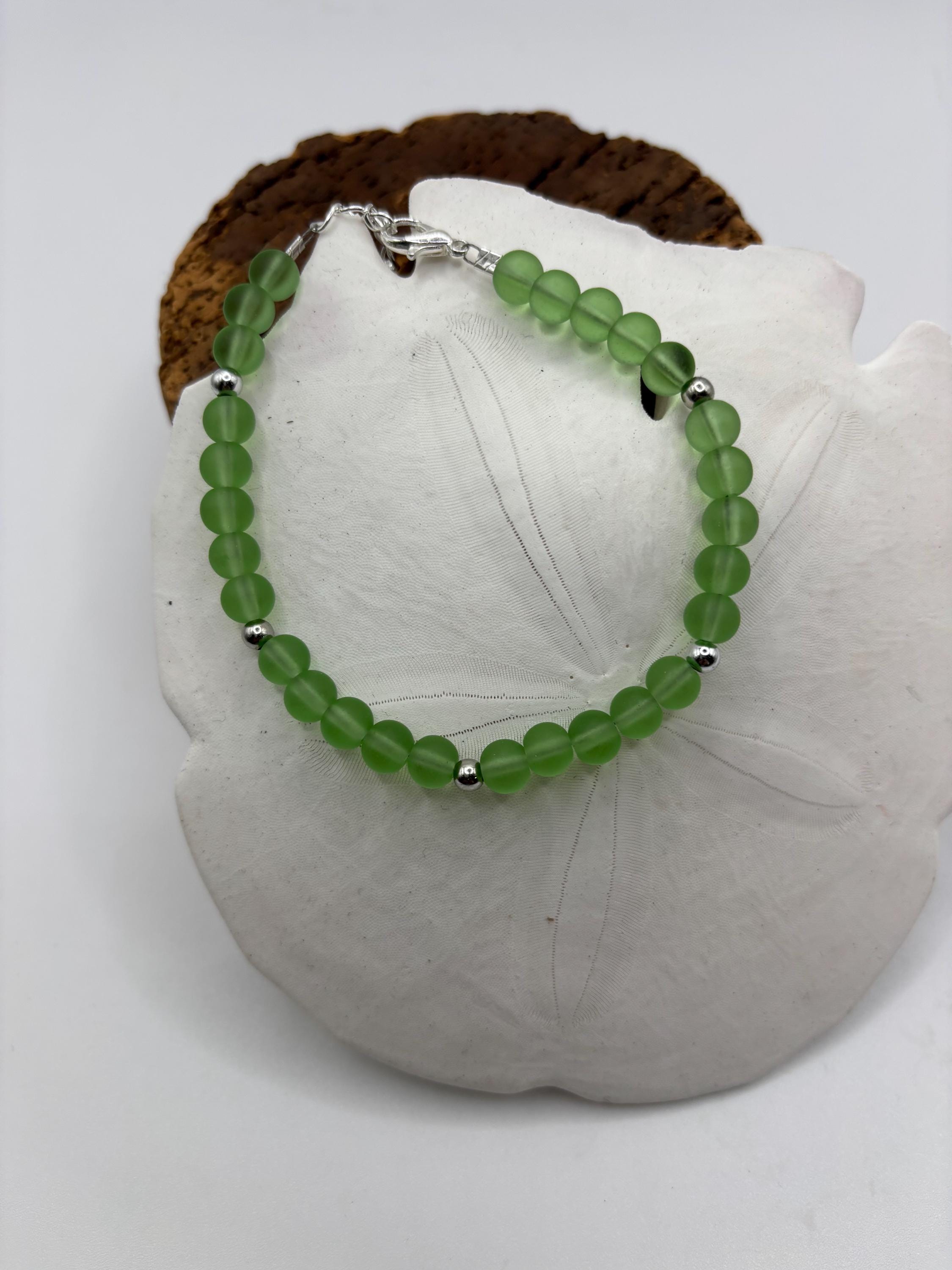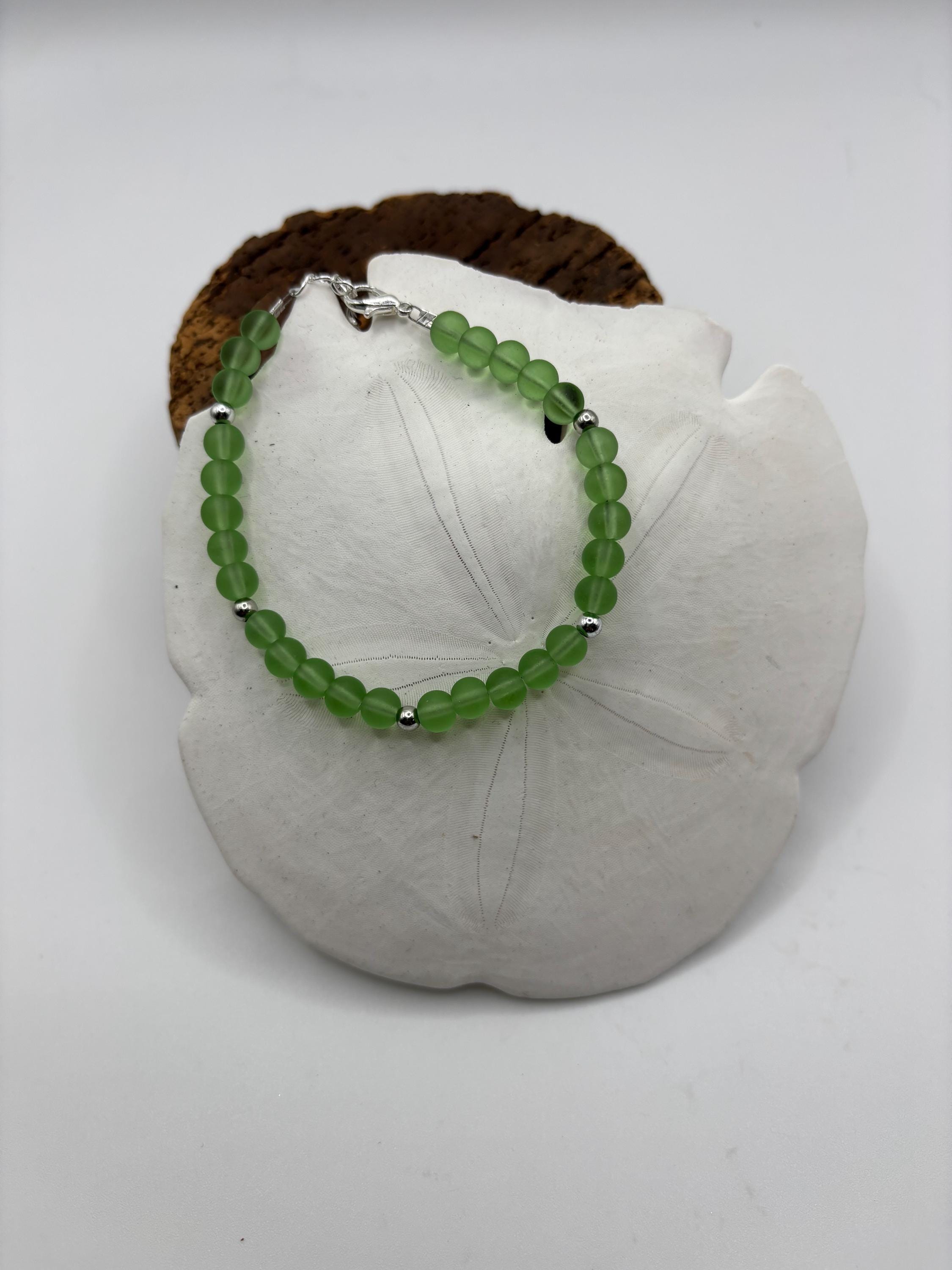 This beautiful Seaglass bracelet is made with green Colored Seaglass. It is accented with silver beads.
