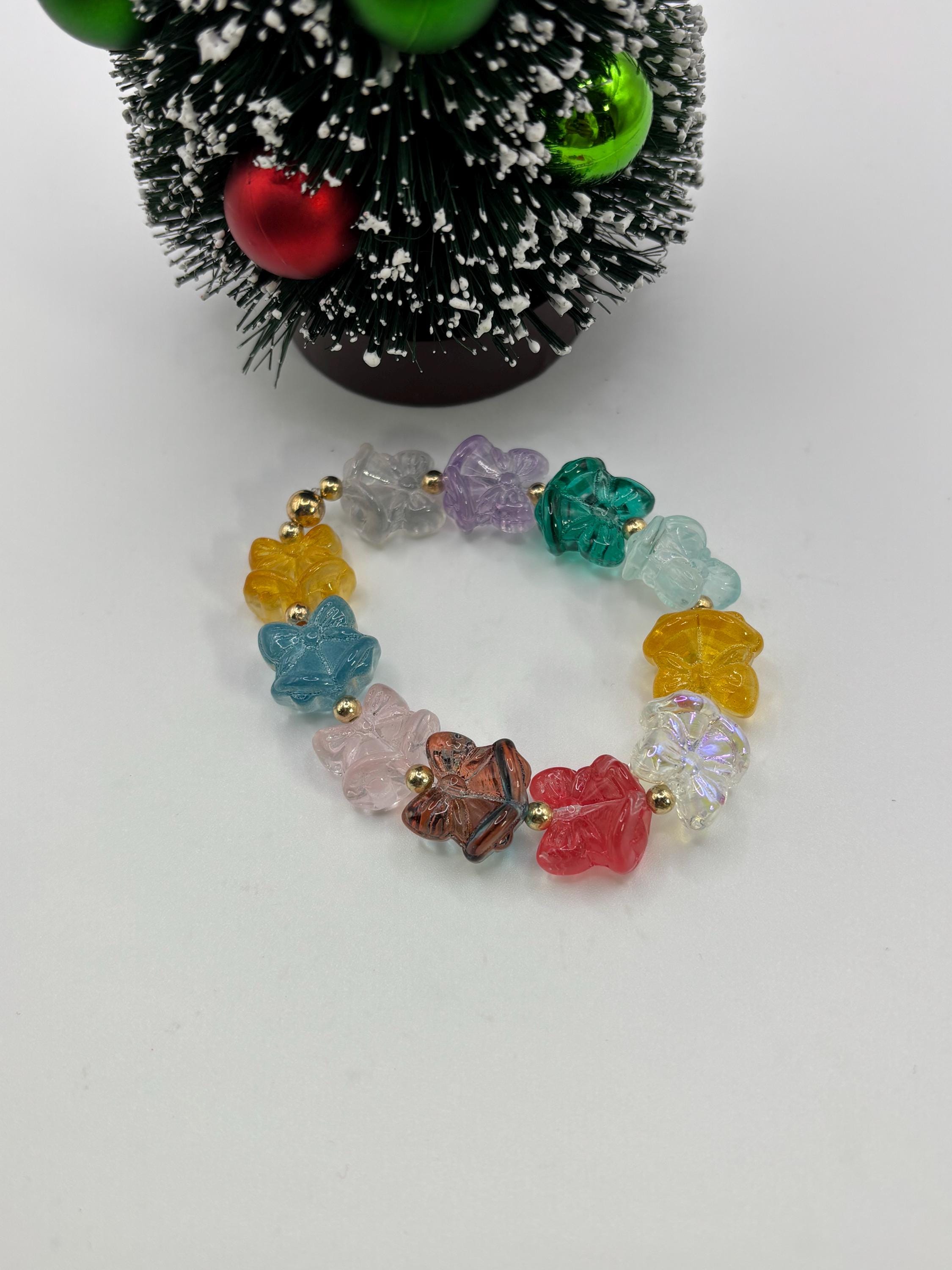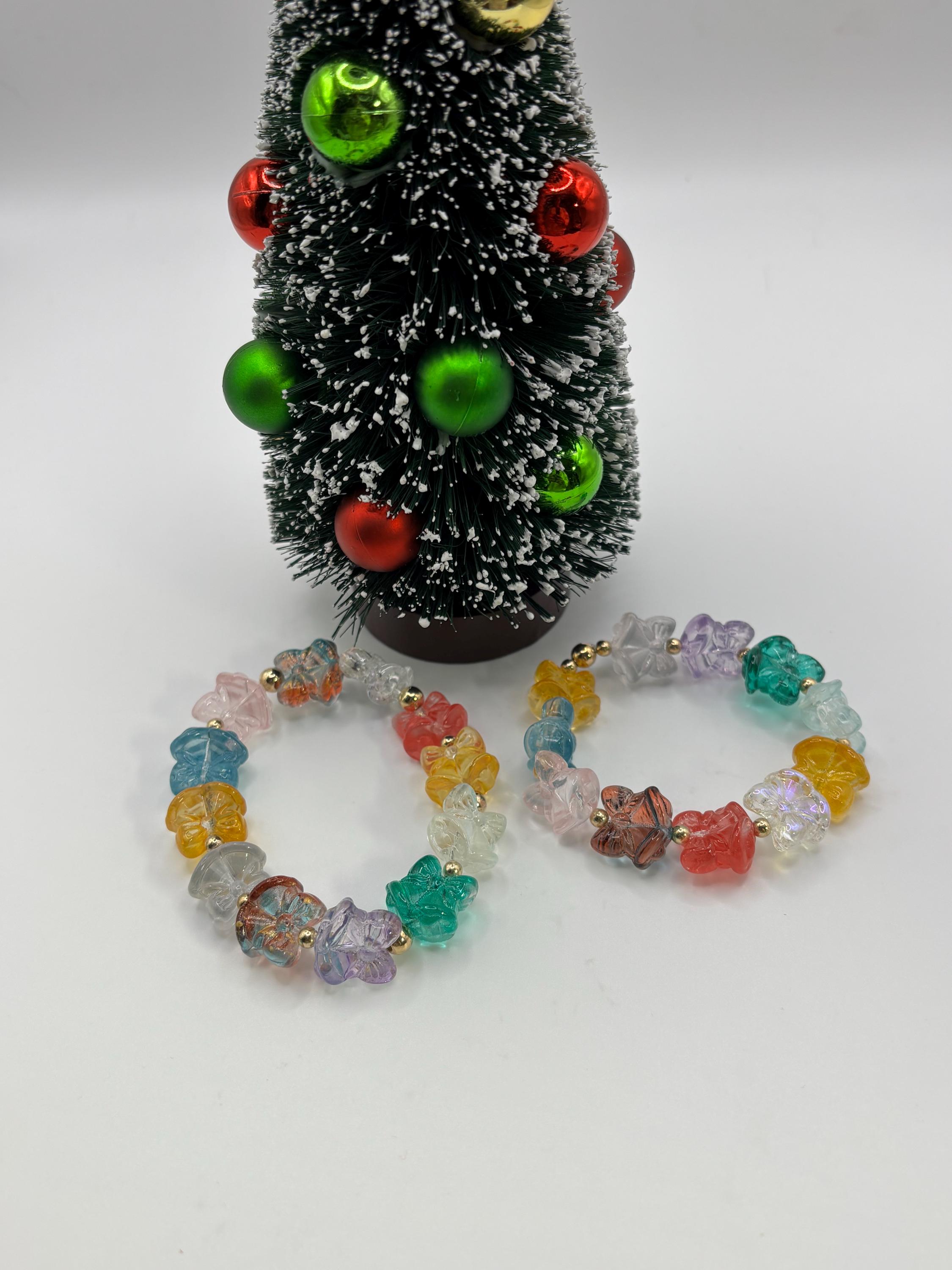 This is a lamp work glass bracelet , single strand stretch bracelet. Its giving Christmas vibes and Holiday cheer.