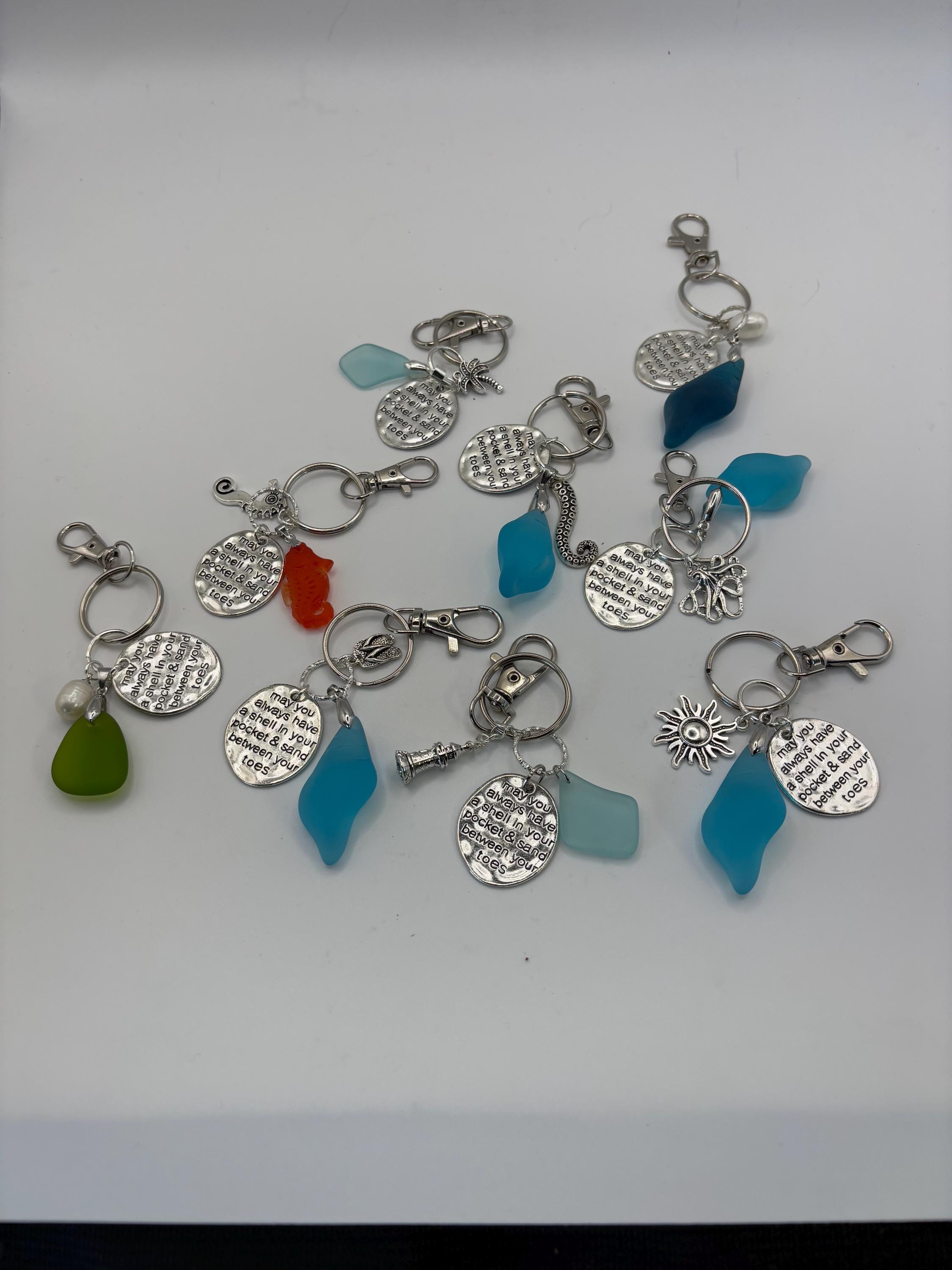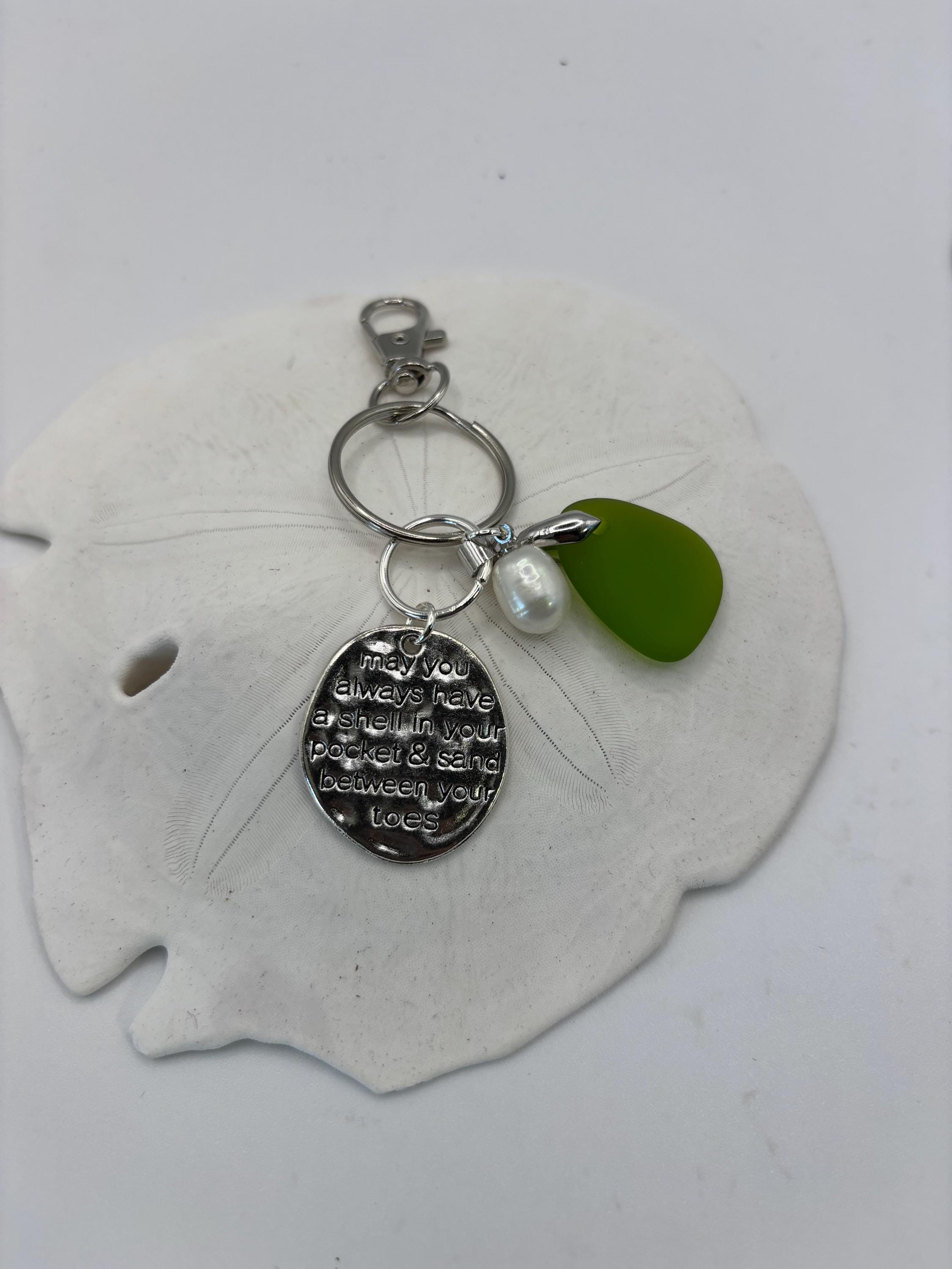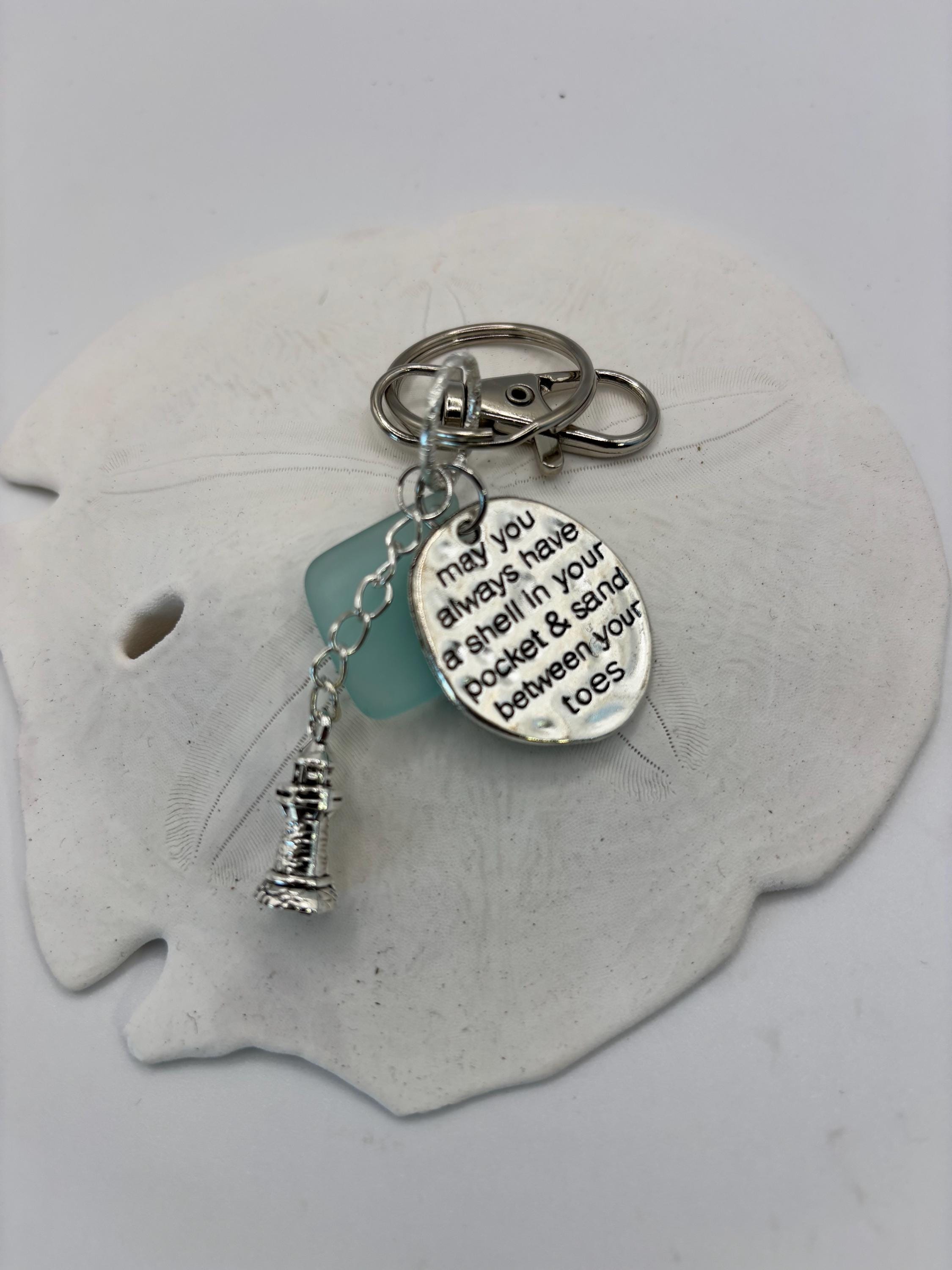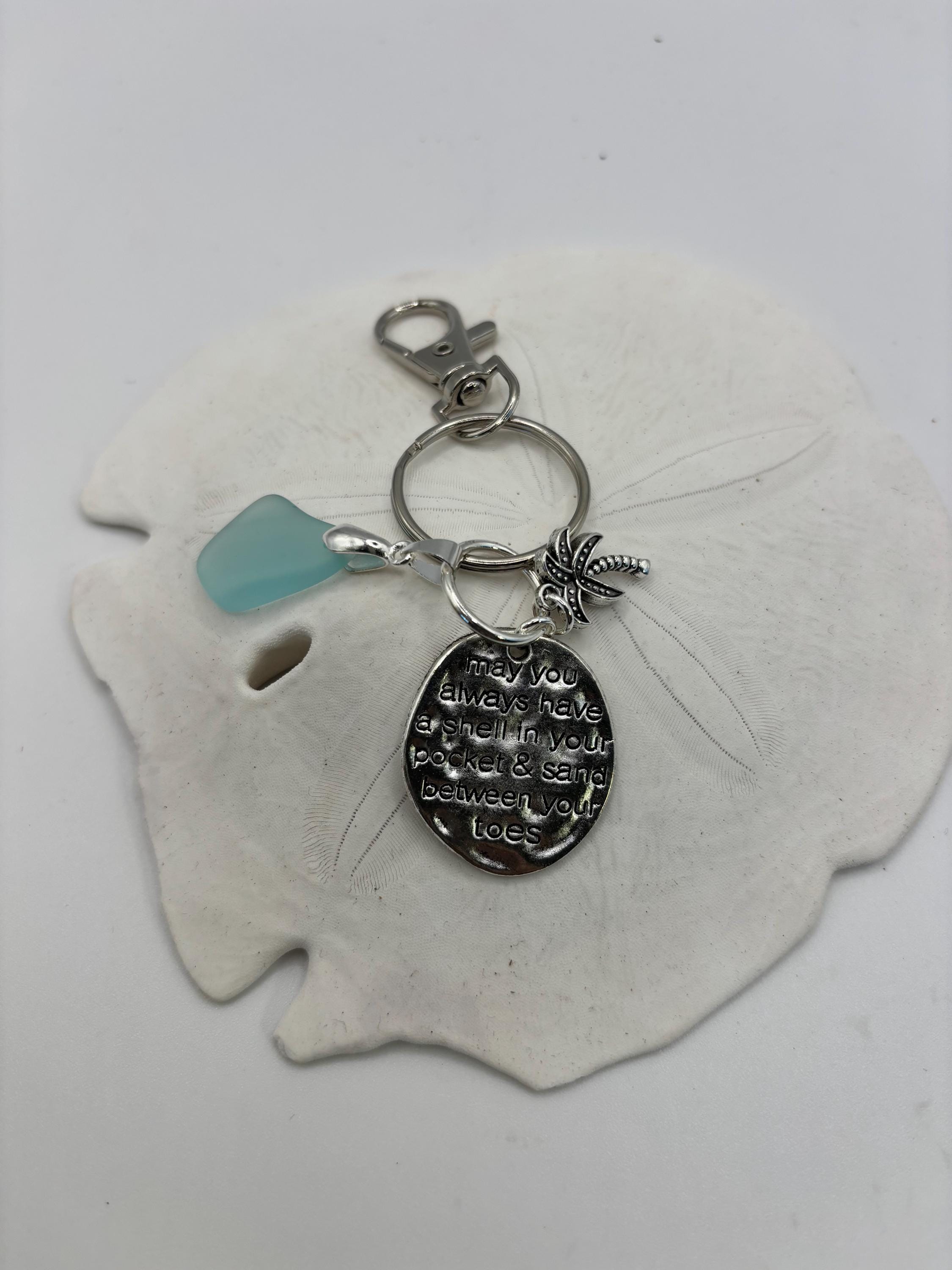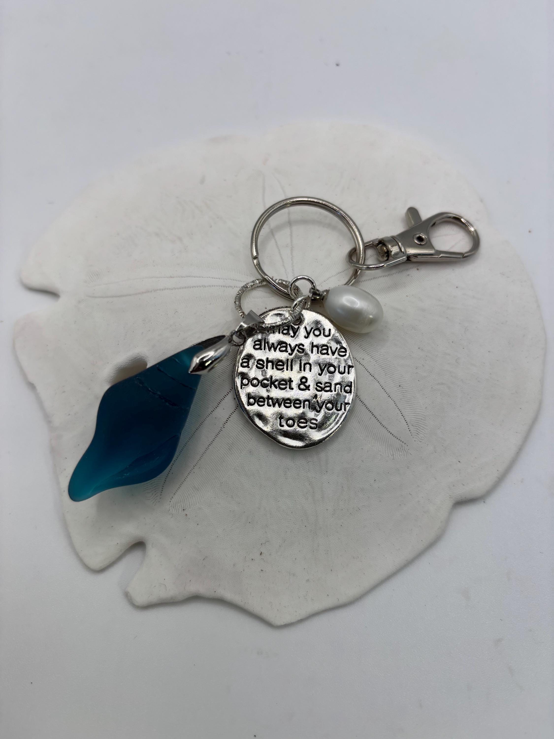 These pretty Seaglass keychains are a great gift for yourself or someone else ! Coastal Fun with a salt water charm, Seaglass and the quote charm “ May you always have a shell In your pocket and sand between your toes”.